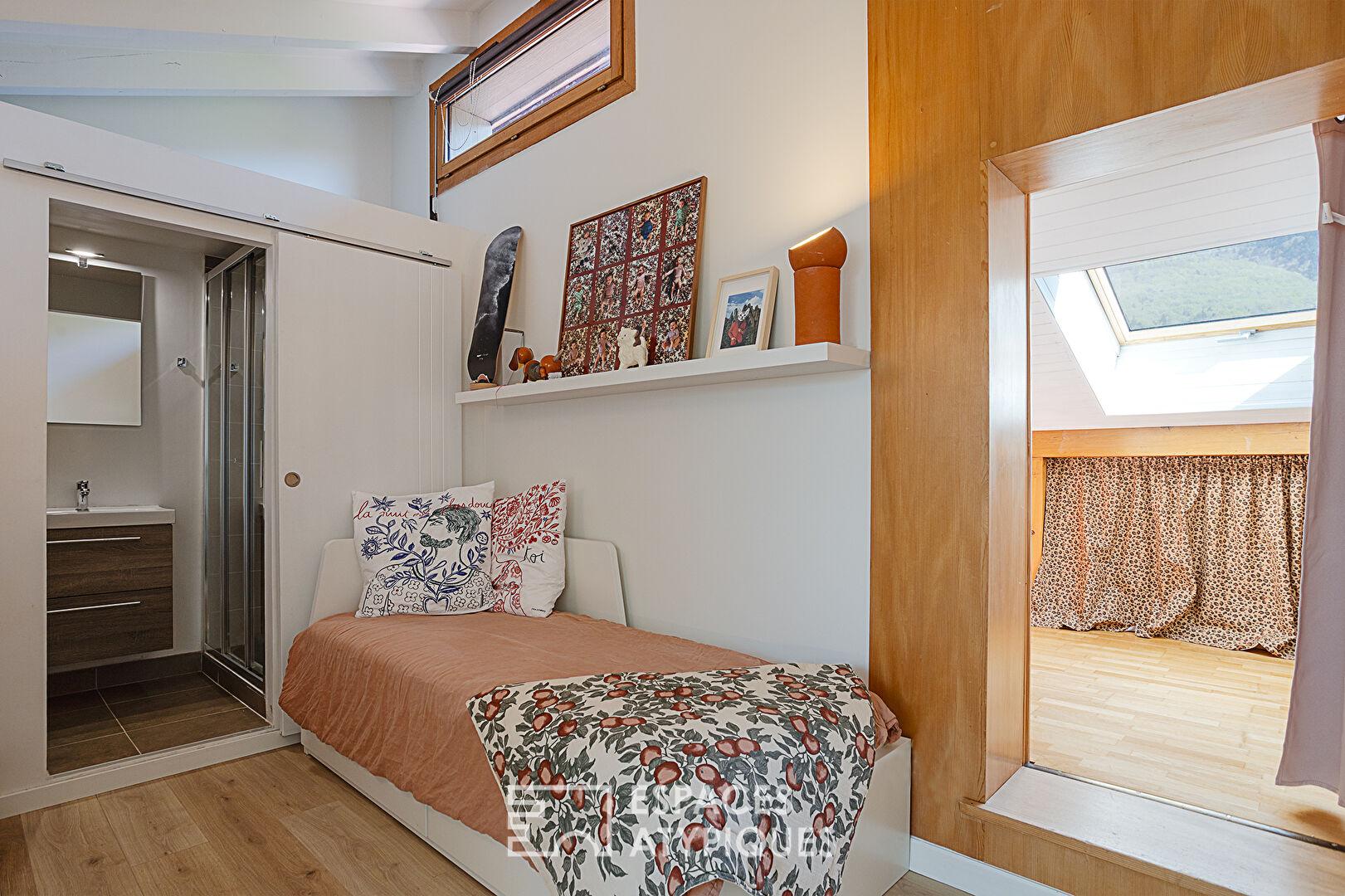 Ce premier niveau accueille également une belle chambre parentale, pensée comme un cocon intimiste, bénéficiant de rangements sur mesure, d’une salle d’eau avec douche à l’italienne privative et d’un balcon avec buanderie.