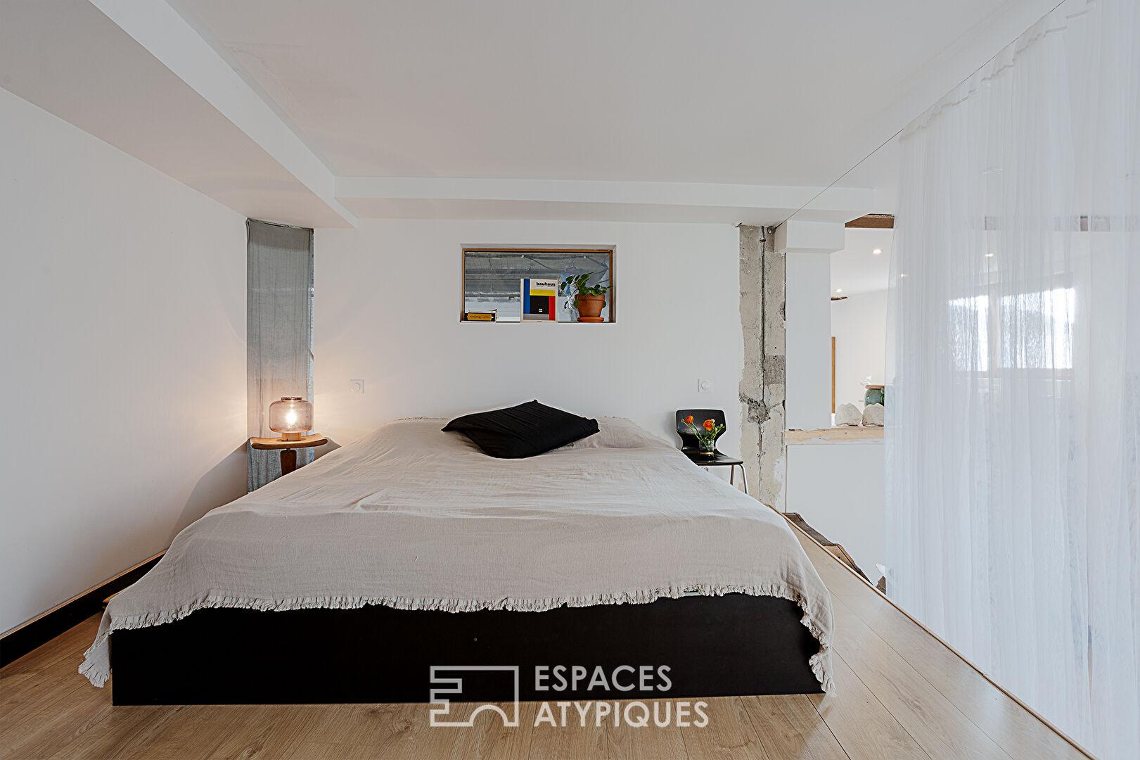 Dans le prolongement du salon, la bibliothèque fait office de trait d’union vers l’espace nuit. Celui-ci propose une surface polyvalente pouvant faire office de bureau ou de couchage et une chambre en mezzanine accessible par un authentique escabeau de bois détourné. Une salle d’eau avec douche à l’italienne, intégré dans un volume cubique, avec accès direct à l’atelier complète cette partie.