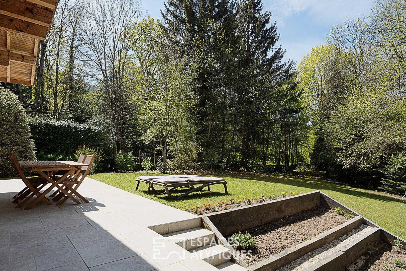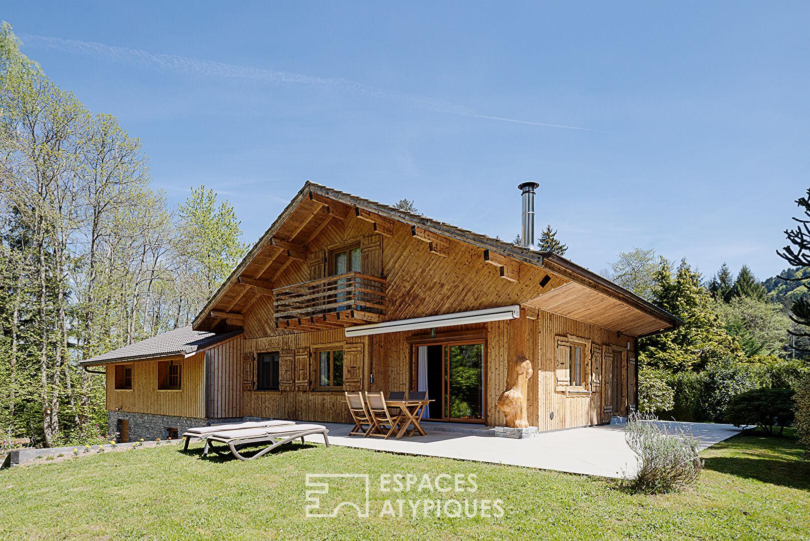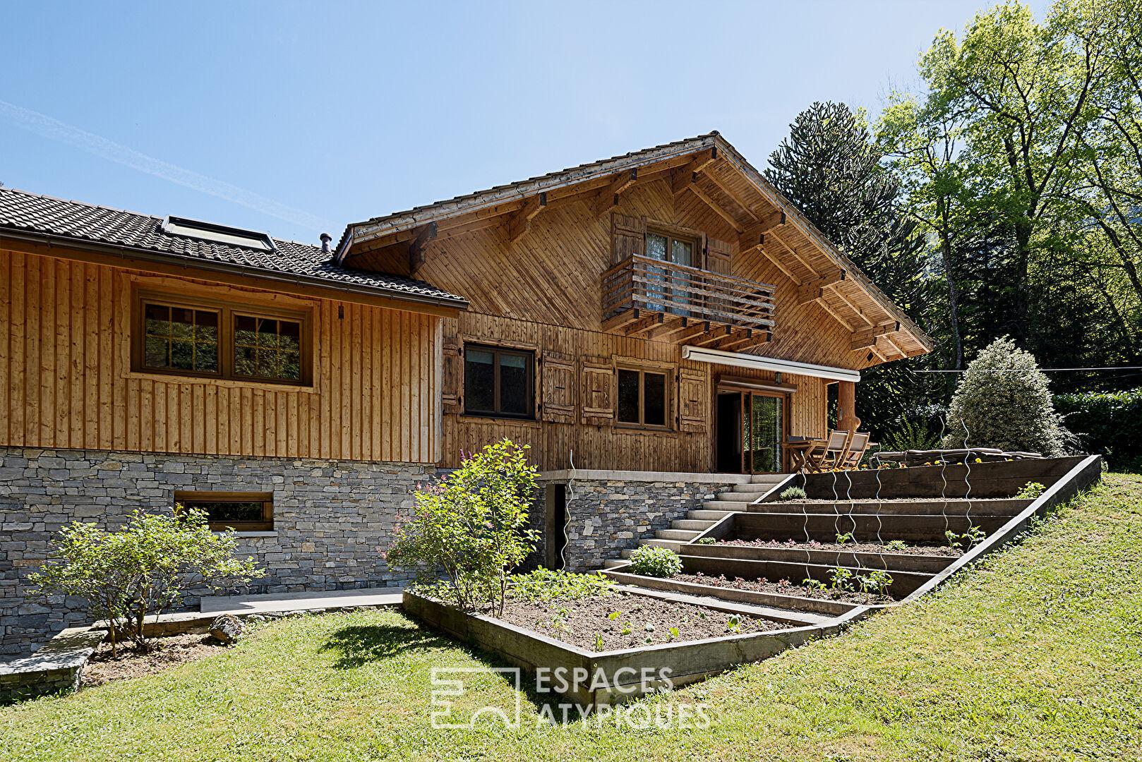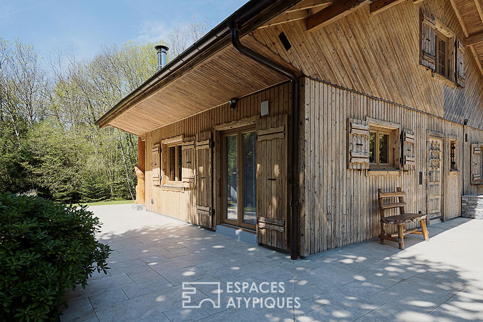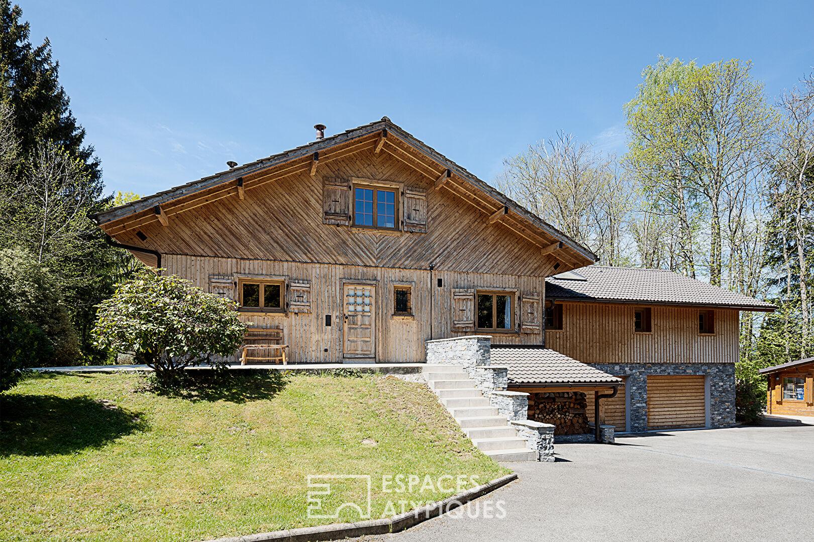 À Bons-en-Chablais, à seulement 40 minutes de Genève et 5 minutes du CEVA, ce chalet de 218.45m² habitables sur 316.73m² utiles mêle avec élégance l’ambiance cosy traditionnelle d’un chalet de montagne à la modernité et le confort d’un habitat contemporain. Implantée au coeur d’un parc clos et boisé de 5 100 m², cette propriété rare joue la carte de l’immersion totale dans la nature tout en affichant un design moderne affirmé.