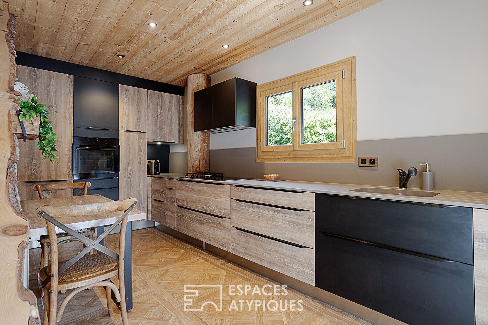 La pièce de vie principale rend hommage à la construction traditionnelle en fuste avec trois pièces d’ornement élégamment positionnées. Les murs en vieux bois massif, associés à une cheminée à insert, créent un volume chaleureux qui évite l’écueil du rustique grâce à une cuisine dînatoire aux lignes minimalistes.