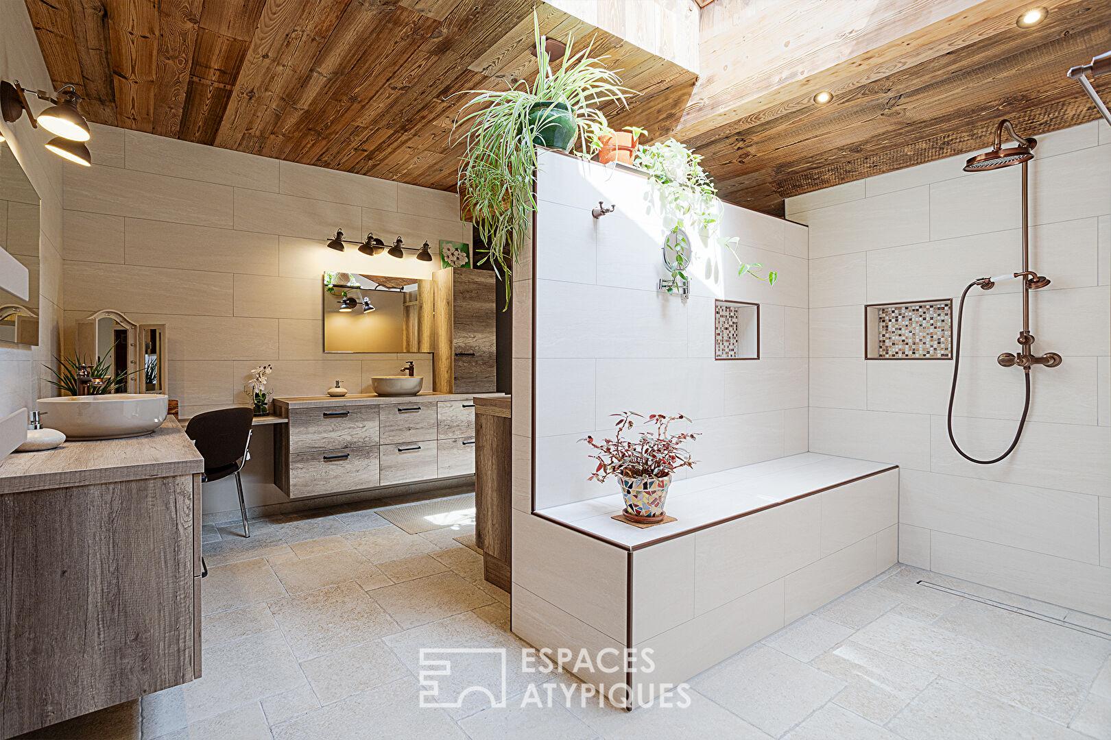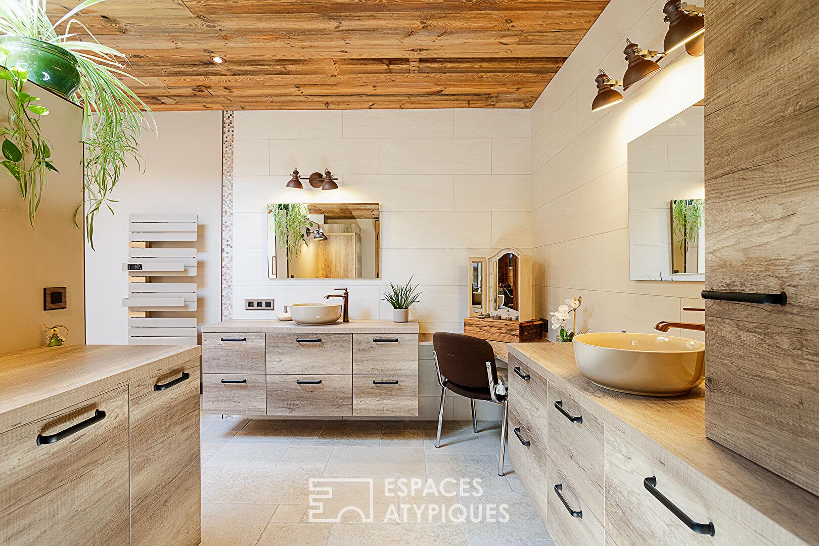 En contraste total, l’extension réalisée en 2020 apporte une écriture architecturale plus graphique. Elle accueille une suite parentale pensée comme un cocon intimiste, où le sol en pierres de Bourgogne et le puits de lumière de la salle d’eau subliment une atmosphère de « trappeur chic » résolument moderne.