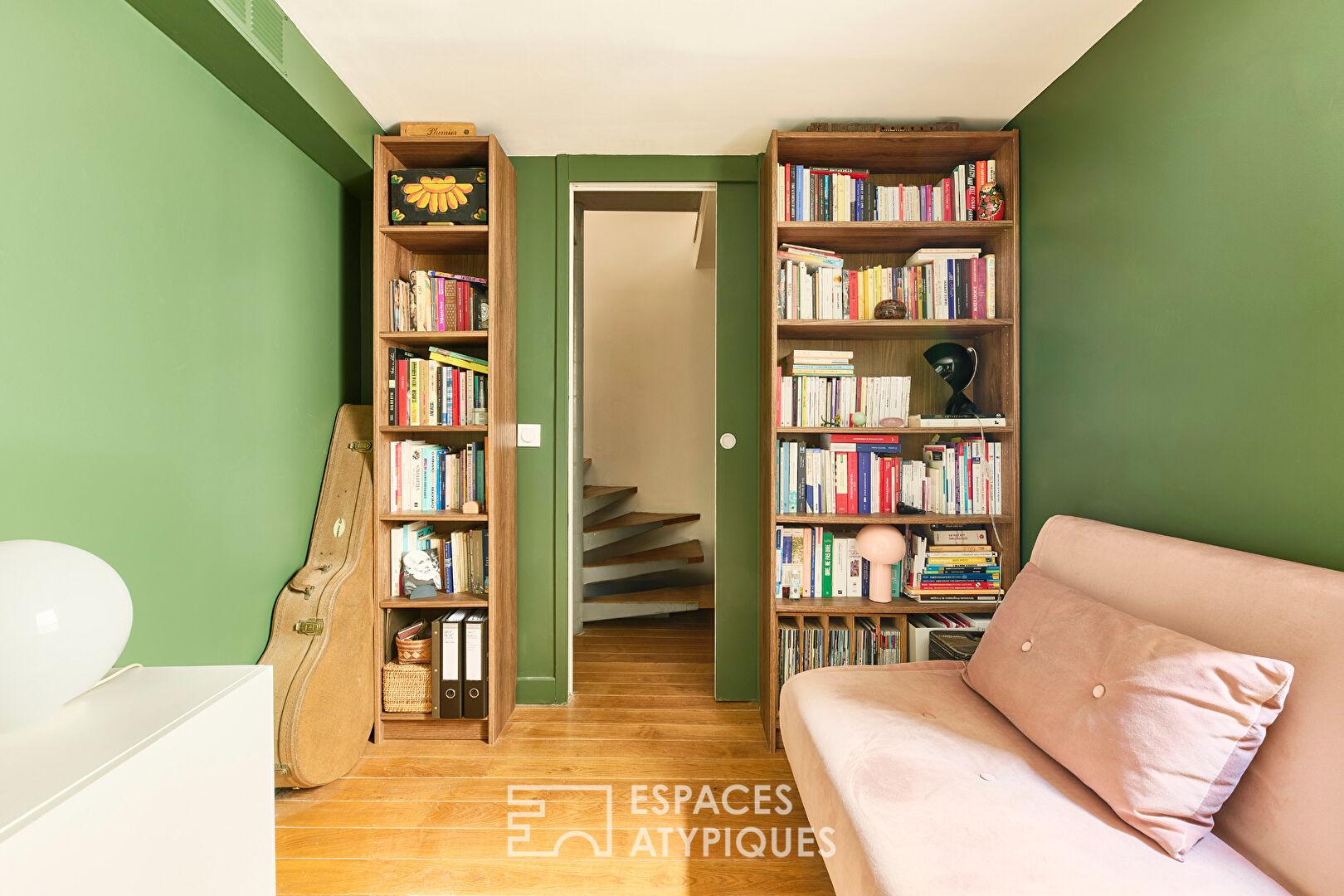 L’espace nuit, bien distinct de la pièce de vie, offre calme et intimité. Il accueille une chambre à l’étage supérieur ainsi qu’un bureau à l’étage inférieur, pensé comme une pièce modulable selon les besoins.