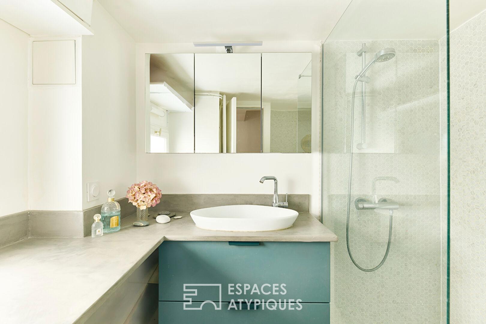 Les rangements y ont été intégrés avec soin, optimisant chaque espace grâce à des aménagements sur mesure discrets et fonctionnels.
