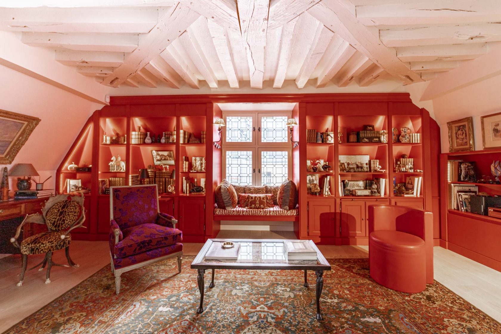 Dans le prolongement une pièce de réception de 46 m2 coiffée par une charpente apparente profite d’une triple exposition et de multiples ouvertures à ornements.