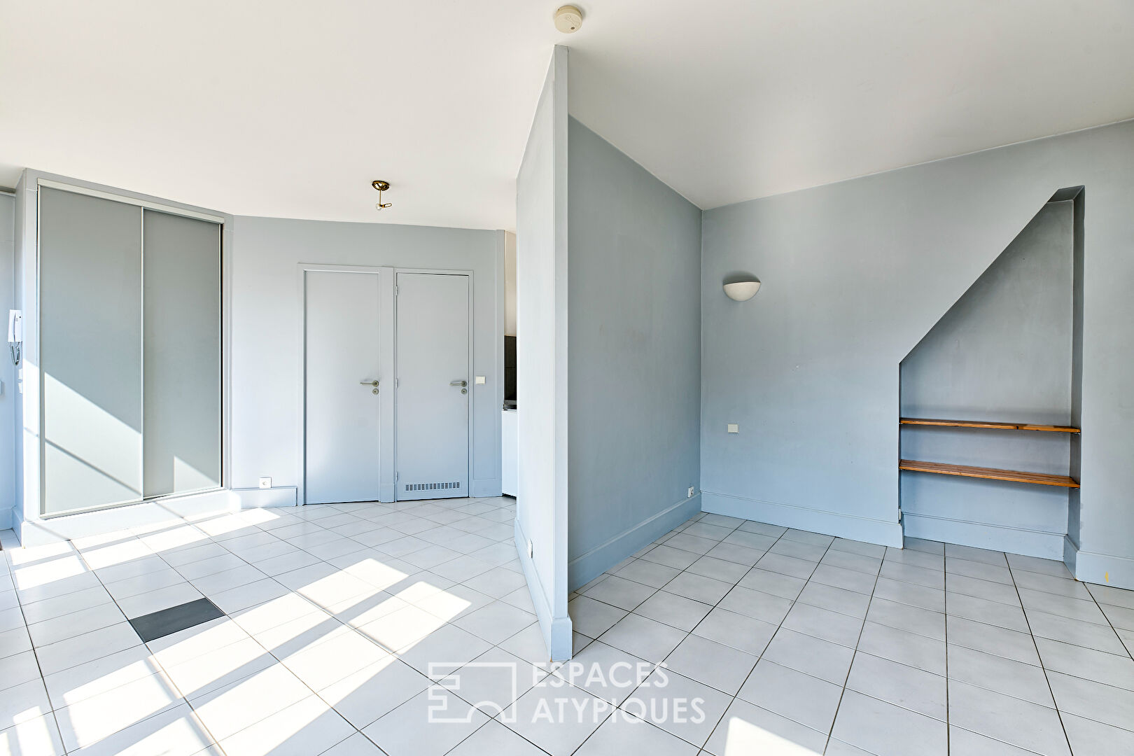 L’entrée mène vers une pièce de vie baignée de lumière due à ses 3 grandes fenêtres et à son exposition plein Sud, d’une alcôve abritant un espace nuit, une cuisine aménagée ouverte sur le salon, une salle d’eau avec douche à l’italienne et un toilette séparé.