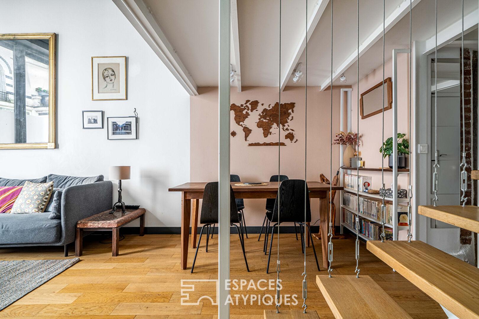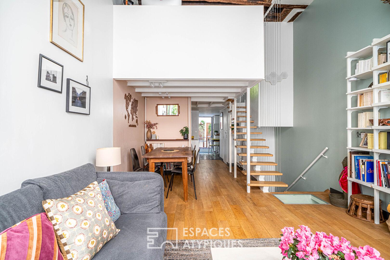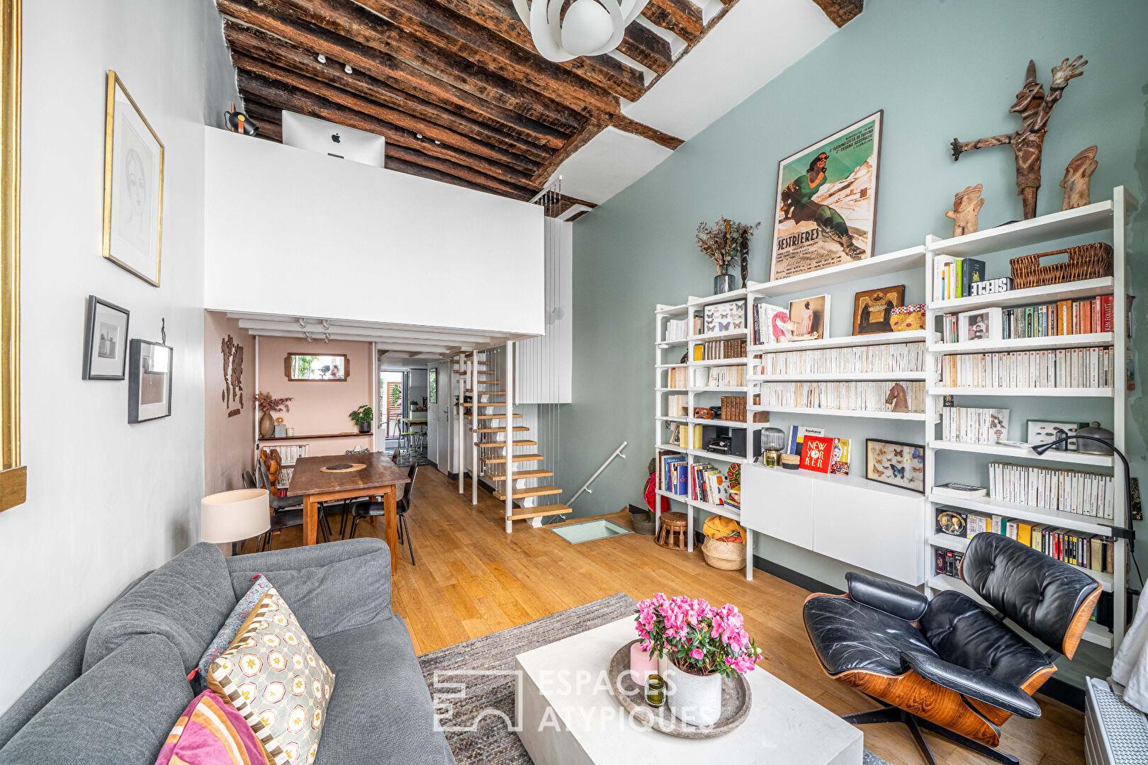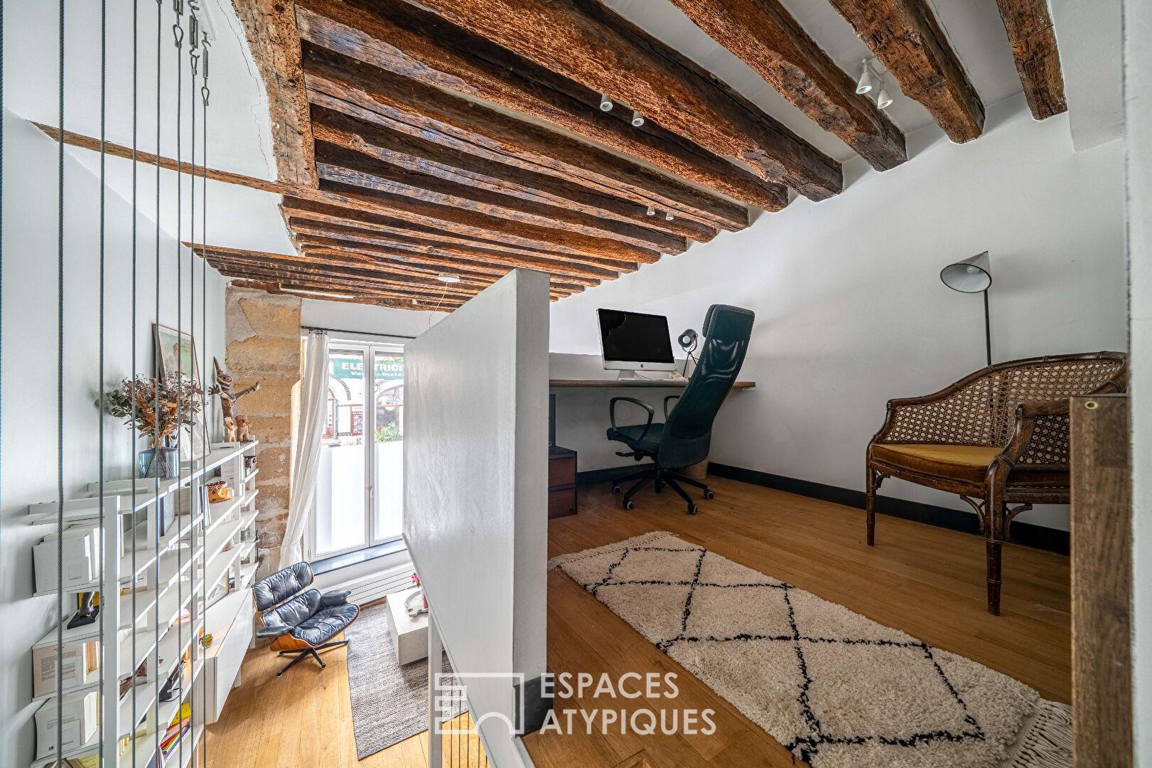 Dès l’entrée, le ton est donné par une cage d’escalier historique monumentale, menant à un lieu de vie où le charme de l’ancien, pierres apparentes et poutres séculaires se marie avec audace à une rénovation contemporaine. Ce bien rare dispose également d’une terrasse fleurie, véritable privilège au centre de Paris.