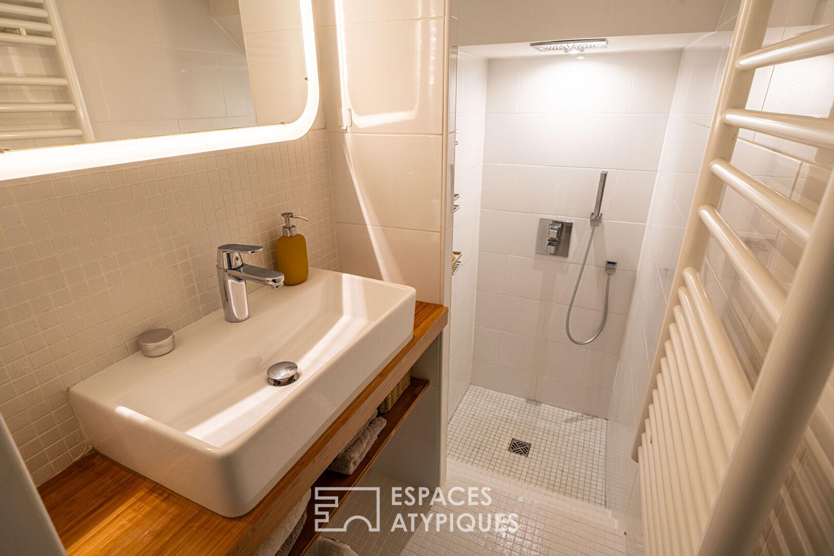 La terrasse privative, accessible depuis la cuisine, constitue une extension naturelle du séjour. Aménagée avec soin, elle offre un espace de respiration végétalisé rare pour le quartier, idéal pour des moments de détente à l’abri des regards.
