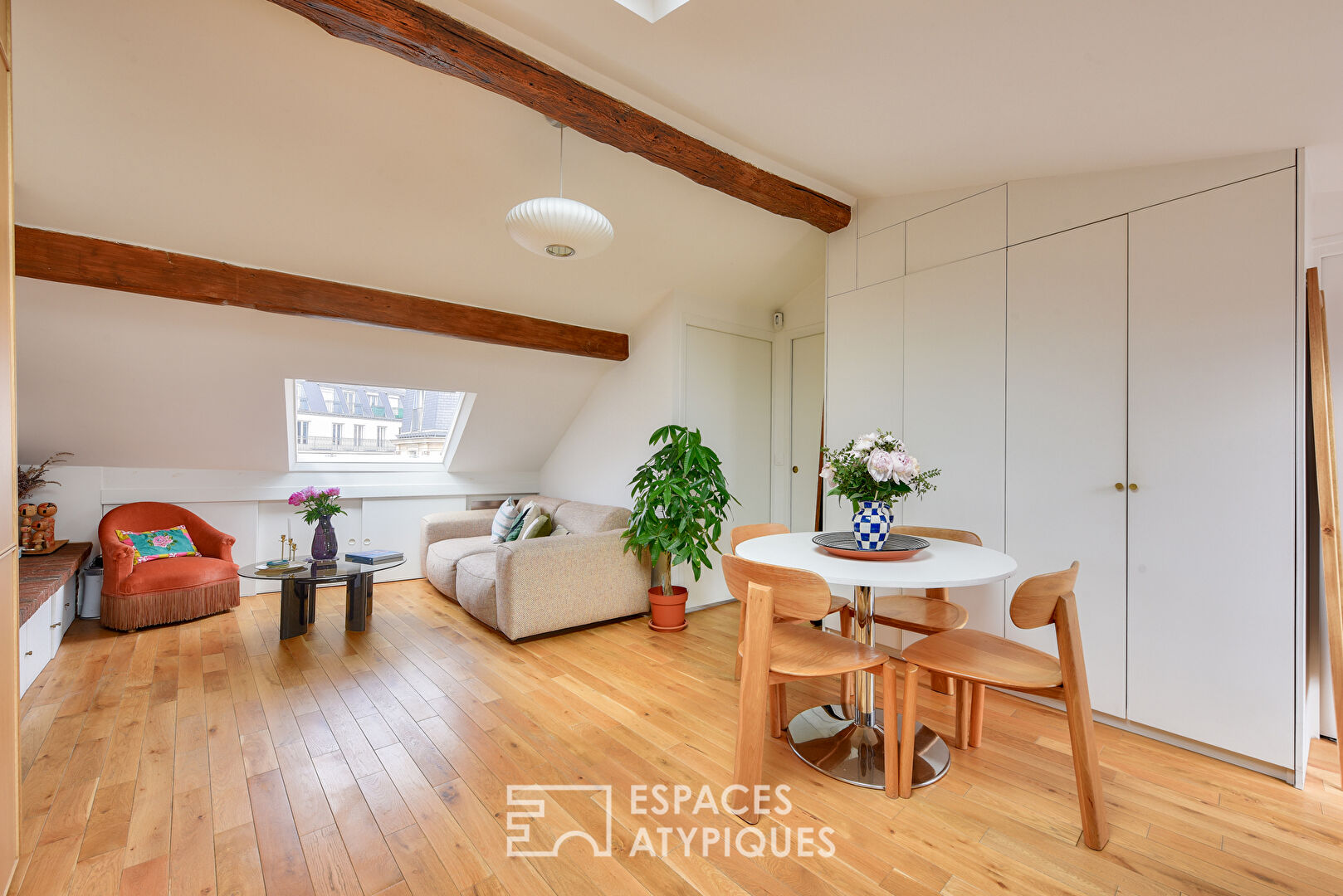 Notre agence Espaces Atypiques Paris rive gauche vous propose cet appartement de 49,08m2 (36,23m2 carrez) caché au calme du 6ème et dernier étage d’un immeuble au coeur du Quartier latin, dans une rue donnant directement accès à la Seine.