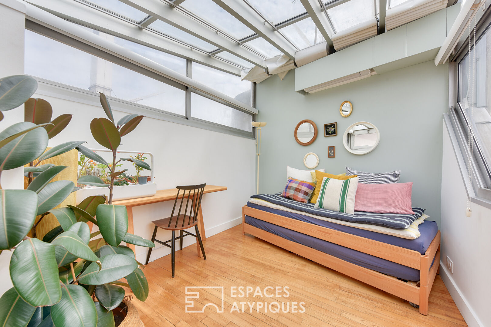 Dès l’entrée, le ton est donné avec l’ensoleillement comme fil conducteur exacerbé par une véranda à la vocation de pièce à vivre ou de boudoir comme une cabane sur les toits de Paris.