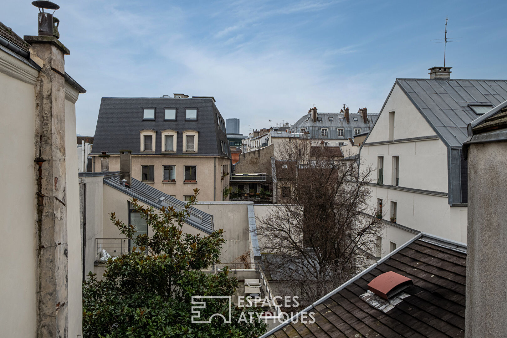 Ce bien offre depuis l’étage supérieur une vue dégagée sur les jardins environnants et les toits parisiens. Cette perspective aérienne garantit une intimité rare et une chambre au calme absolu.