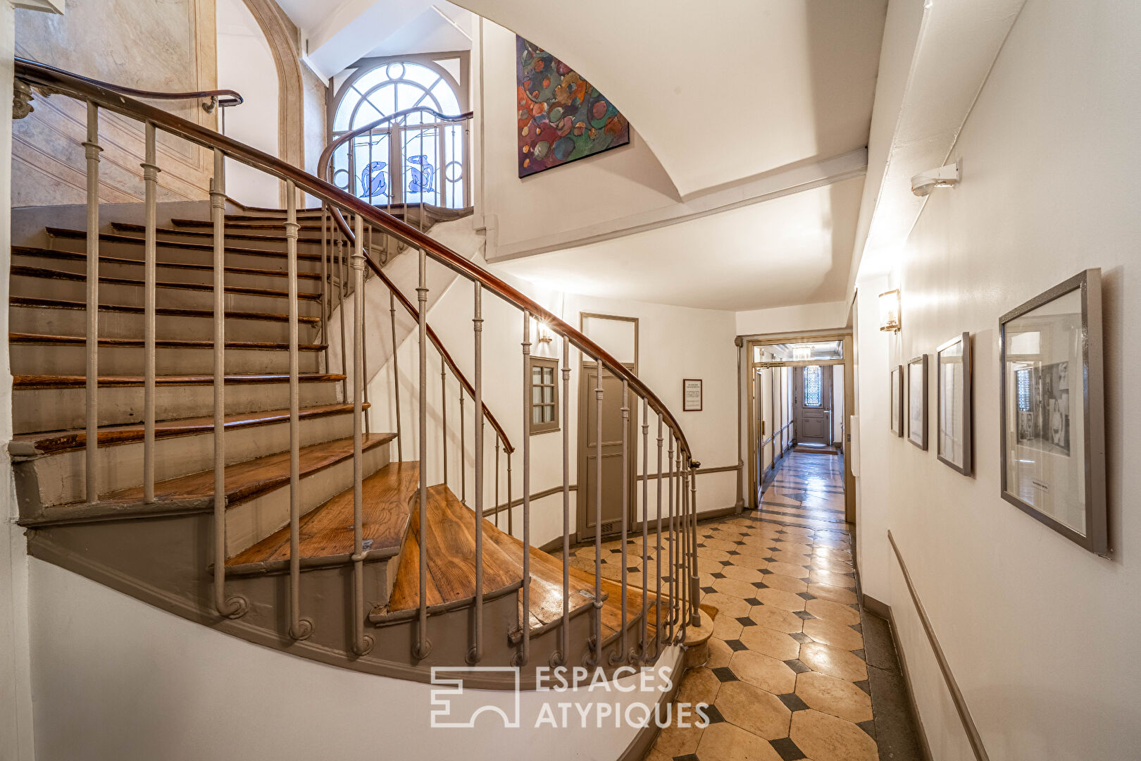 L’âme du lieu est palpable dès l’arrivée, la cage d’escalier, entièrement rénovée avec goût, abrite un hommage vibrant à Matisse avec une reproduction de la « Femme en bleu » en guise de vitrail.