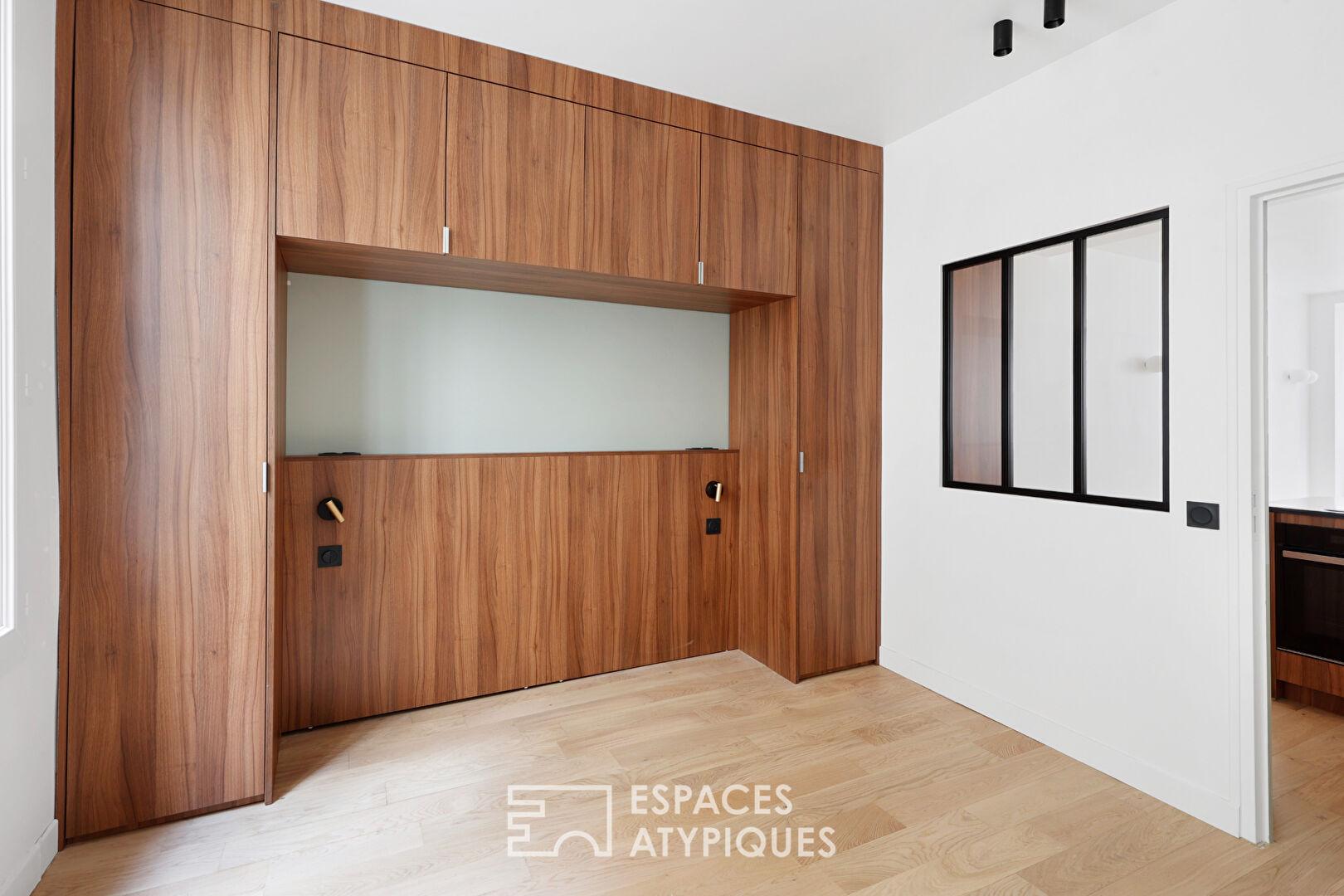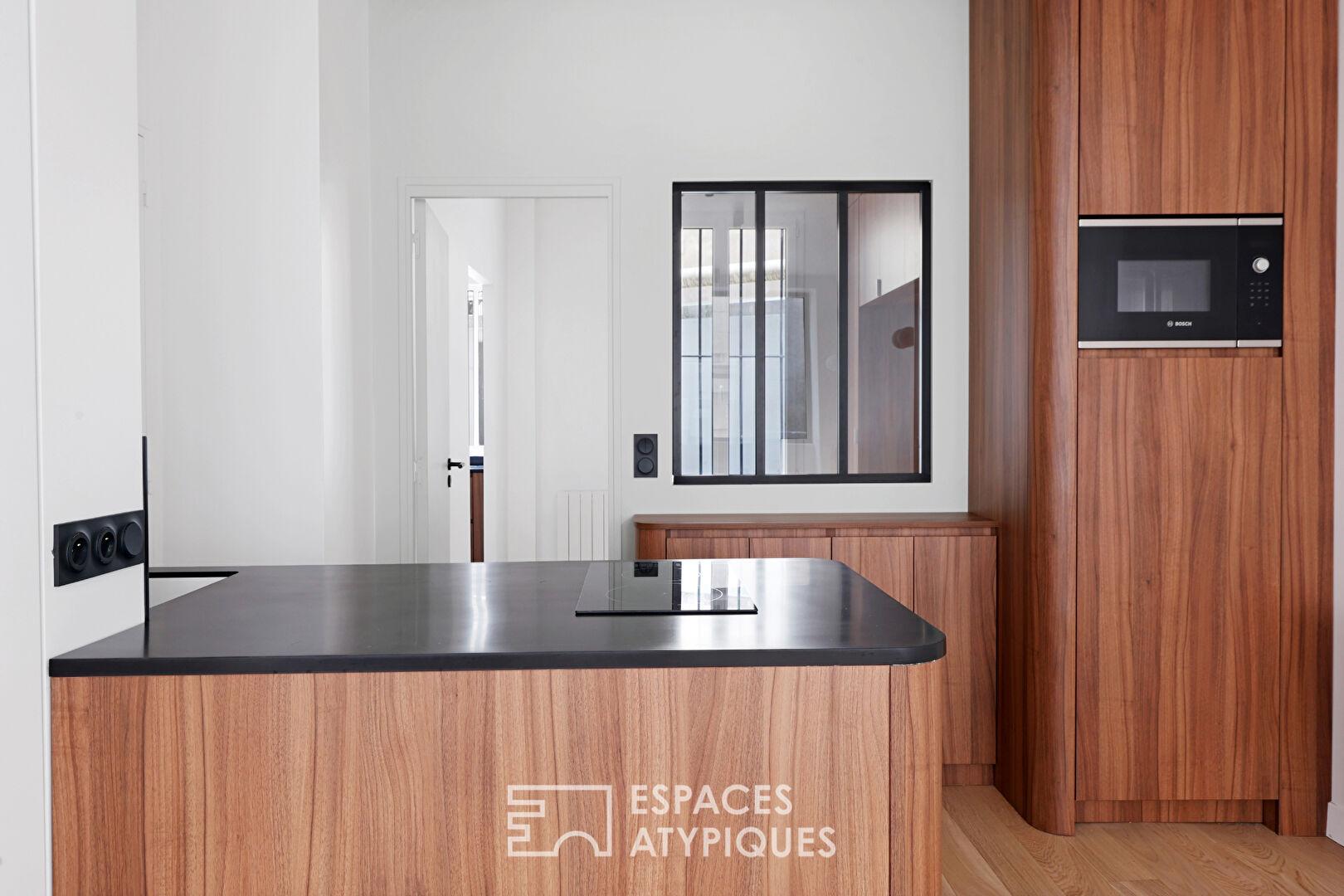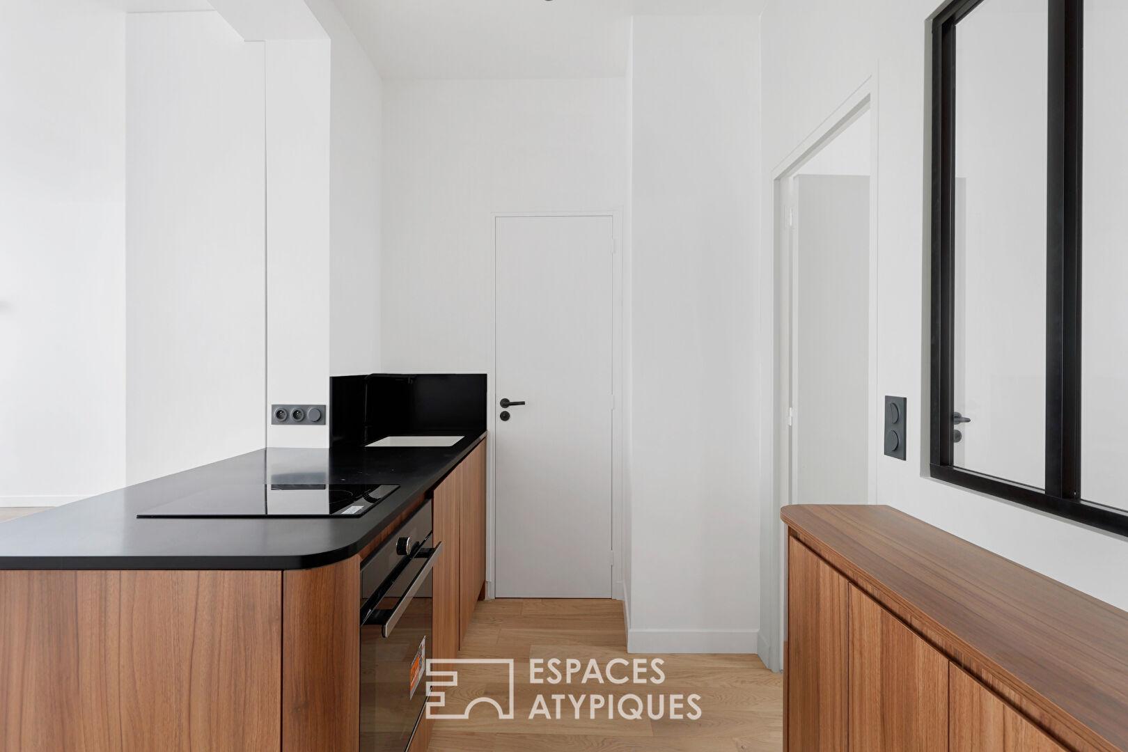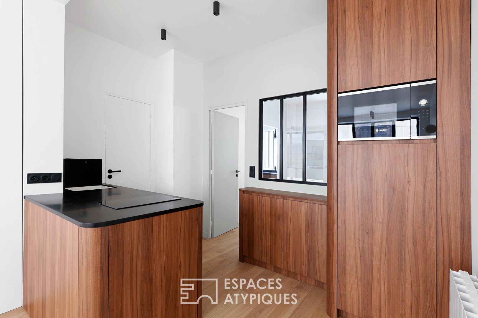Dès l’entrée, les volumes optimisés révèlent une belle pièce de vie de 33 m2, sublimée par des menuiseries sur mesure et une cuisine ouverte entièrement équipée.