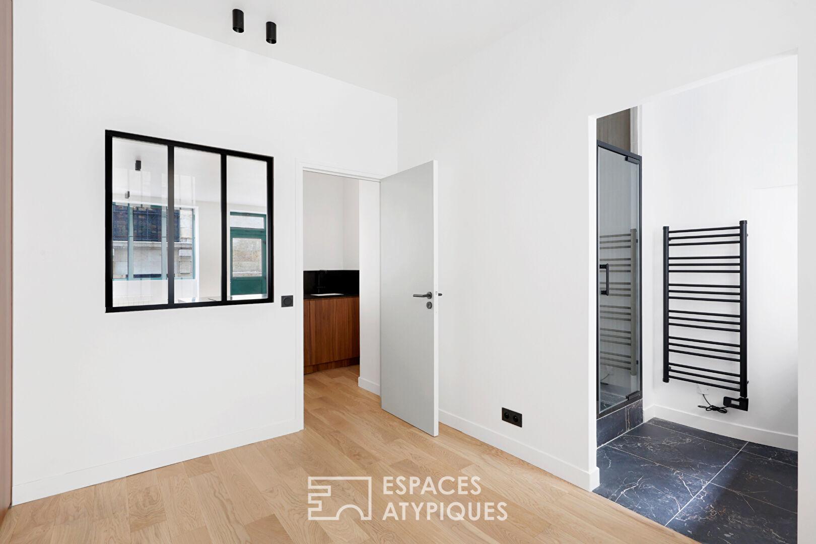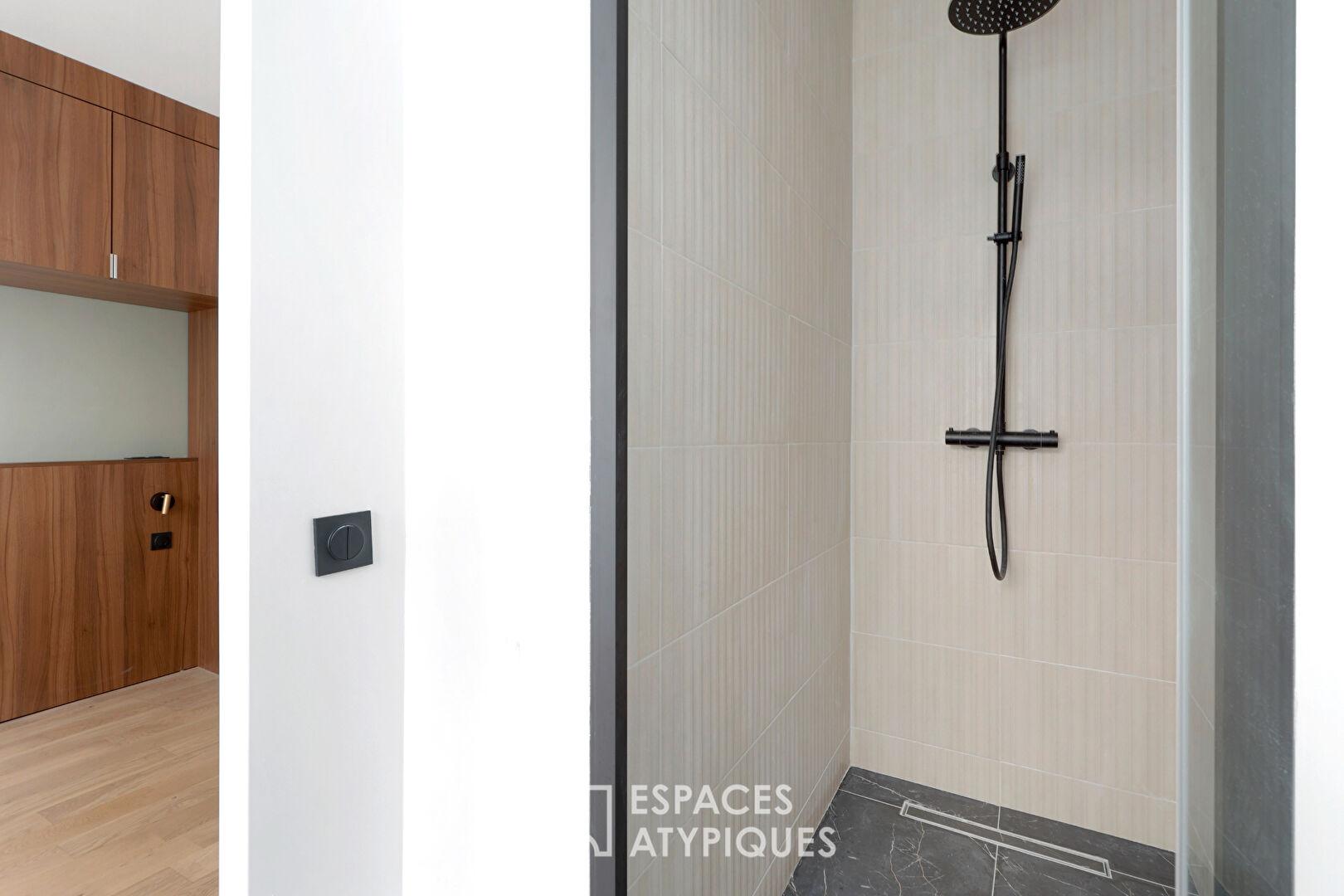 L’agencement fluide mène à une chambre élégante et à une salle d’eau aux lignes épurées.