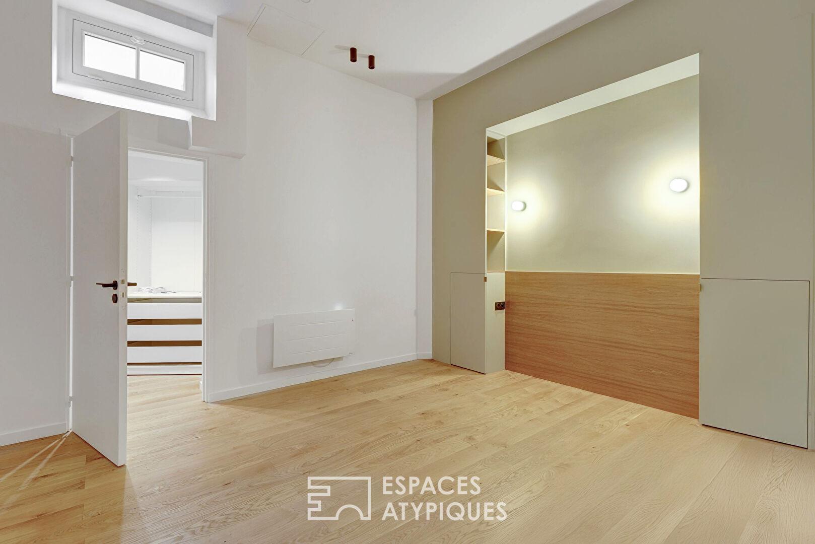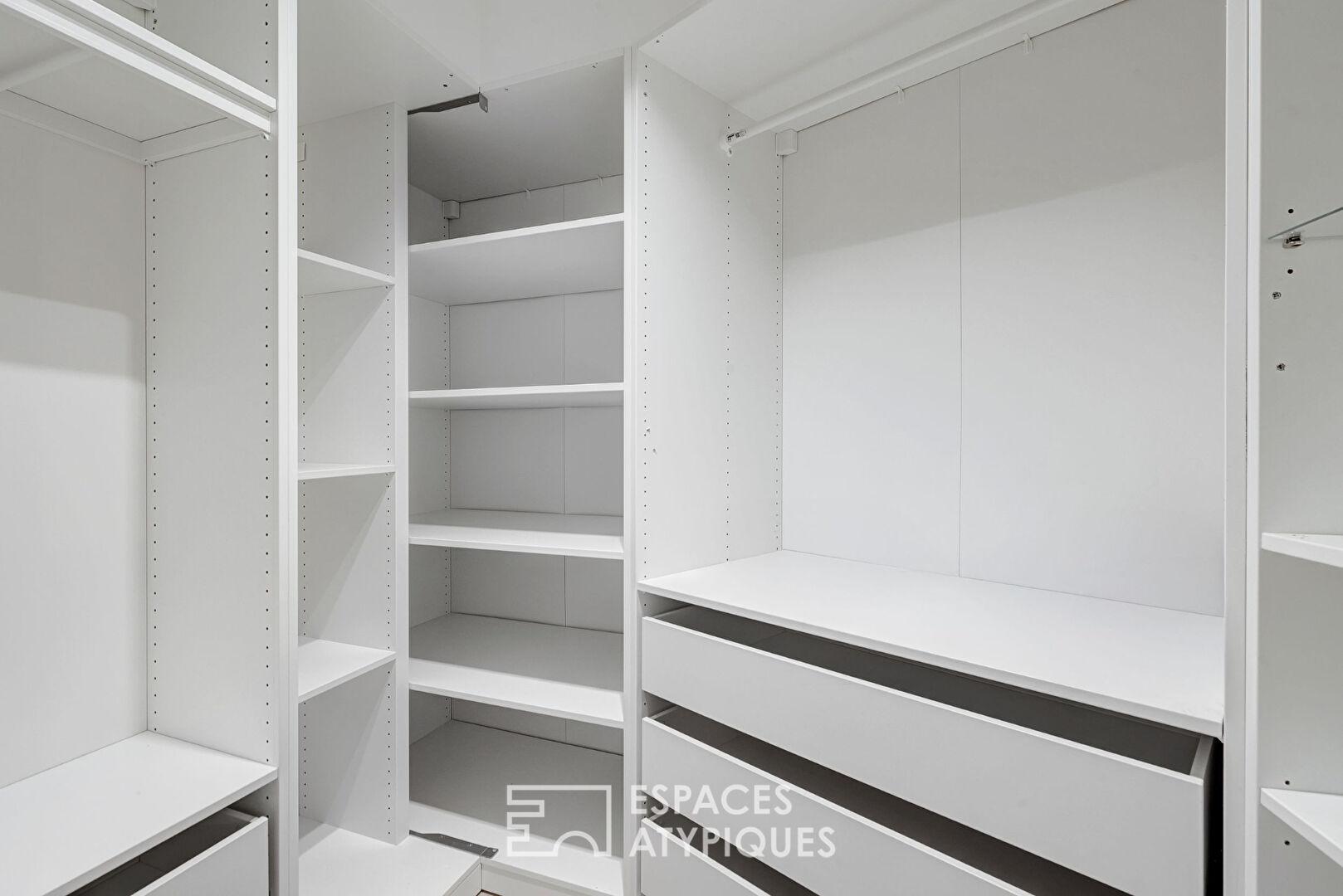 Côté nuit, la chambre, de 16 m² intègre des rangements sur mesure autour de la tête de lit et dispose en plus d’un dressing de 3 m².