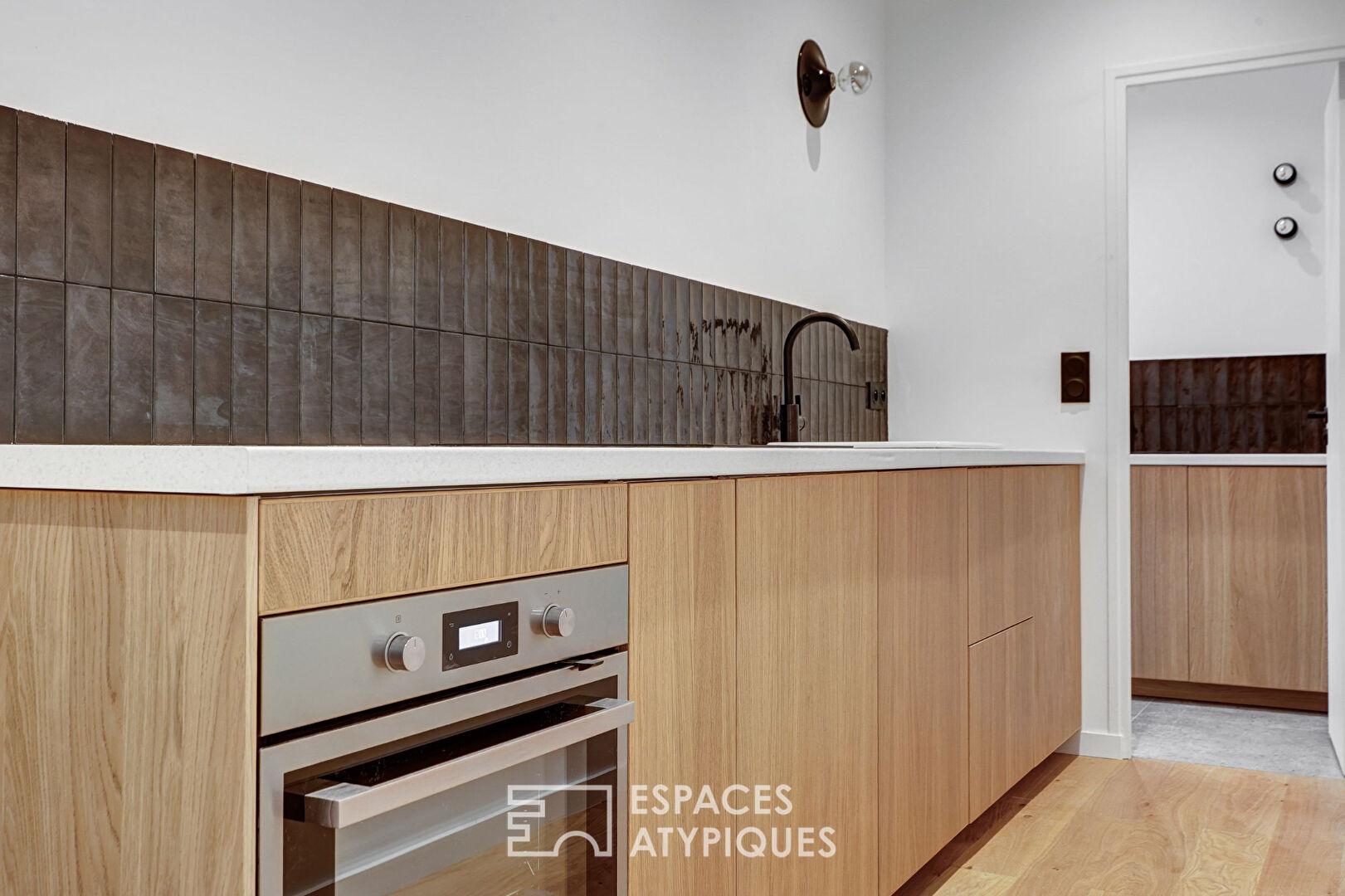 Derrière, la cuisine équipée, aux lignes contemporaines, s’intègre harmonieusement à l’ensemble.