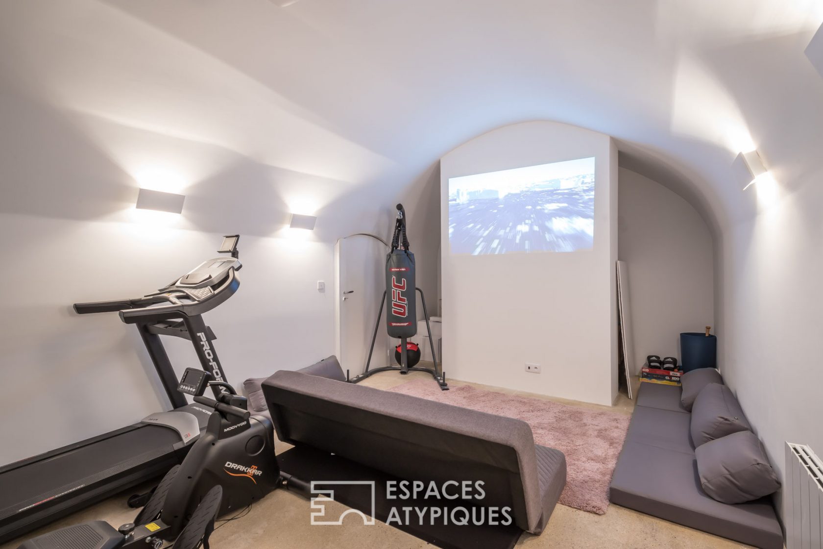 Sous la verrière zénithale, un escalier en béton et acier design, dessert une salle de projection et de sport.