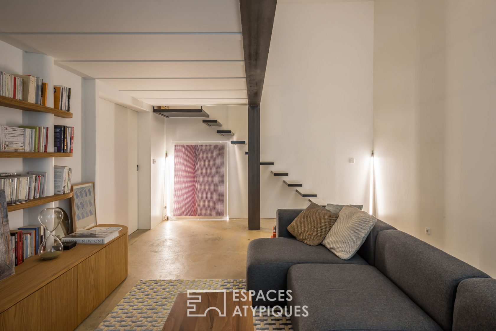 Dans le prolongement de l’atelier, un espace en duplex est composé d’un salon détente profitant d’une double hauteur, d’une chambre avec vue sur la terrasse et d’une buanderie.