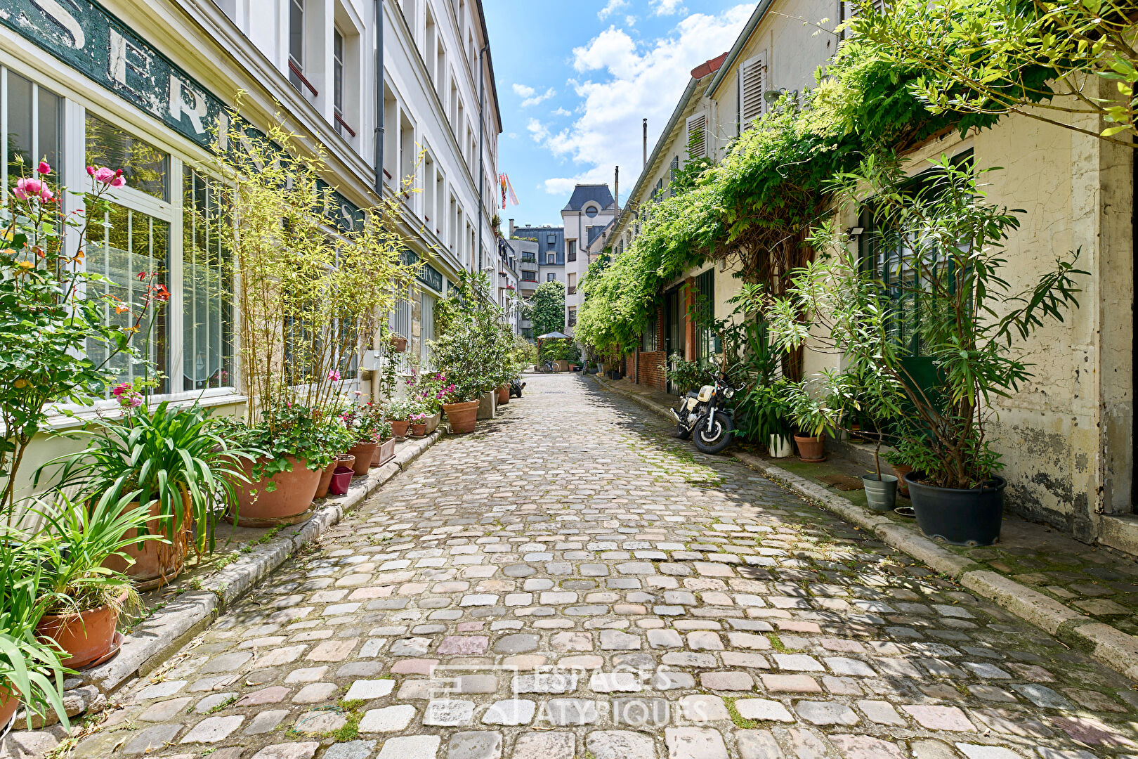 Au calme, au sein d’une impasse pavée végétalisée, cet atelier avec commercialité à rénover développe une superficie de 257m² (235,75 m² Carrez).