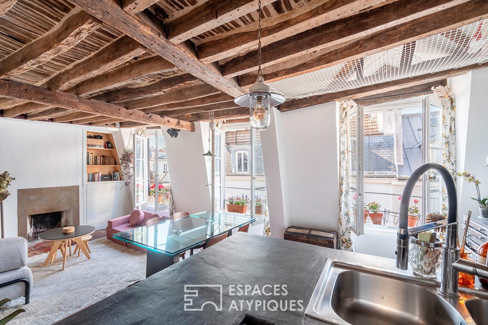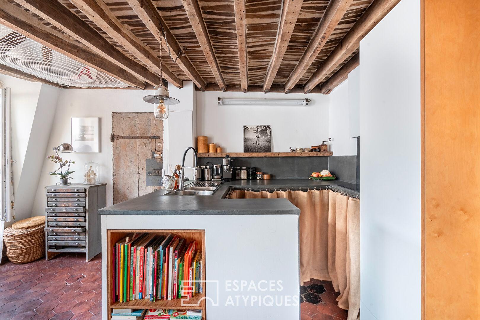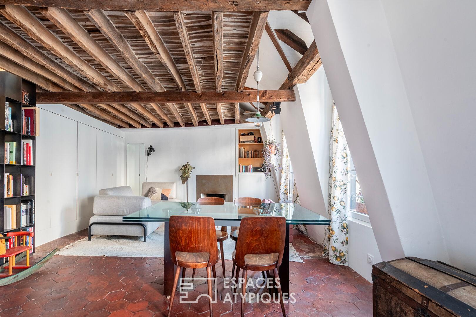 L’entrée ouvre sur une pièce de vie de de 29,5m² où le temps semble s’être arrêté. Ici, les matières brutes sont à l’honneur : les tommettes d’époque au sol dialoguent avec les poutres apparentes et une cheminée fonctionnelle, créant une atmosphère à la fois intime et feutrée. Trois fenêtres cadrant les toits parisiens inondent l’espace d’une lumière douce. Ce niveau accueille une cuisine ouverte, un espace salle à manger et un salon.