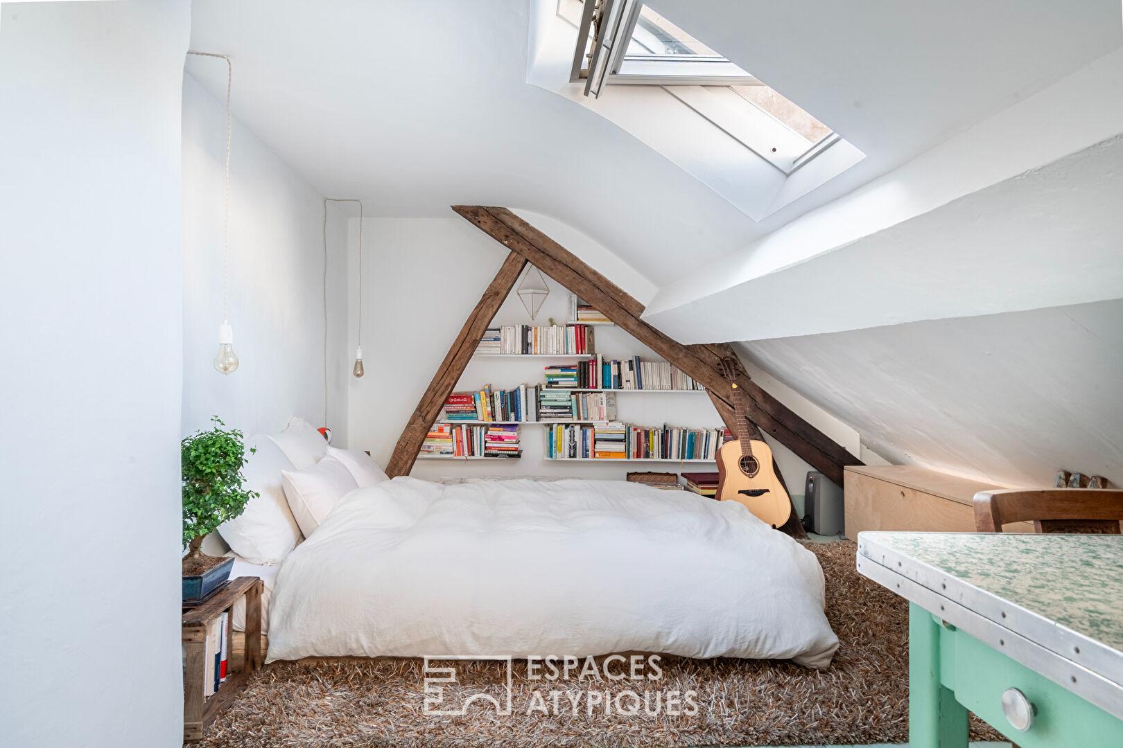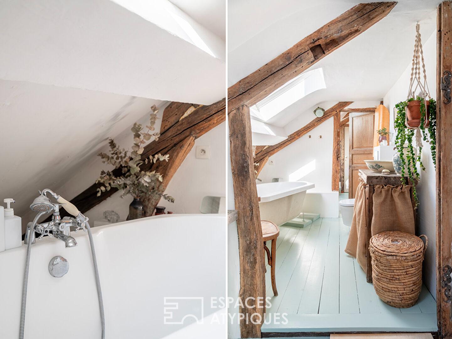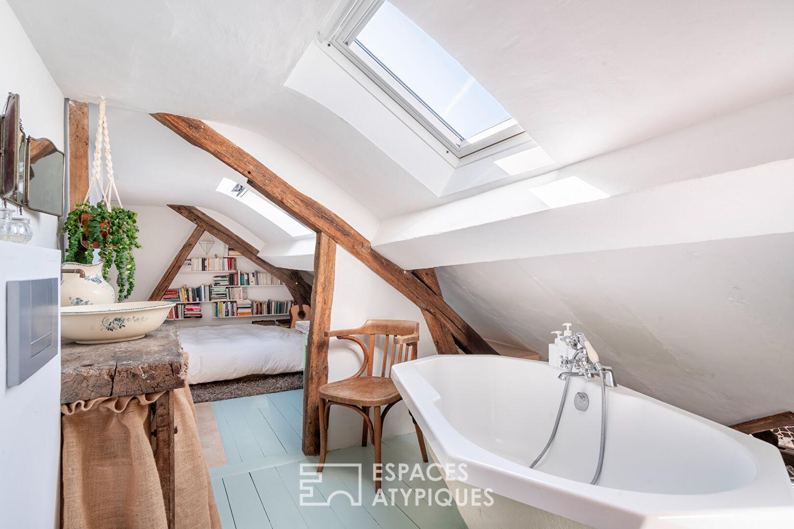 Un escalier sur-mesure à pas japonais mène au niveau supérieur, niché sous les combles. Cet espace nuit, aux allures de campagne à Paris, accueille une chambre principale, une salle de bains avec baignoire et une seconde petite chambre polyvalente, idéale pour un bureau inspirant ou un cocon d’enfant.