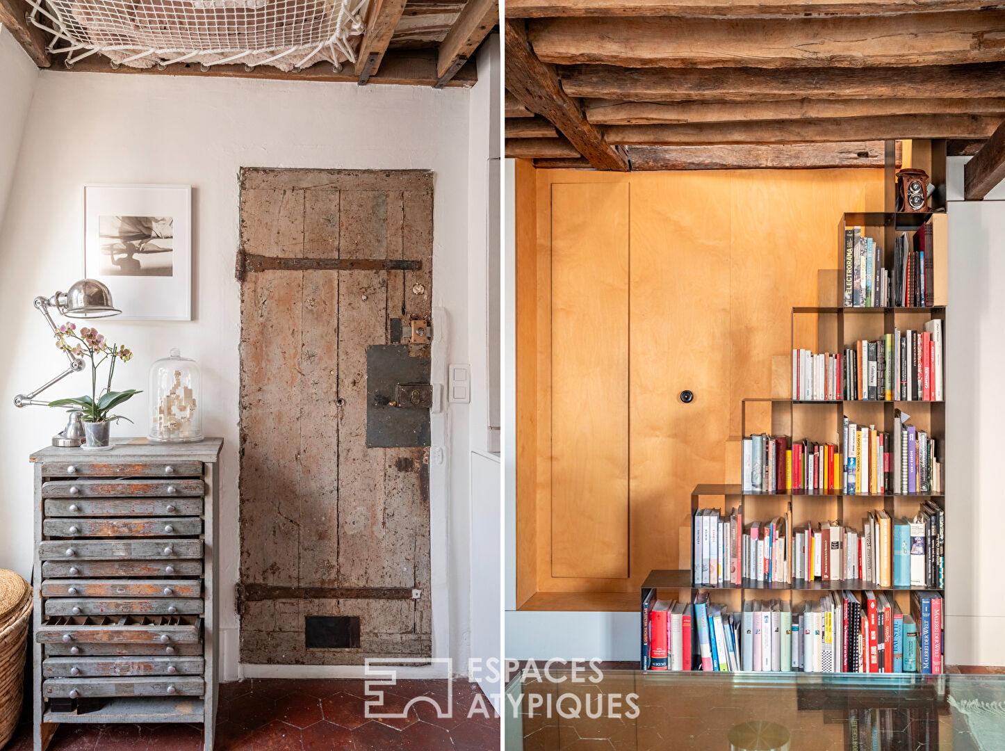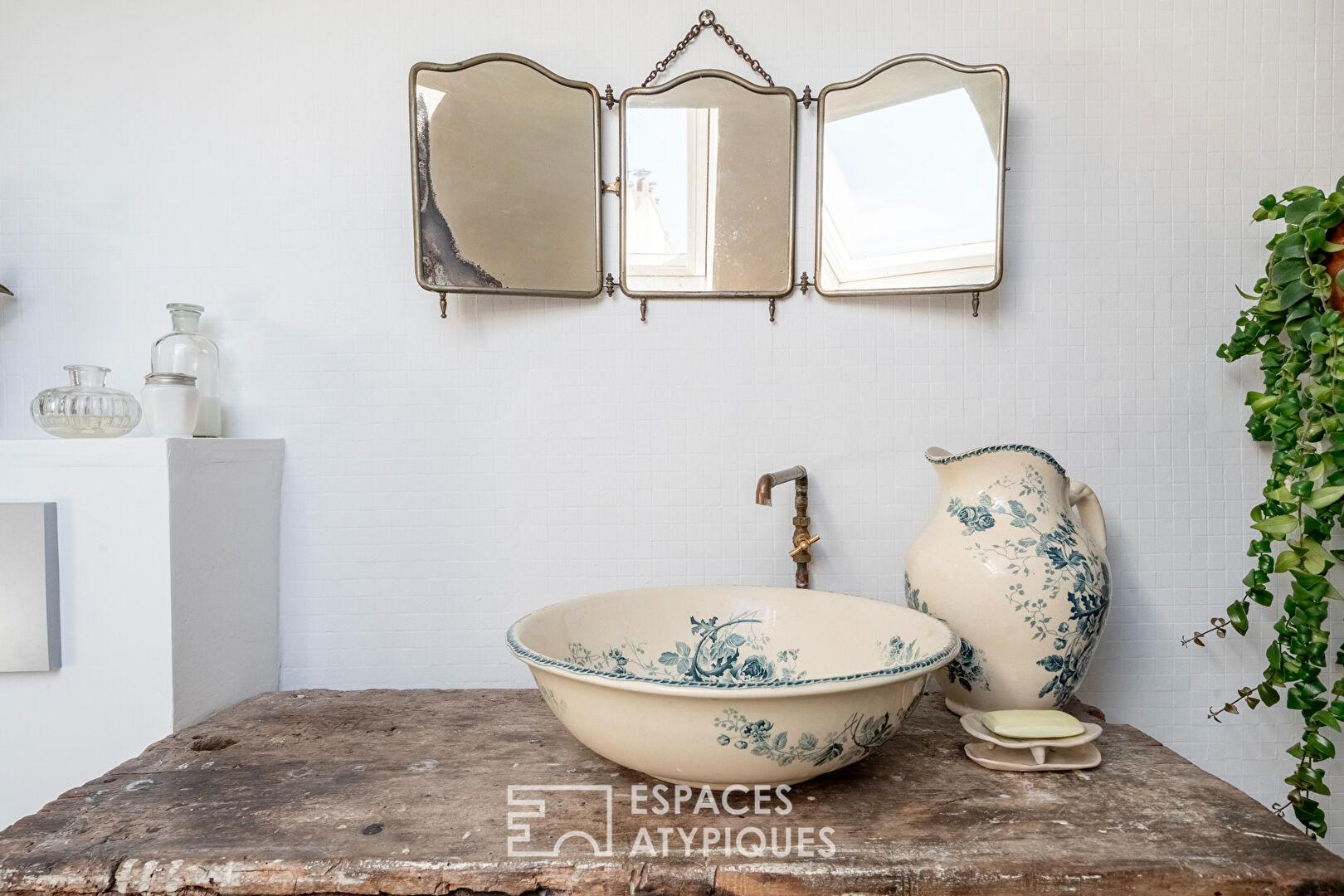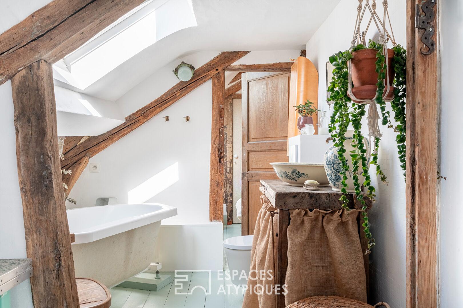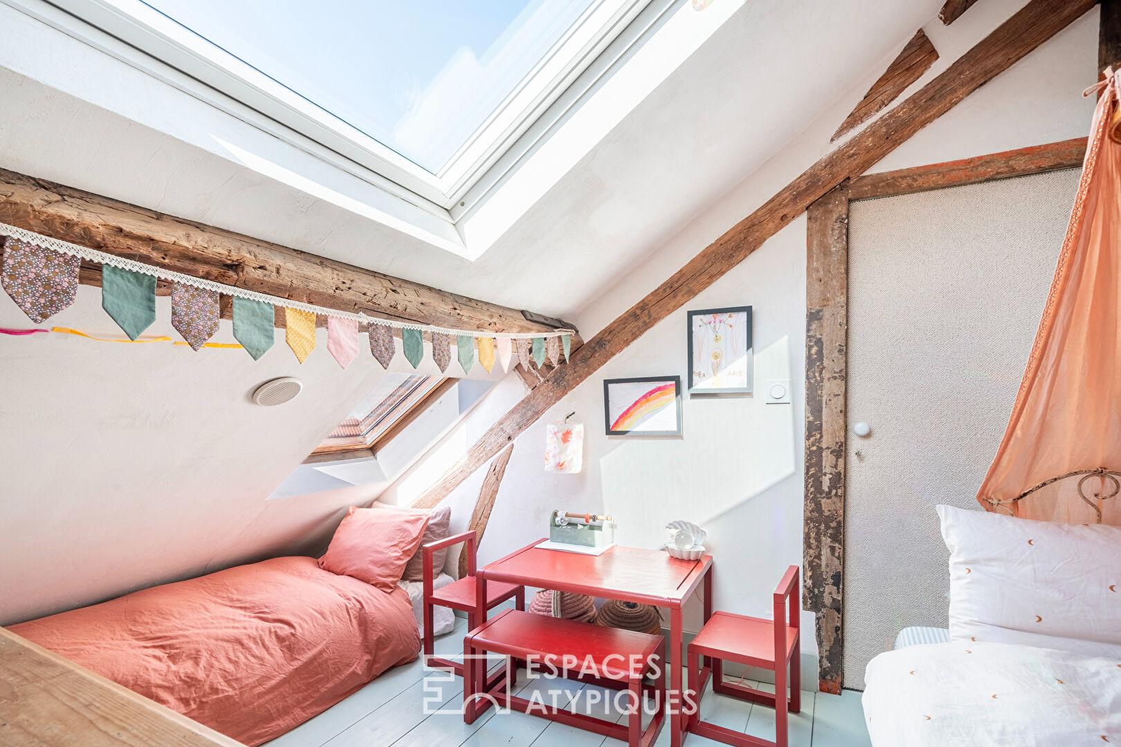 Un escalier sur-mesure à pas japonais mène au niveau supérieur, niché sous les combles. Cet espace nuit, aux allures de campagne à Paris, accueille une chambre principale, une salle de bains avec baignoire et une seconde petite chambre polyvalente, idéale pour un bureau inspirant ou un cocon d’enfant.