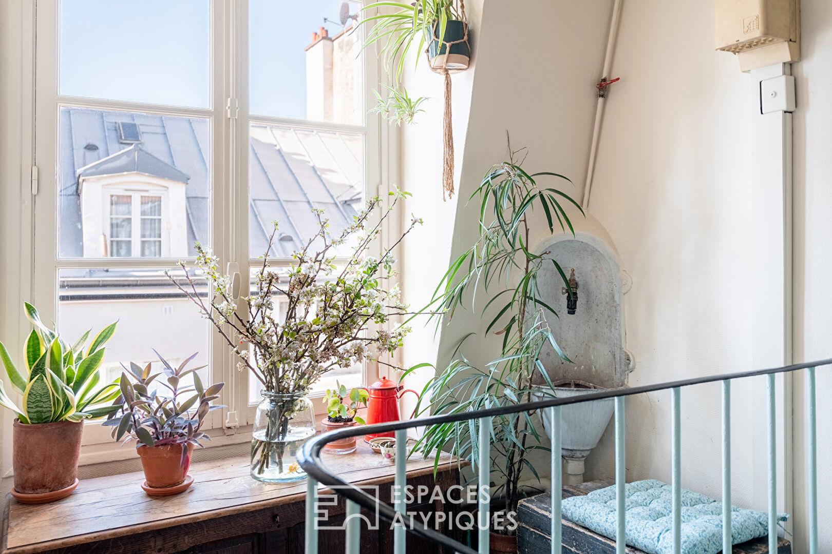 Au coeur du quartier prisé de Bastille / Charonne, par-delà une charmante cour fleurie, ce duplex de 58,82 m2 au sol (41,75m2 carrez) prend place au quatrième et dernier étages par escalier d’un immeuble ancien en seconde ligne.