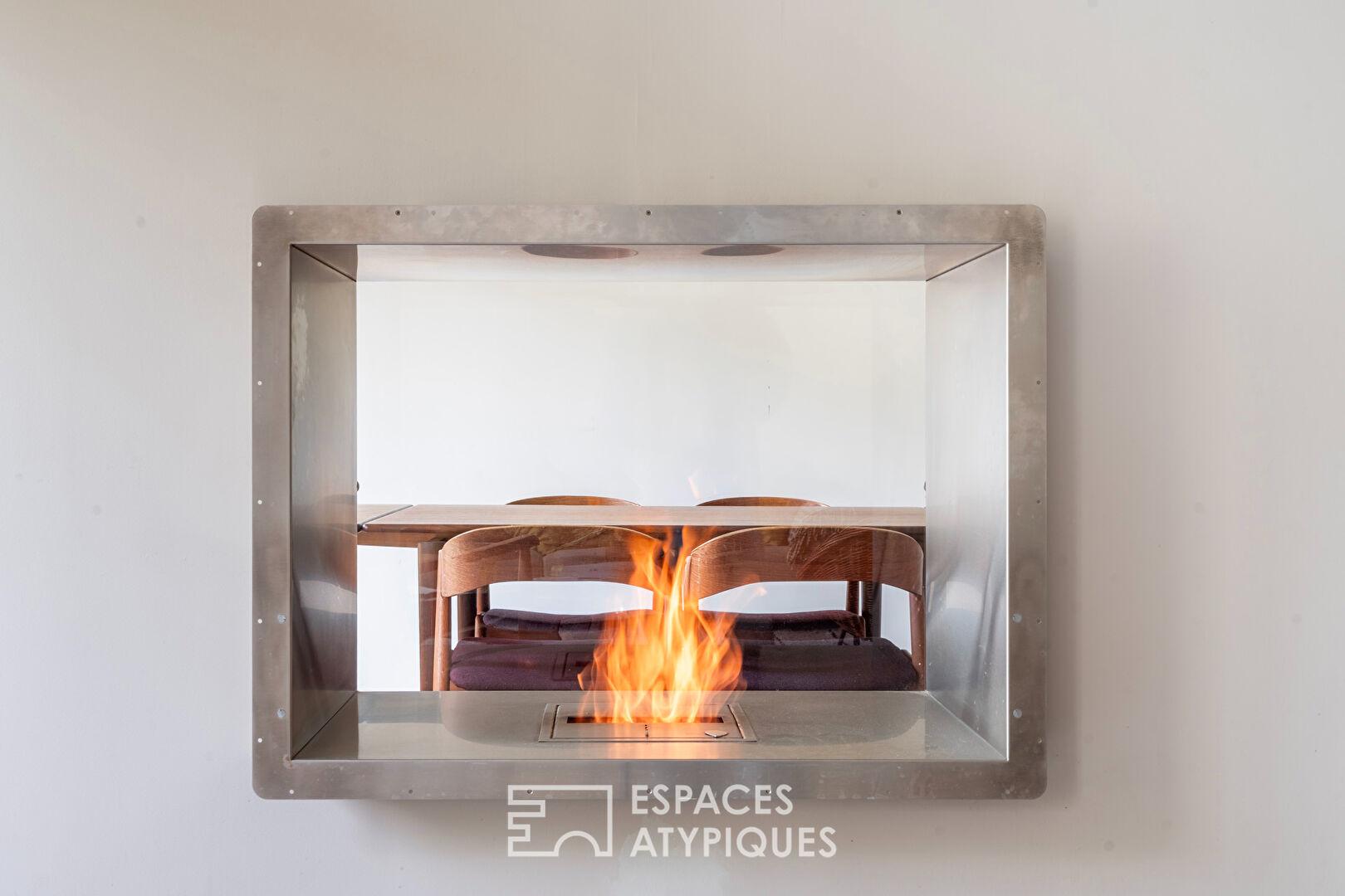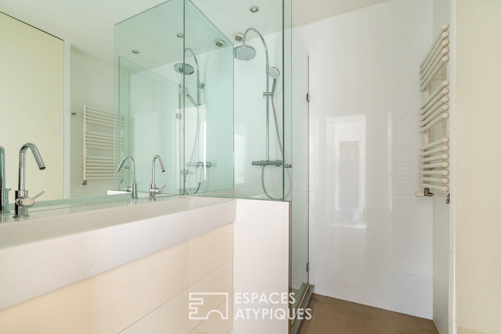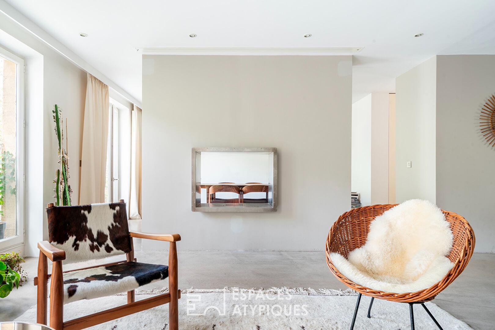 Ici, le ton est donné par une rénovation radicale et soignée, où le béton ciré au sol et les murs épurés célèbrent un minimalisme résolument moderne, contrastant avec l’âme historique du bâtiment.
