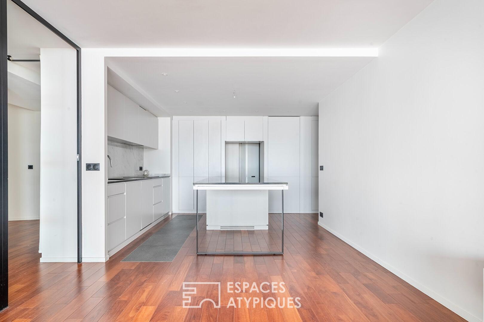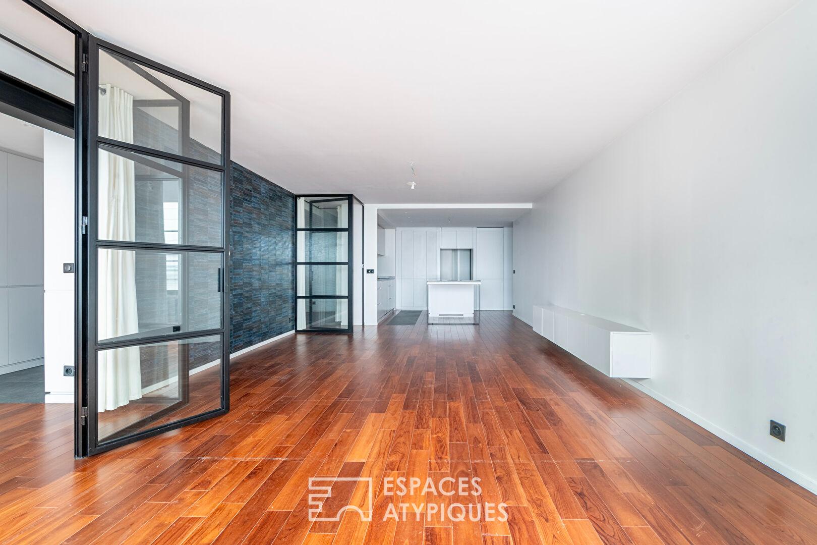 La pièce de vie magistrale de 47 m², véritable cœur battant de l’appartement, s’habille d’un parquet massif chaleureux qui dialogue avec d’élégantes huisseries en acier.
