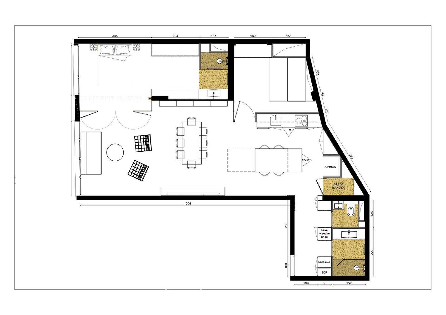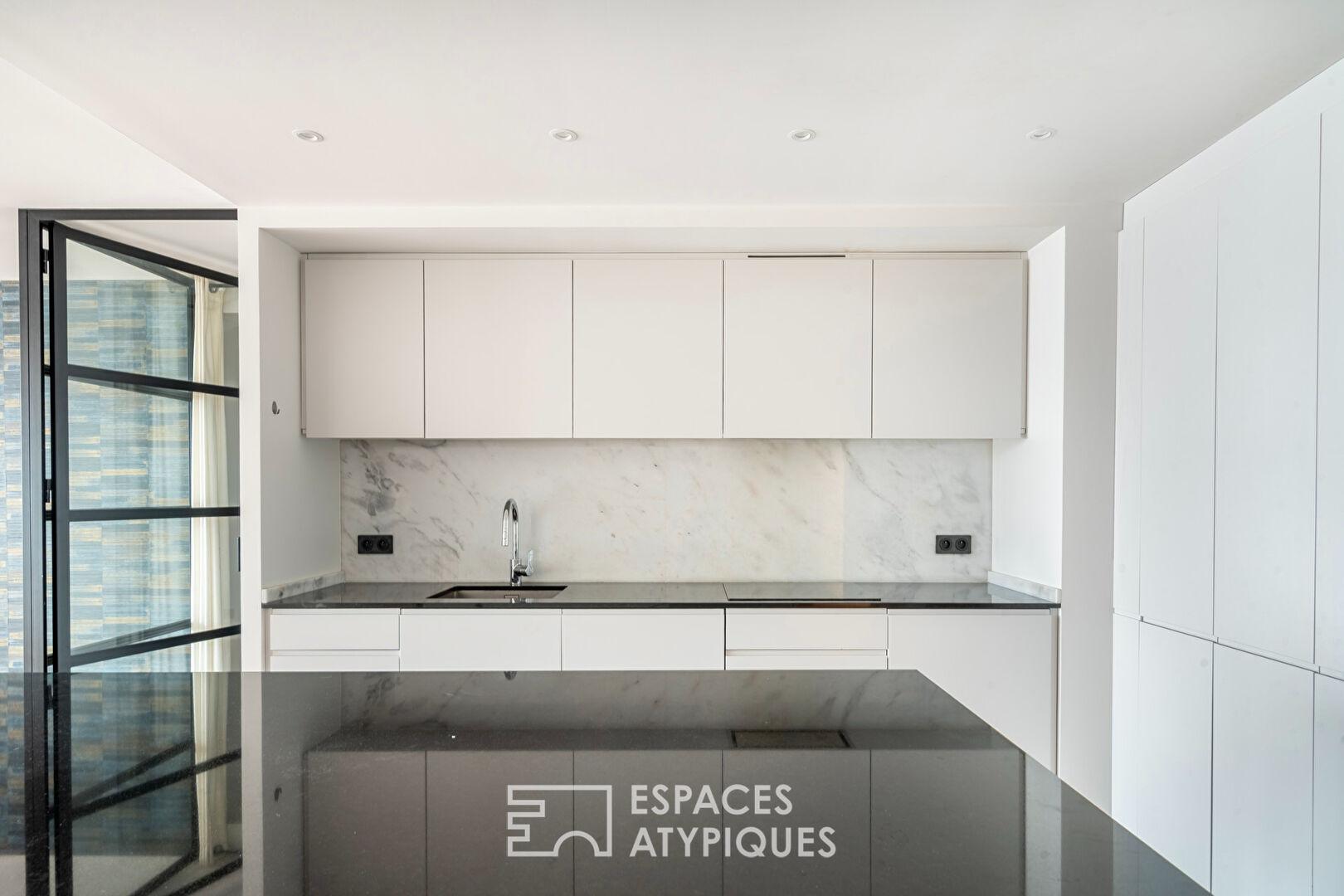 La cuisine sur mesure, aux lignes épurées et entièrement équipée, s’intègre avec fluidité dans cet espace de vie généreux, idéal pour recevoir.