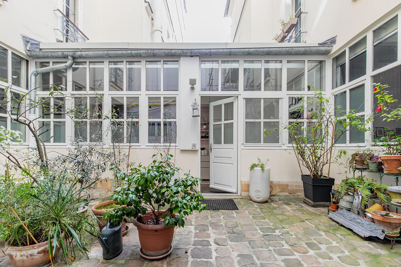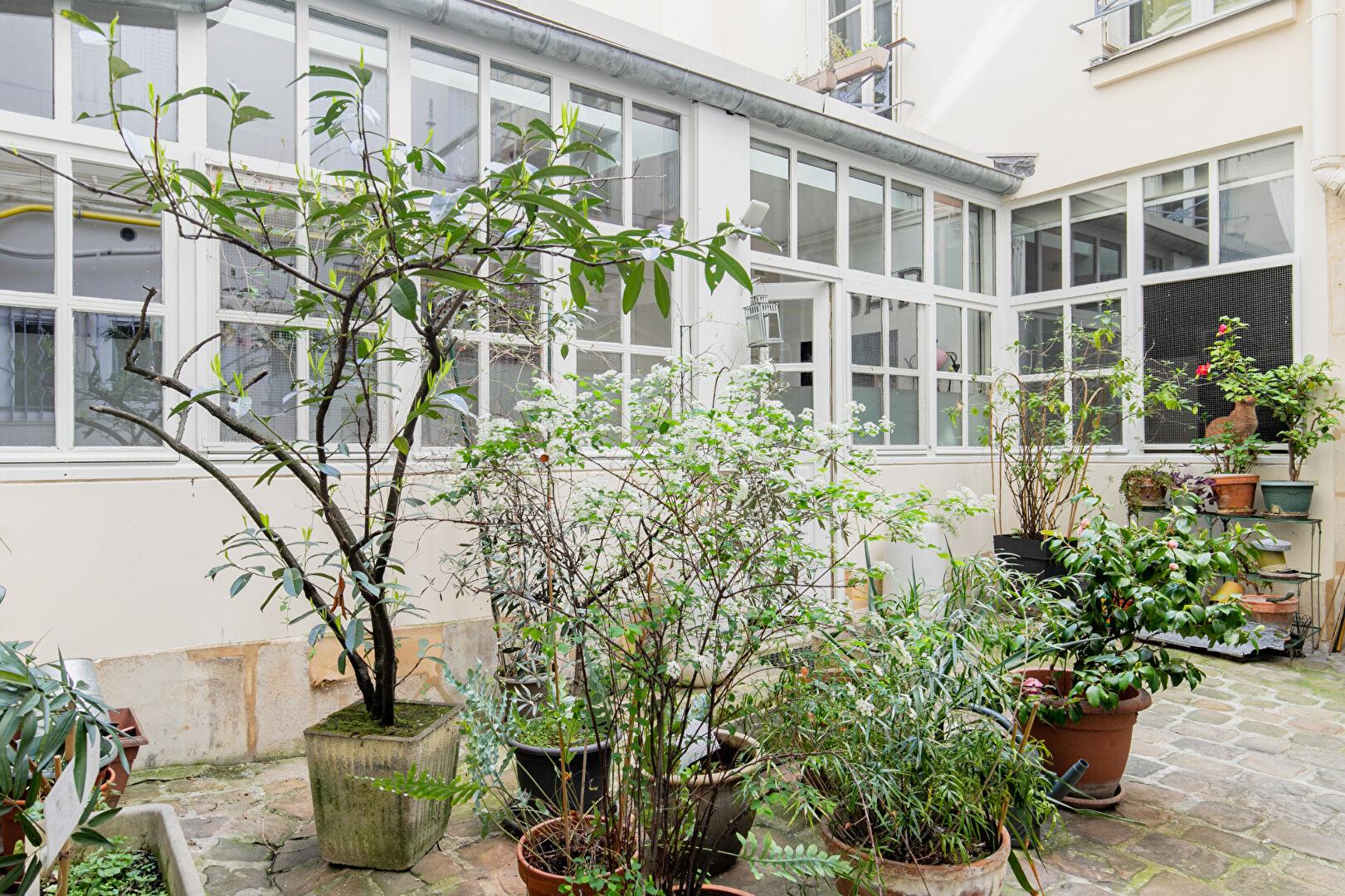 La cour pavée, agrémentée de plantes disposées avec soin, prolonge l’esprit atelier et offre un cadre paisible et arboré.