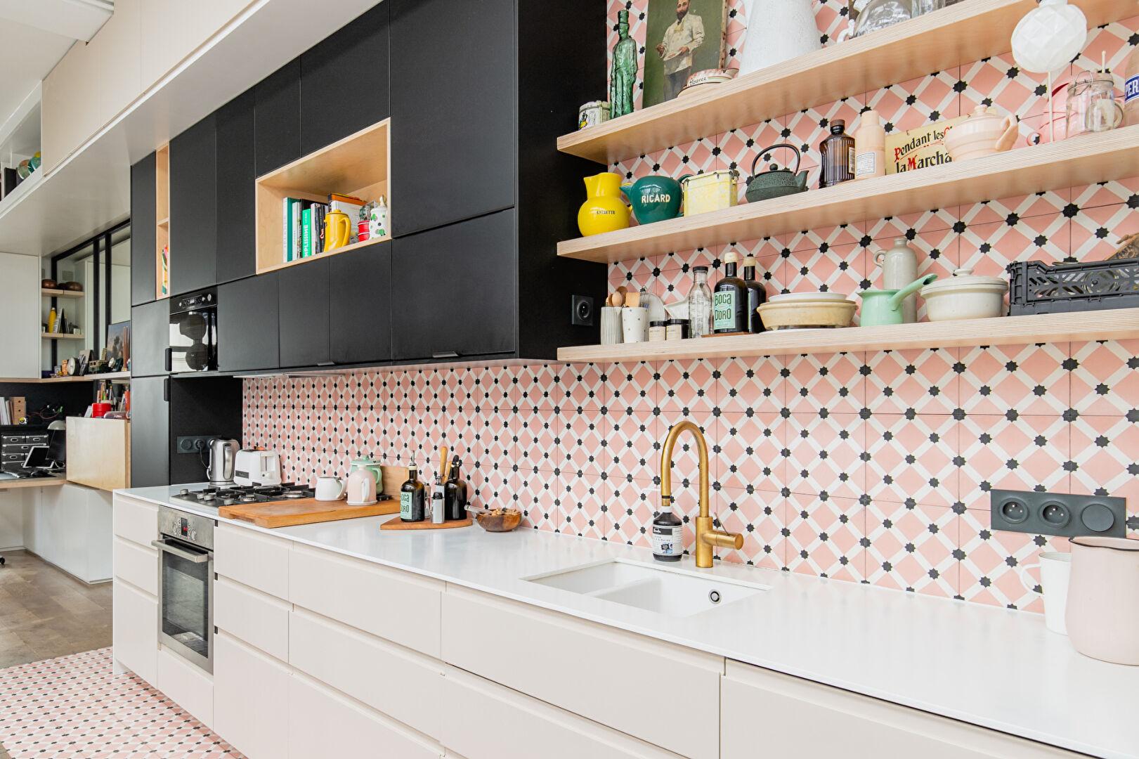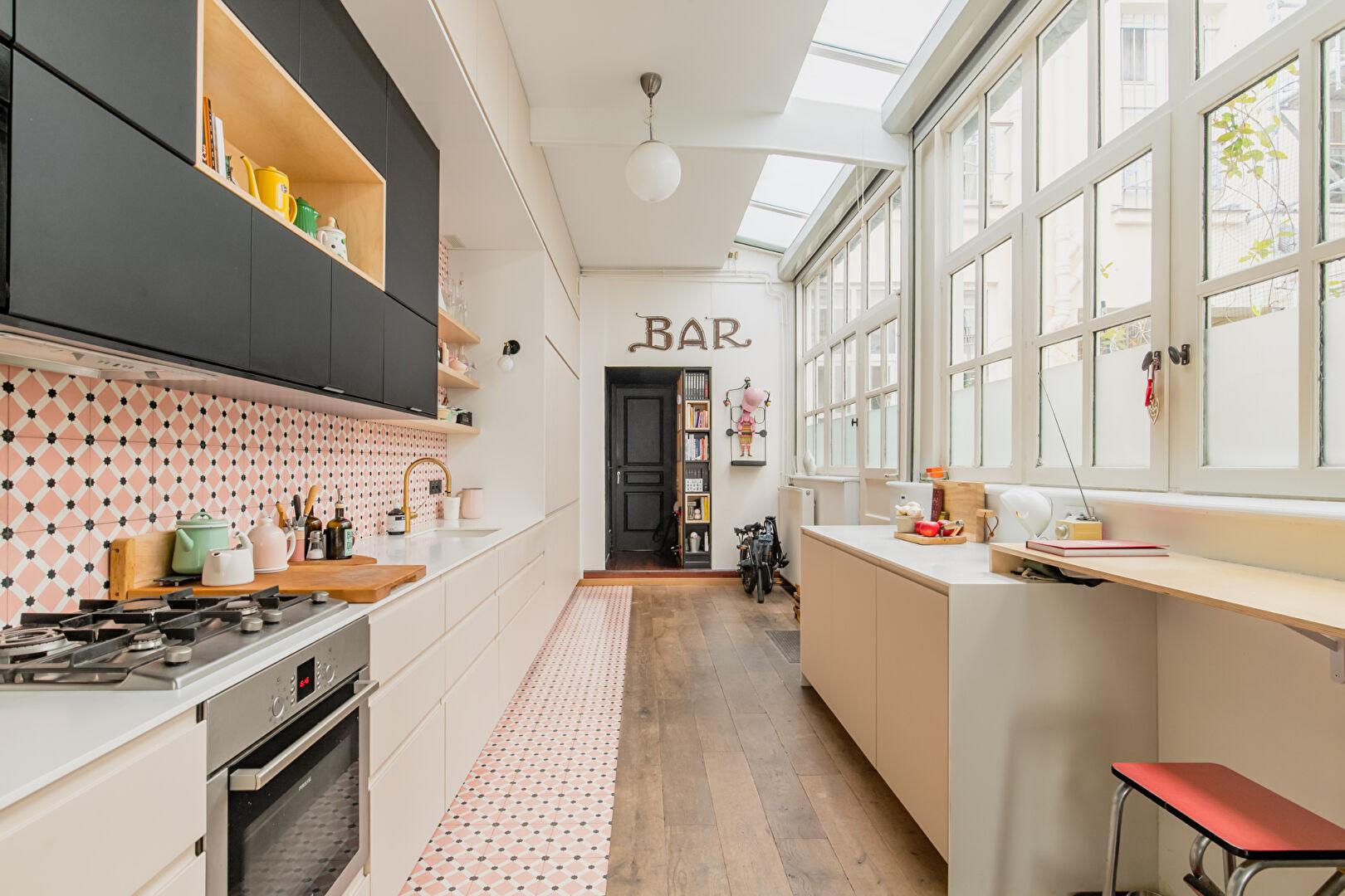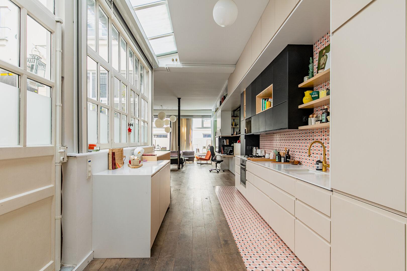 La cuisine, installée sous une verrière zénithale, profite d’une lumière naturelle précieuse qui accentue le caractère atelier du lieu. L’ensemble, ouvert mais structuré, offre un cadre de vie à la fois chaleureux et inspirant.