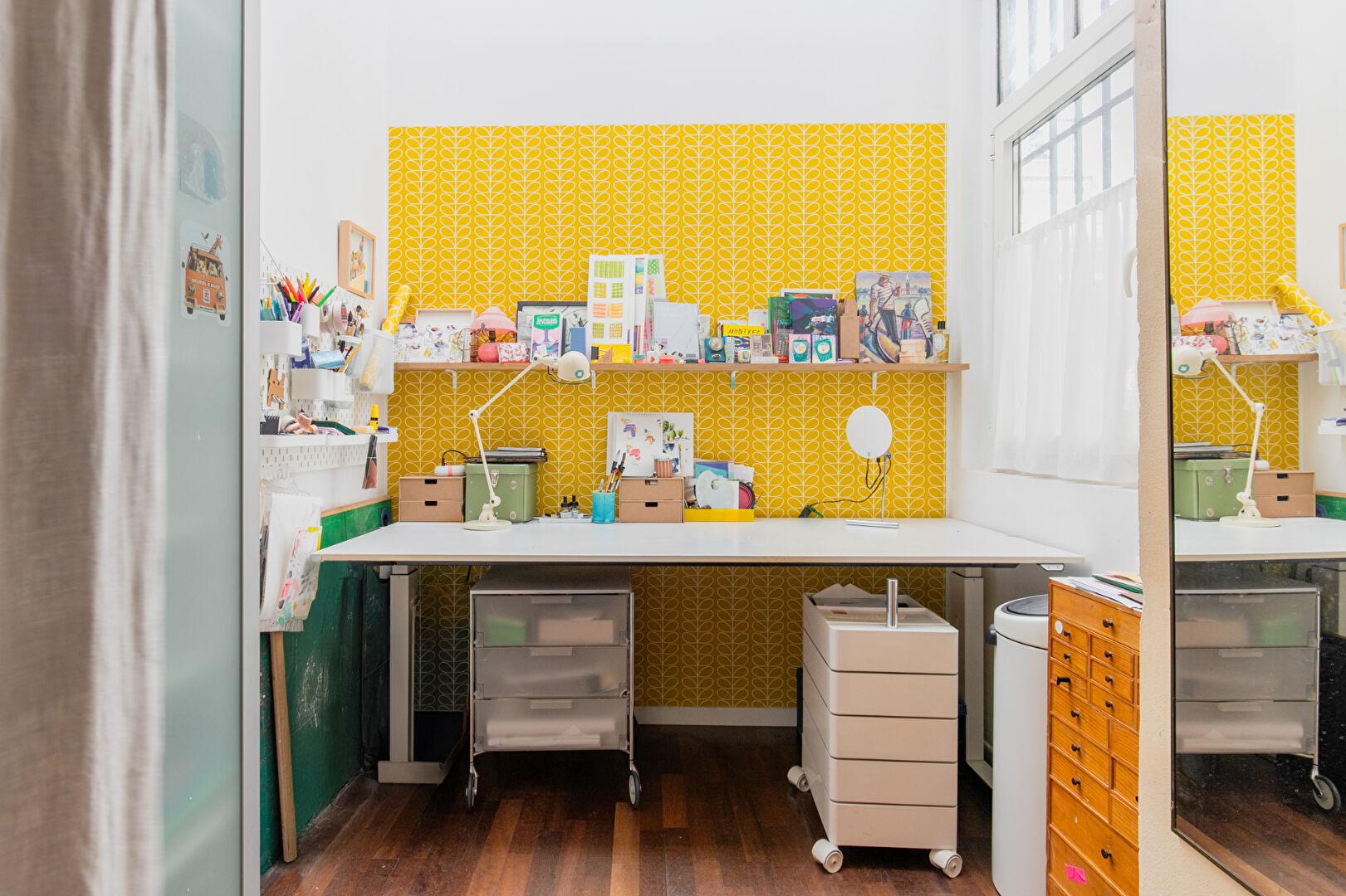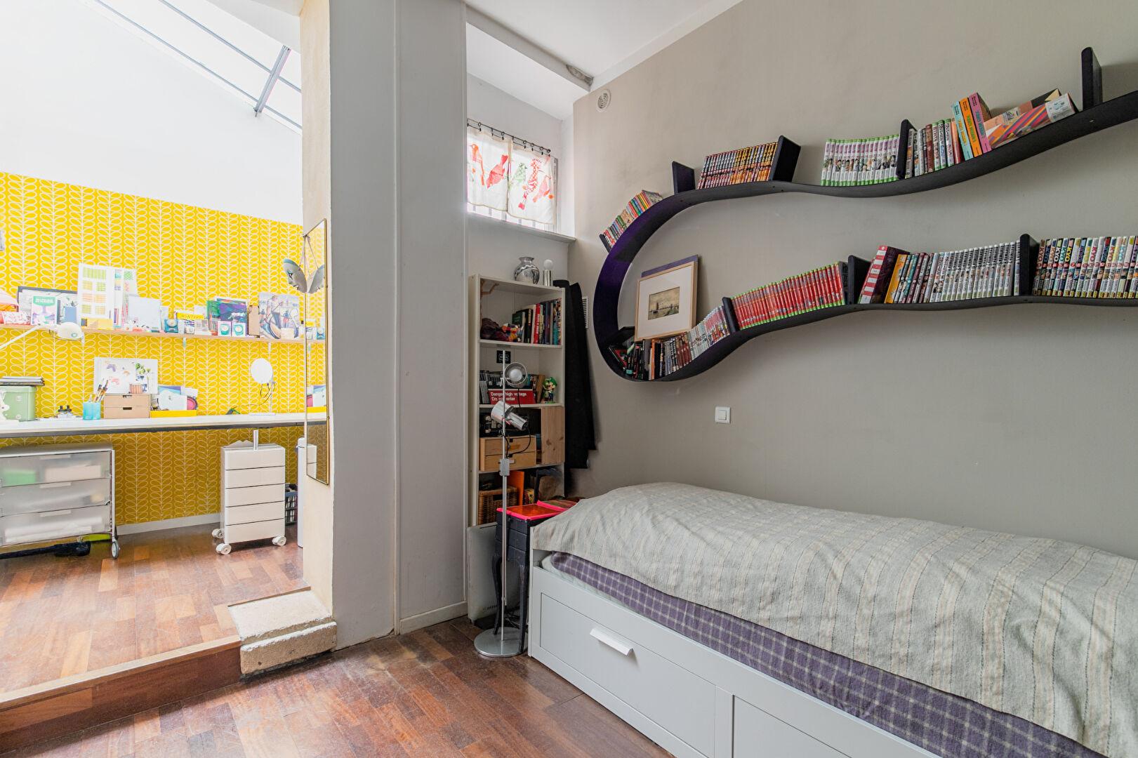 À l’arrière, accessible par une porte qui marque une véritable transition, un dégagement distribue l’espace nuit, volontairement dissocié de la vie quotidienne. Deux chambres de 15m² et 13m² s’y déploient dans une atmosphère plus feutrée, dont l’une accueille un charmant recoin aménagé en bureau atelier créatif.