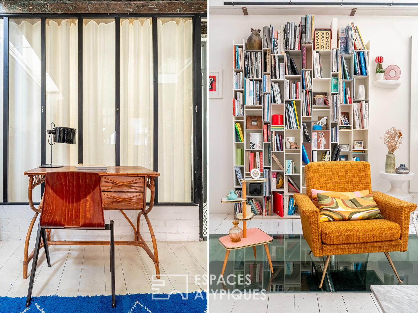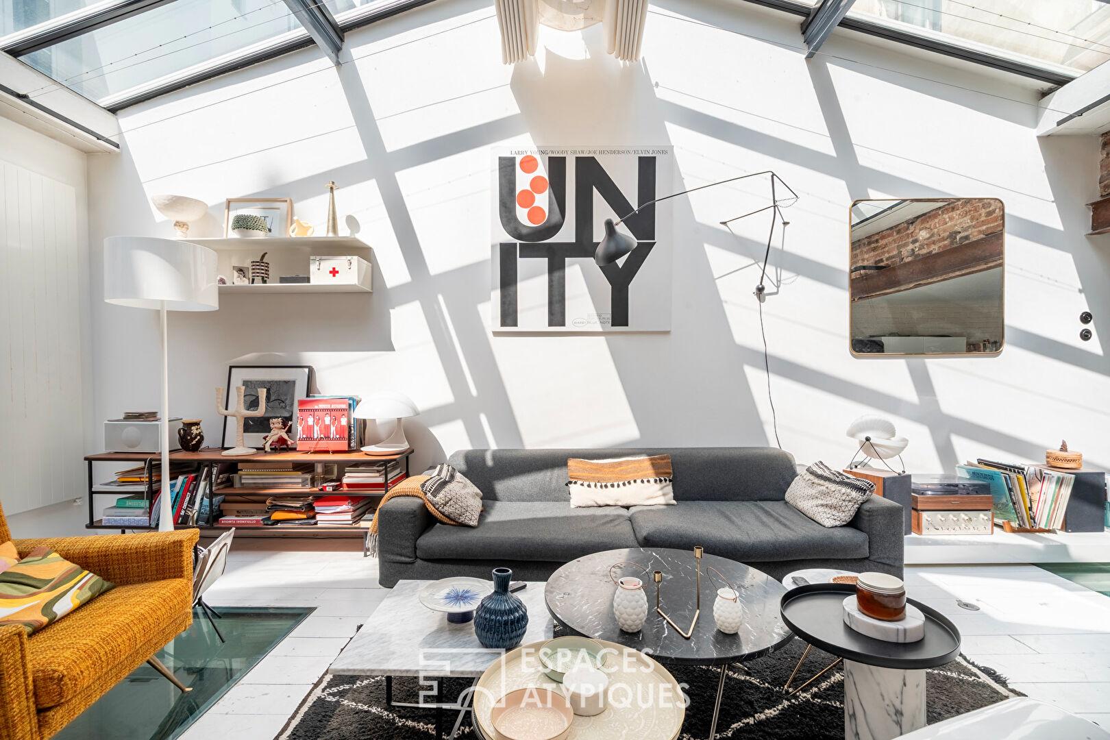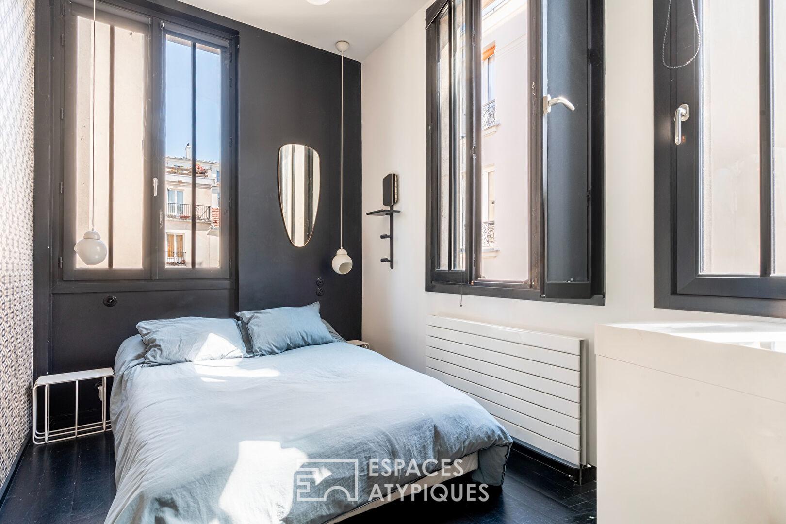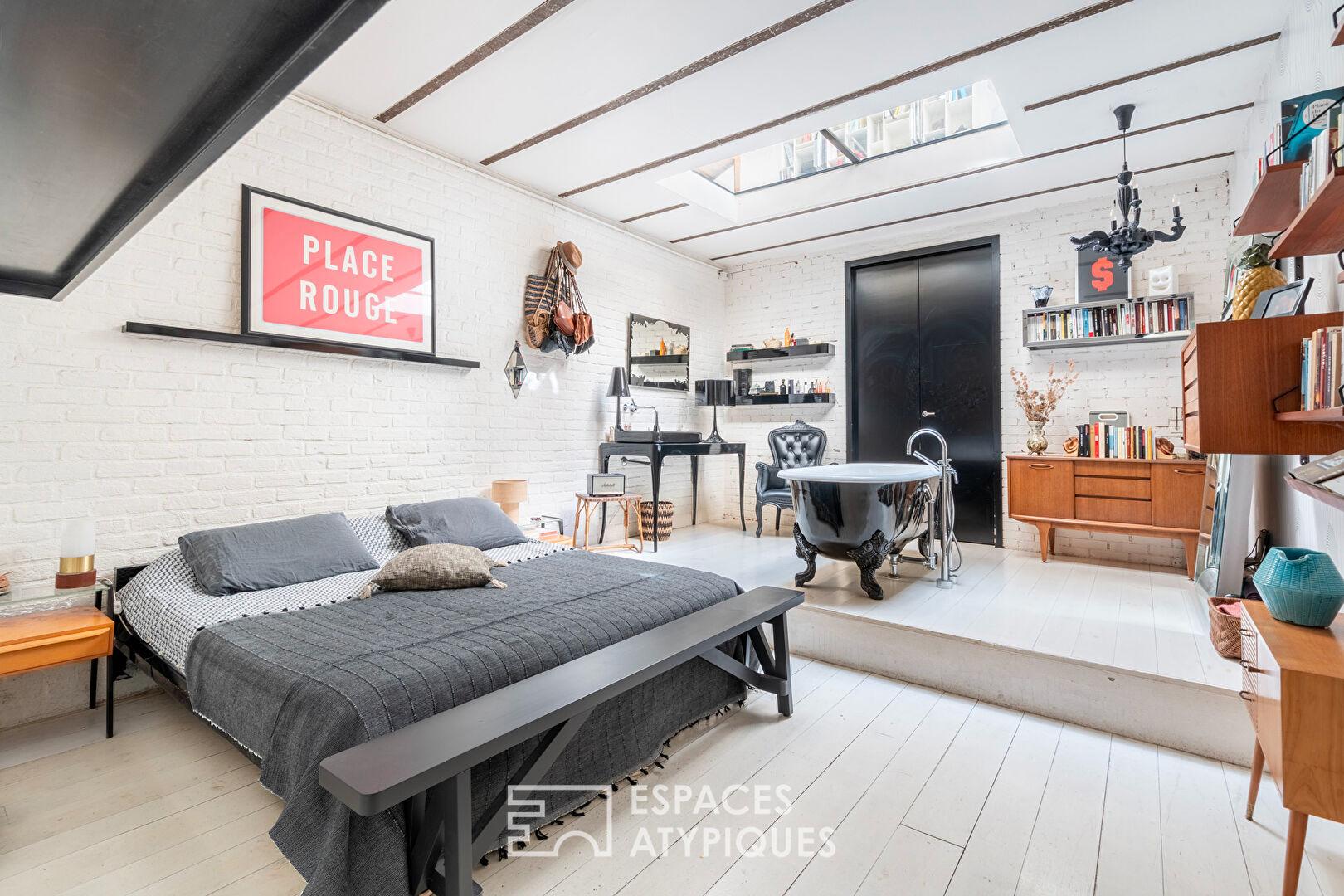 C’est au coeur du vibrant quartier de la Bastille, entre les rues de Charonne et de la Roquette, que se cache ce triplex singulier, fruit de la réhabilitation d’une ancienne manufacture de 1890.