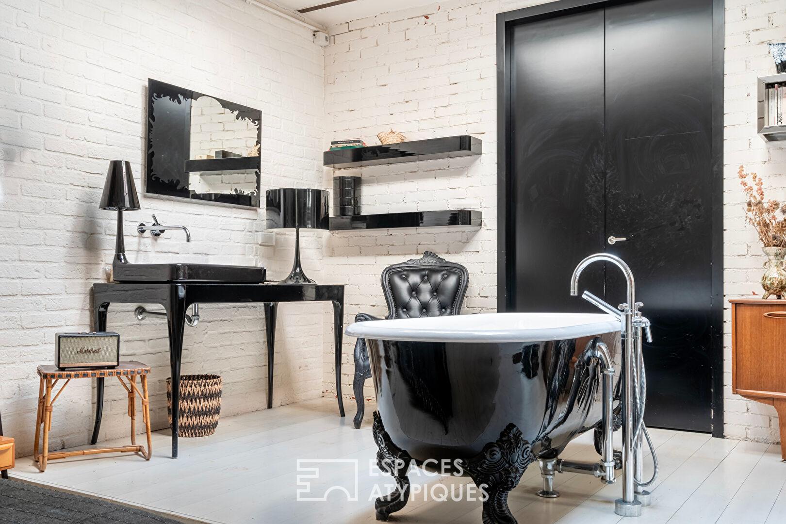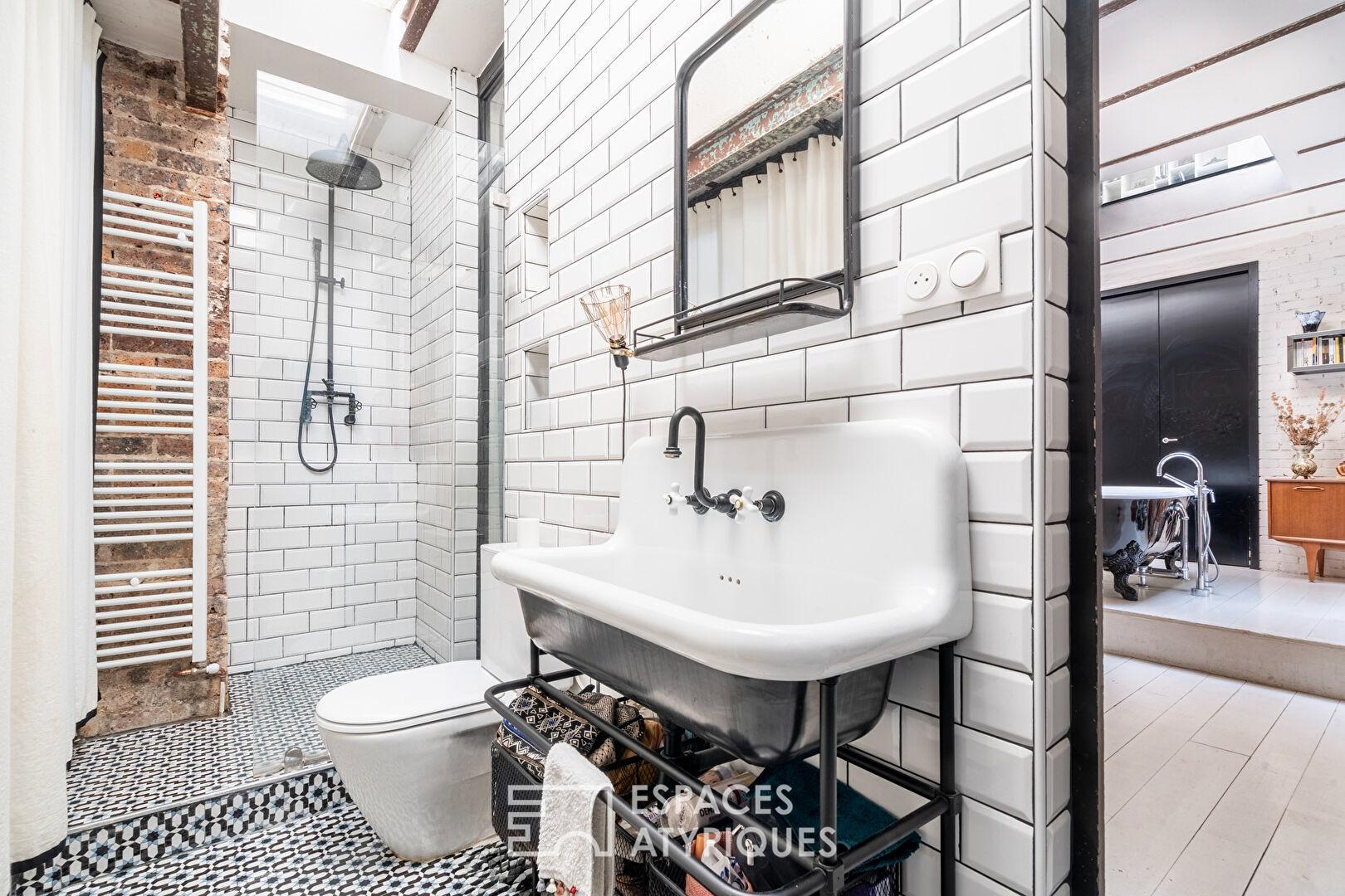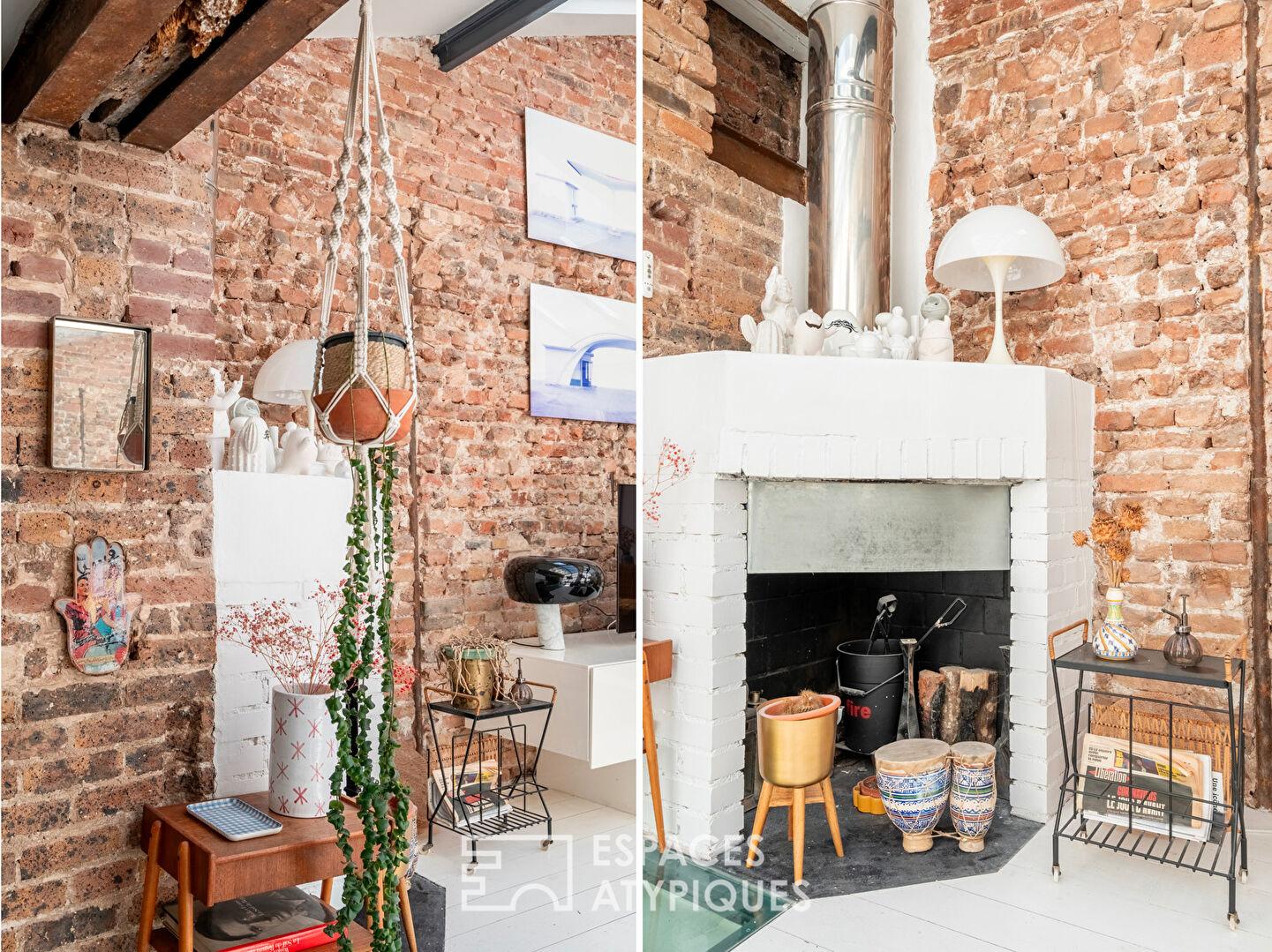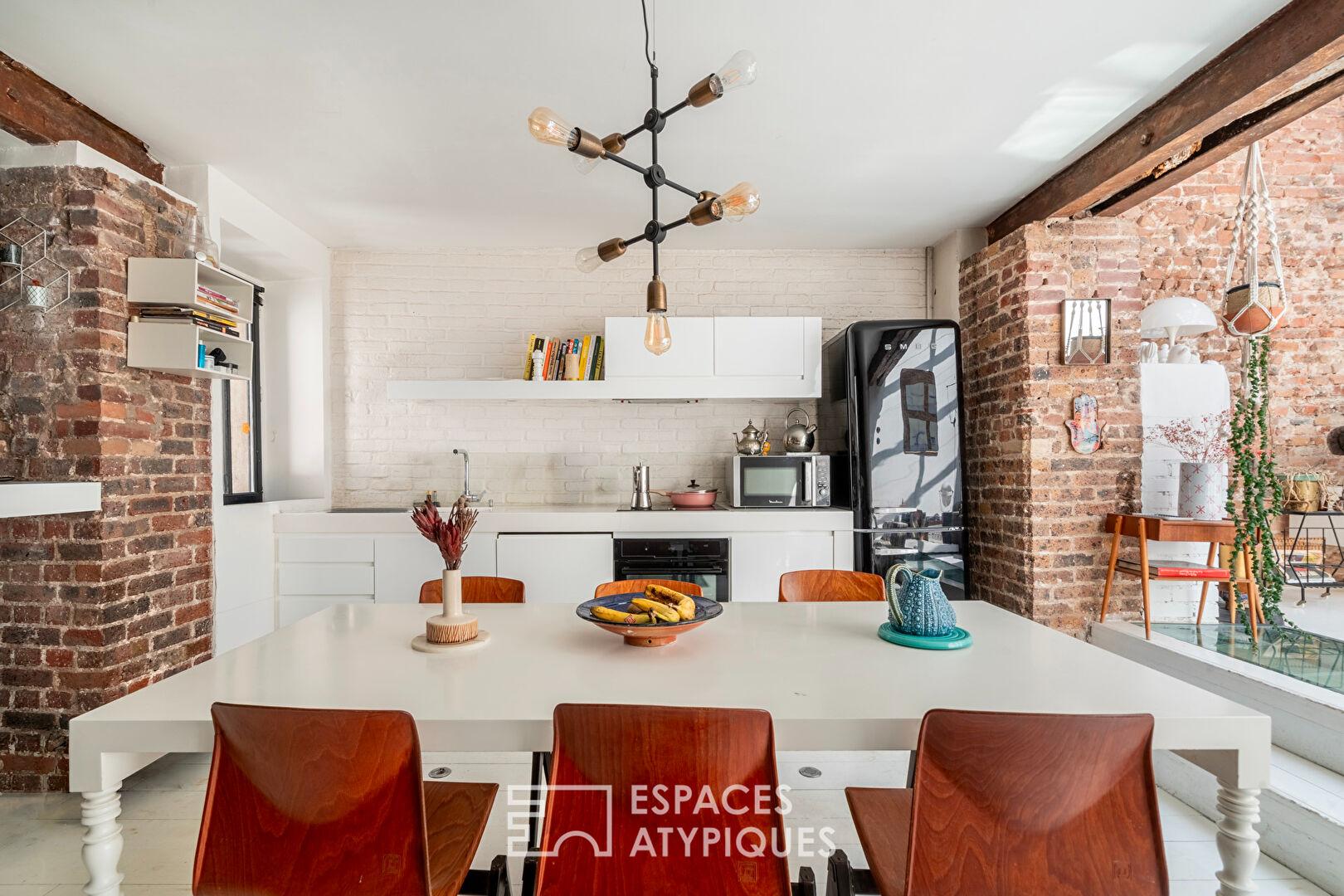 Au calme absolu d’une cour pavée confidentielle, ce lieu de vie exprime une identité forte où les matériaux bruts du passé, briques apparentes, murs en pierre et poutres d’époque, dialoguent avec un escalier métallique magistral.