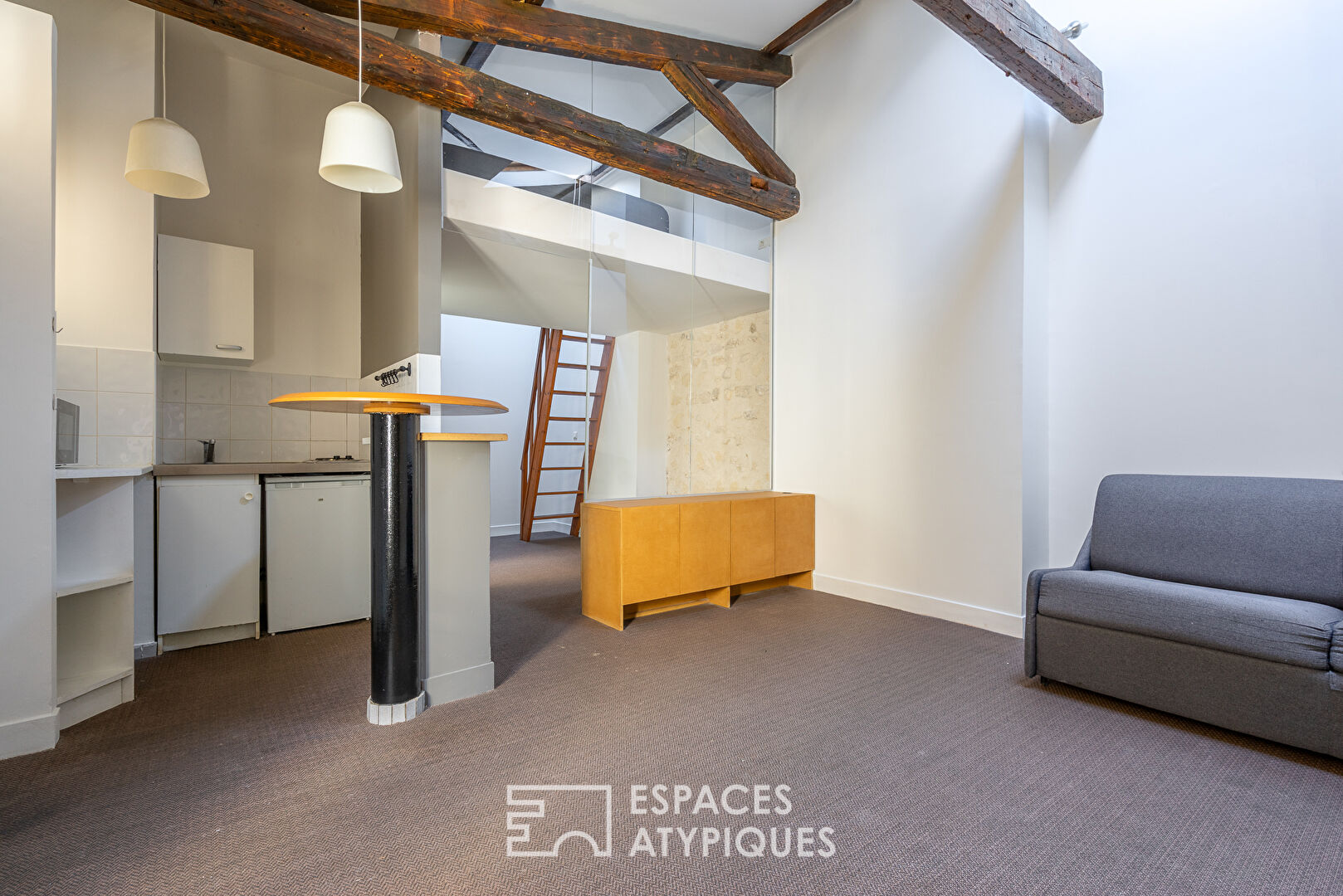 Niché au bout d’une impasse pavée et calme, ce studio de 31 m² joue la carte de l’originalité avec brio. Un cocon confidentiel, en plein cœur du 11ème arrondissement, qui assume pleinement son caractère hors normes.