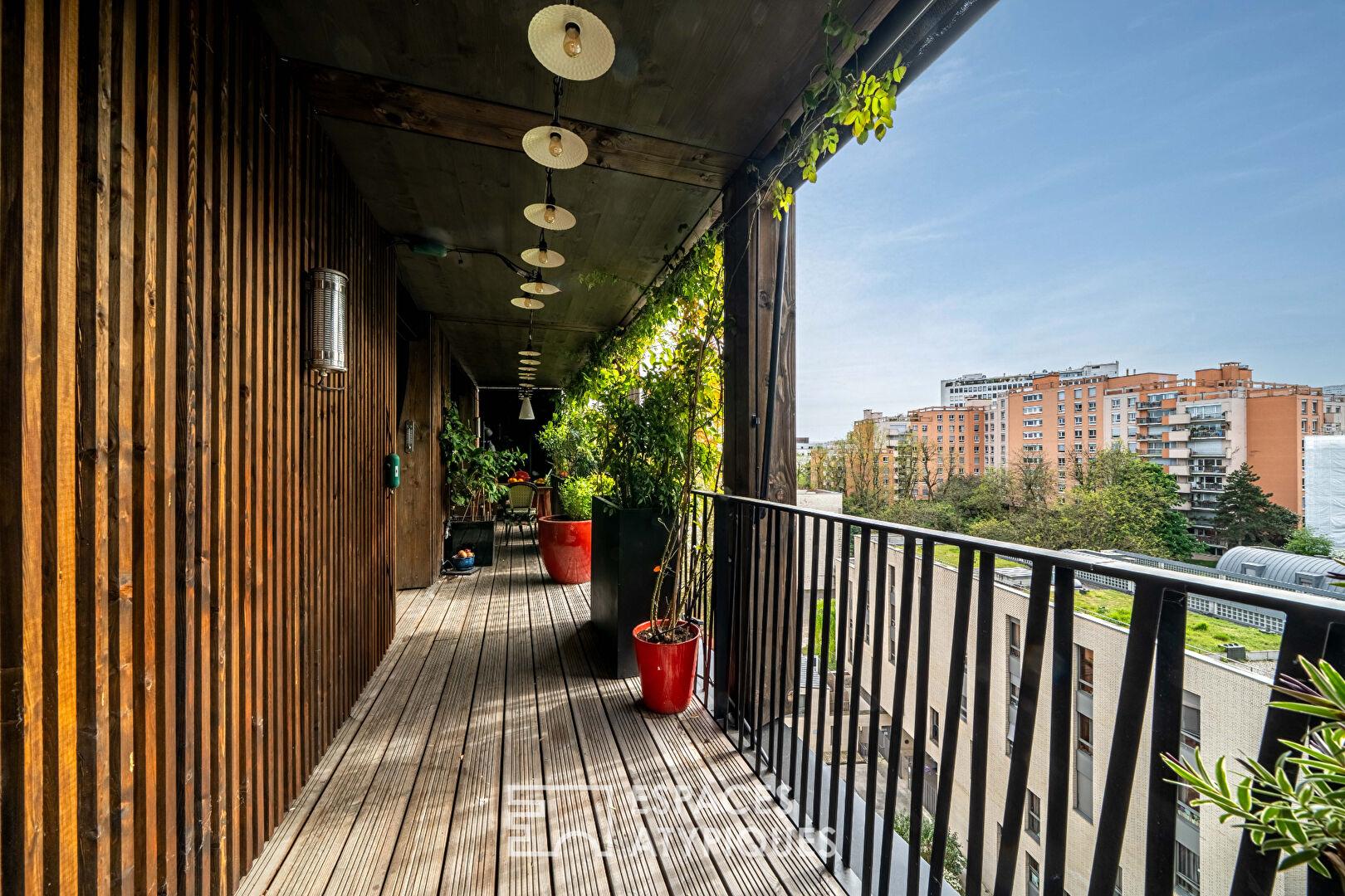 Au coeur du quartier dynamique de la Bibliothèque François Mitterrand et dans un immeuble récent à l’esthétique singulière, ce duplex d’exception aux deux derniers étages, desservi par deux ascenseurs, se dévoile sur 125,95 m2 (123,7 m2 Carrez) ouvrant sur 46 m2 de terrasses.