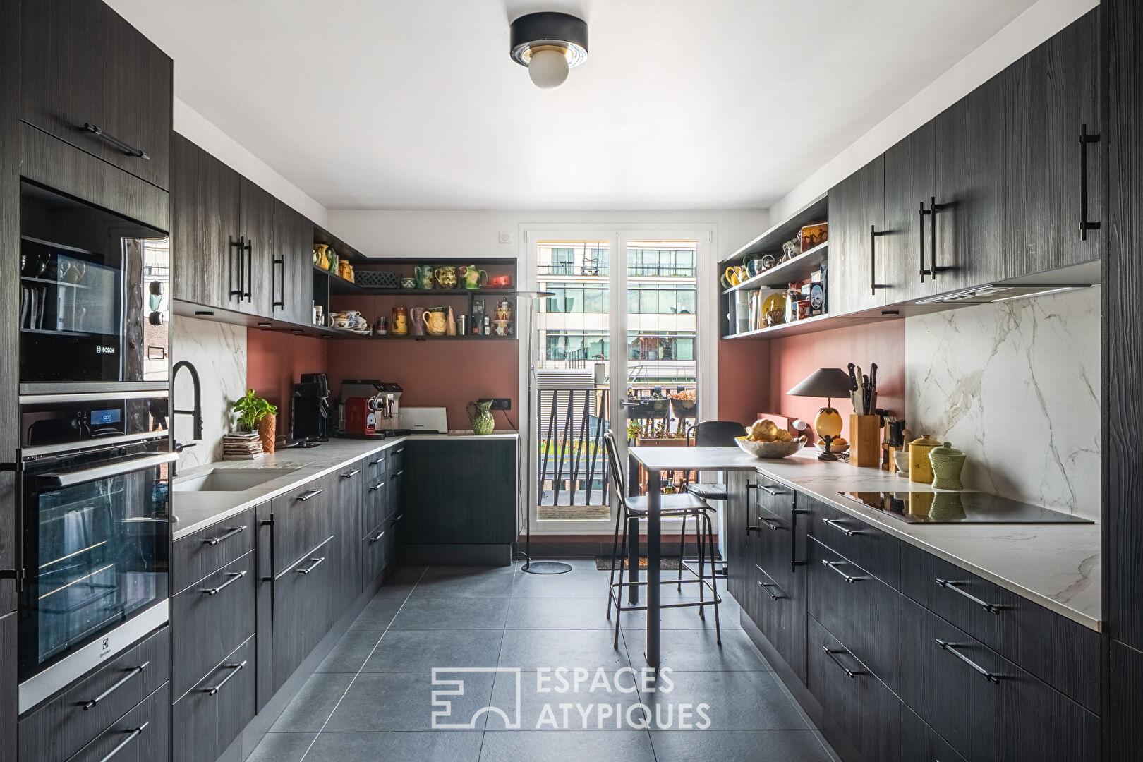 Cet appartement traversant s’articule autour de deux niveaux reliés par un escalier sculptural qui définit l’espace avec élégance et fait face à une bibliothèque sur mesure. Au 5ème étage, le séjour exposé sud-ouest, baigné de lumière, donne accès à une terrasse de plus de 18 m2 pour des dîners au coucher de soleil. Le séjour communique par une double porte avec une grande cuisine moderne aux finitions haut de gamme et aux teintes sombres et chaleureuses. Une chambre et sa salle d’eau complètent ce niveau.