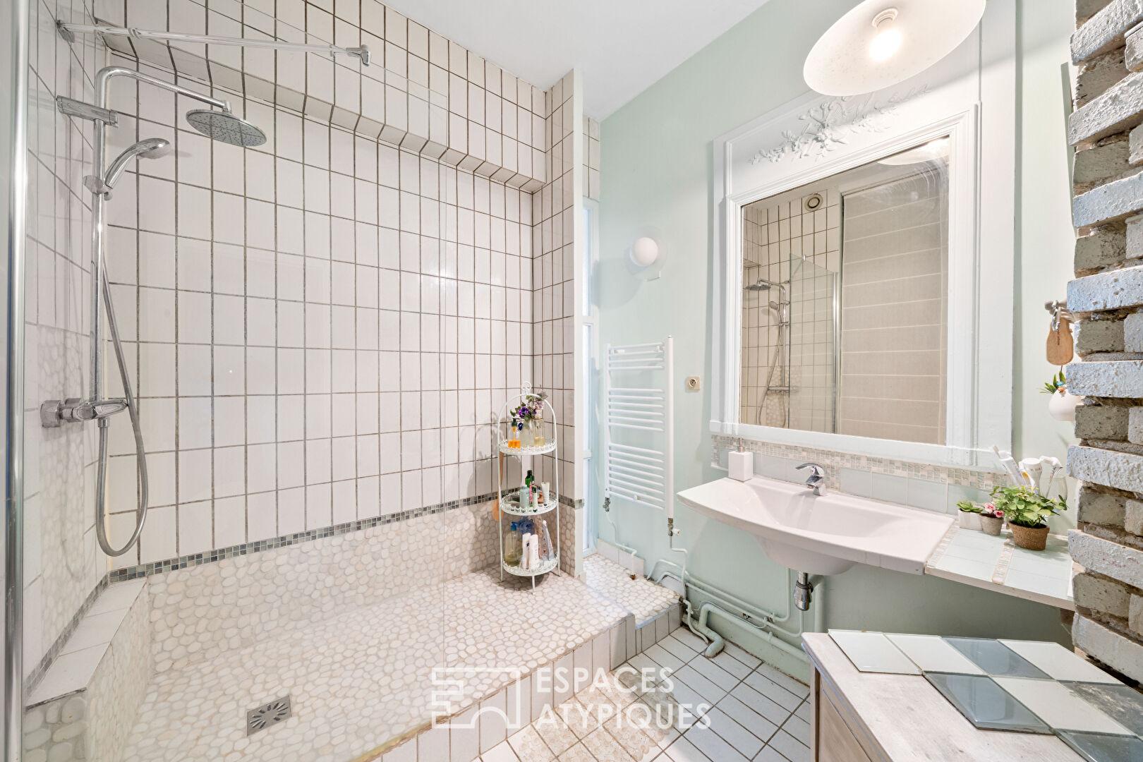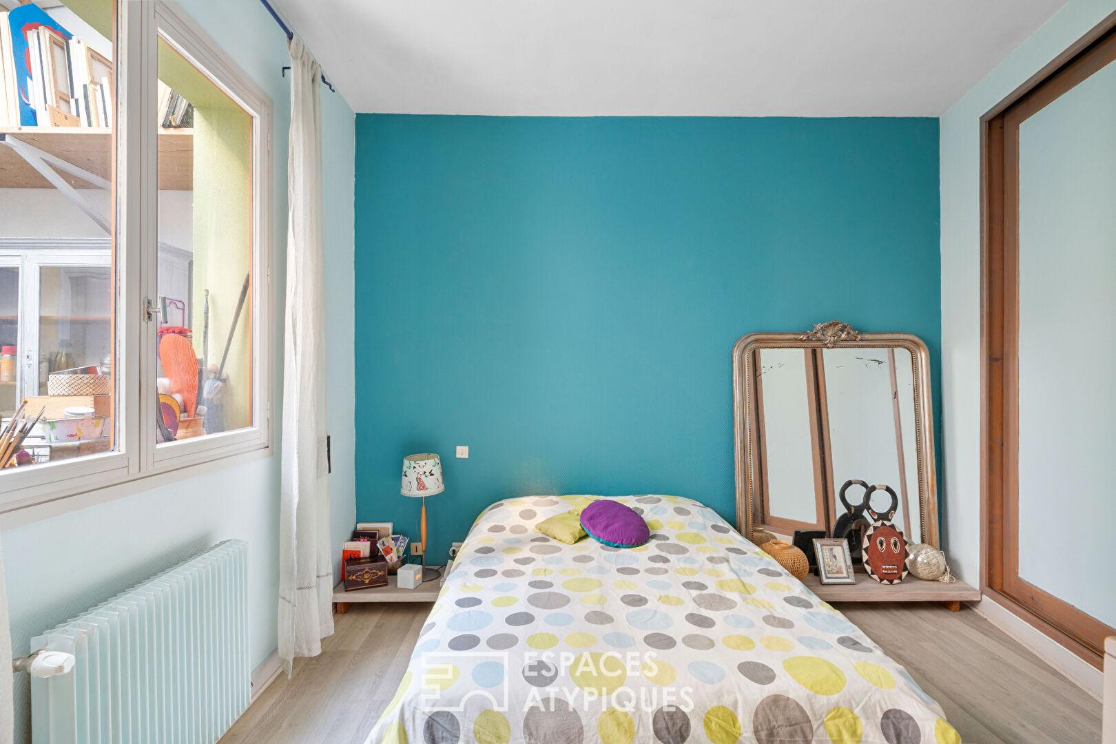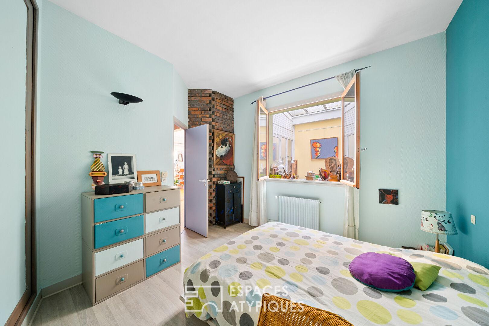 Ce lieu de vie s’organise sur deux niveaux tournés vers la lumière. Le rez-de-chaussée dévoile un espace de réception de 45 m², dont l’atmosphère y est résolument créative : l’alliance des textures brutes, des murs de briques et des structures boisées, créant un décor à la fois chaleureux et graphique. Ce niveau dessert également une cuisine séparée par une verrière artisanale, une chambre, une salle d’eau et un patio intérieur, véritable puits de lumière servant aujourd’hui d’atelier d’artiste.