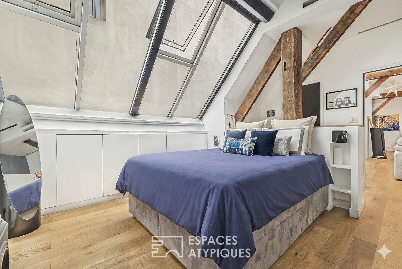 L’entrée dévoile une pièce de vie spectaculaire sublimée par des poutres apparentes, véritable colonne vertébrale de l’habitation. Ce vaste séjour cuisine de près de 130 m² dispose de proportions impressionnantes. Il est baigné de lumière naturelle filtrant à travers une large verrière de style atelier renforçant l’esprit loft parisien.
