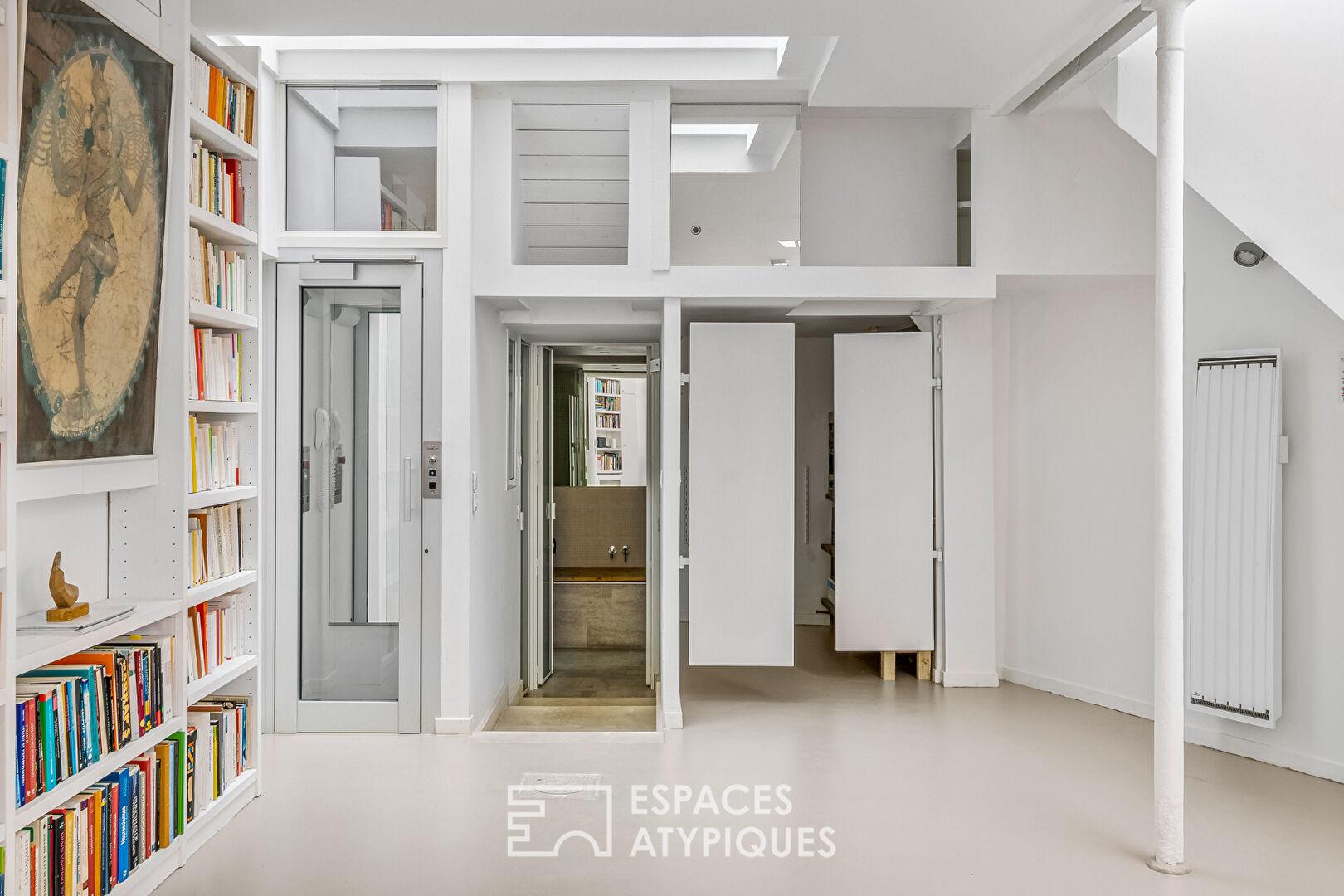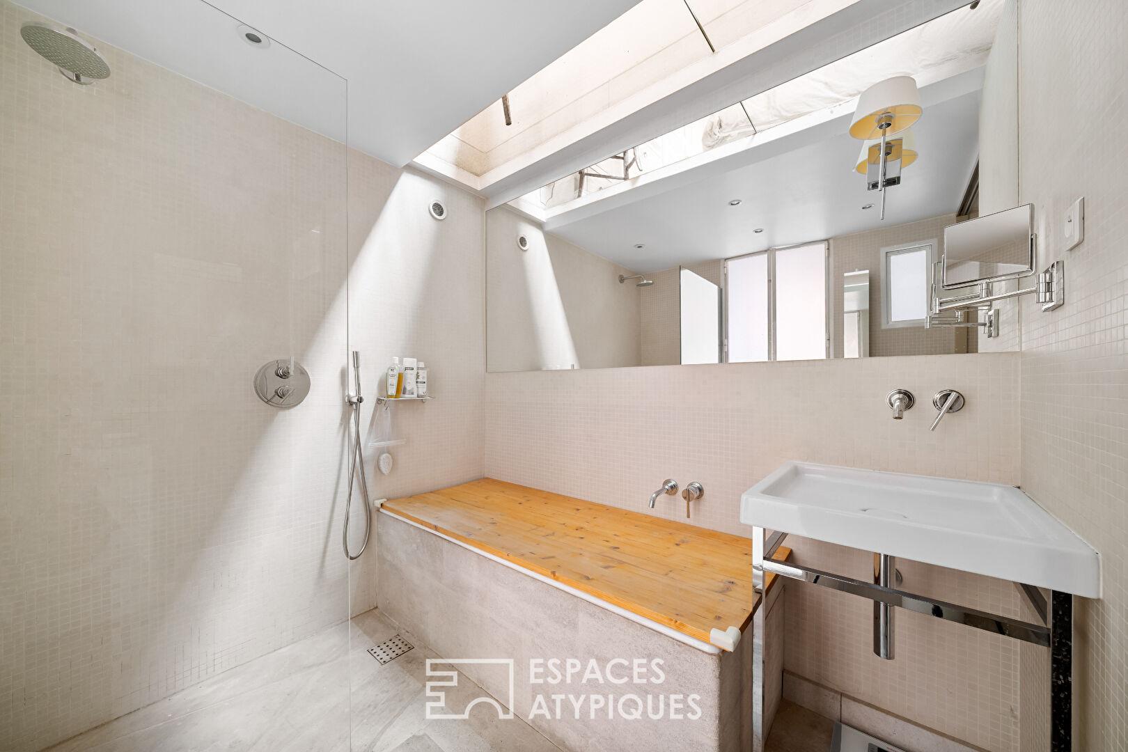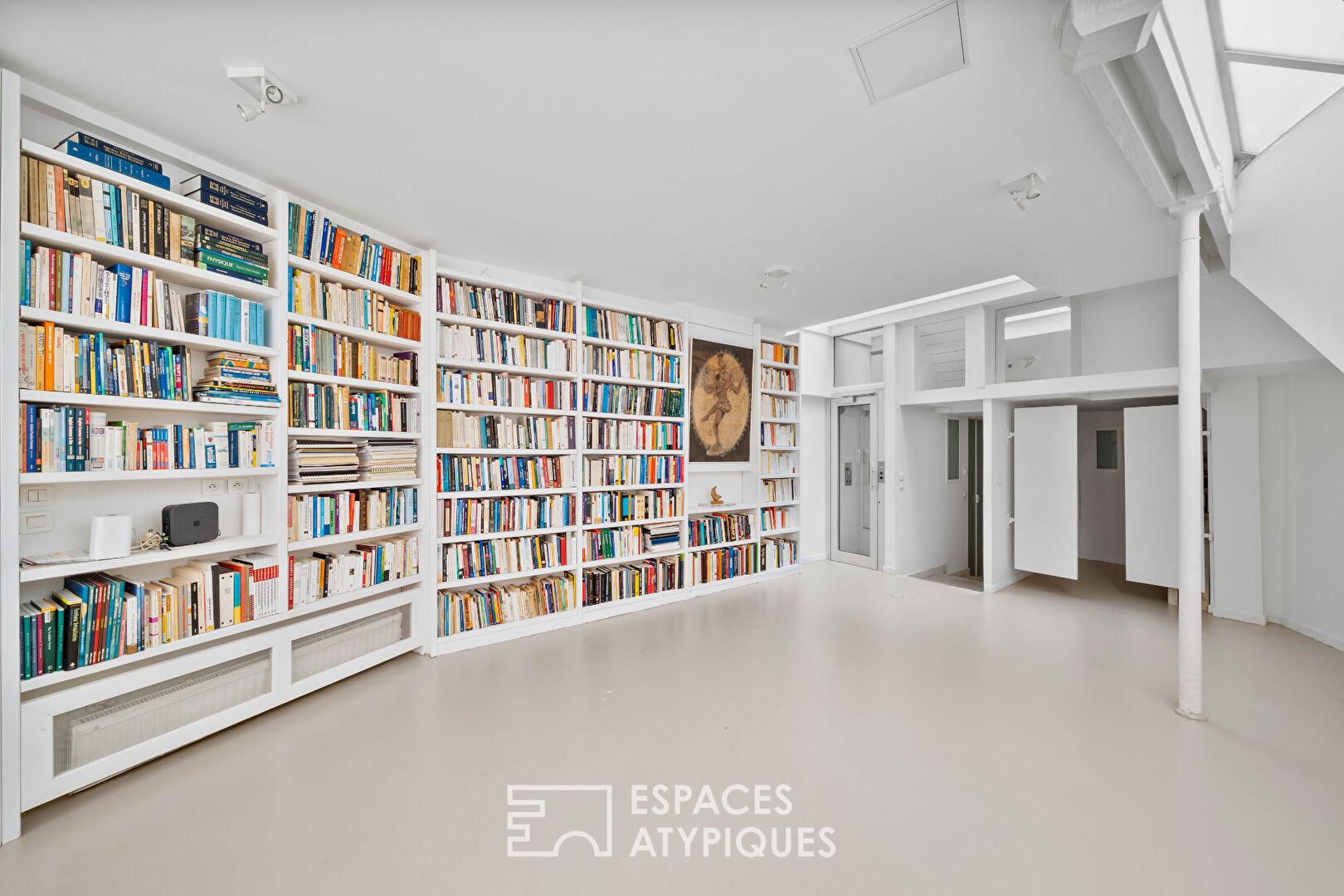 Le premier niveau est entièrement dédié à l’atelier, vaste espace de création qui peut être aménagé au gré de ses envies. Eclairé par une lumière zénithale et par une verrière d’atelier, cet espace bénéficie d’un entrée indépendante et se voit prolongé par une salle de bains.