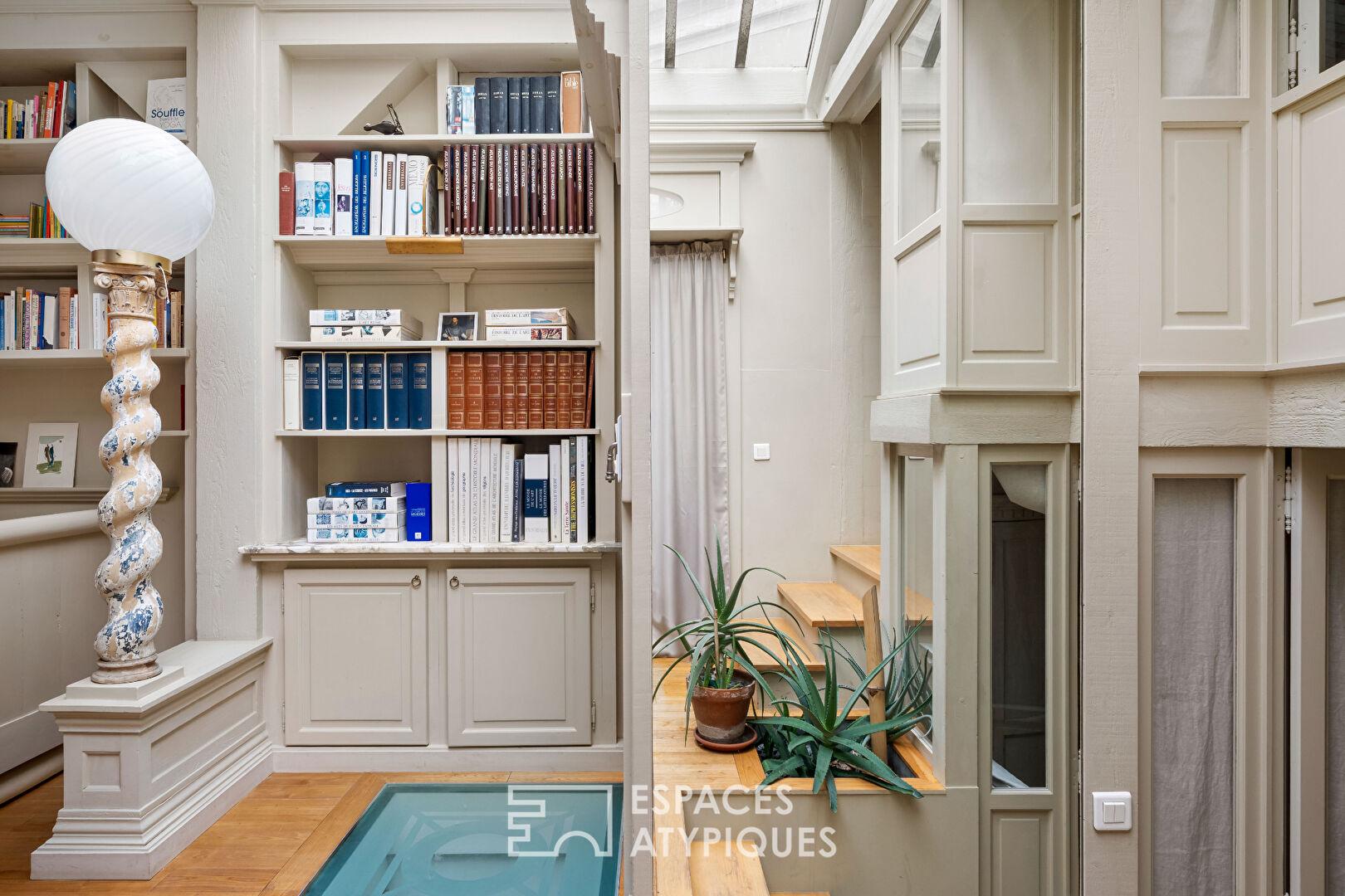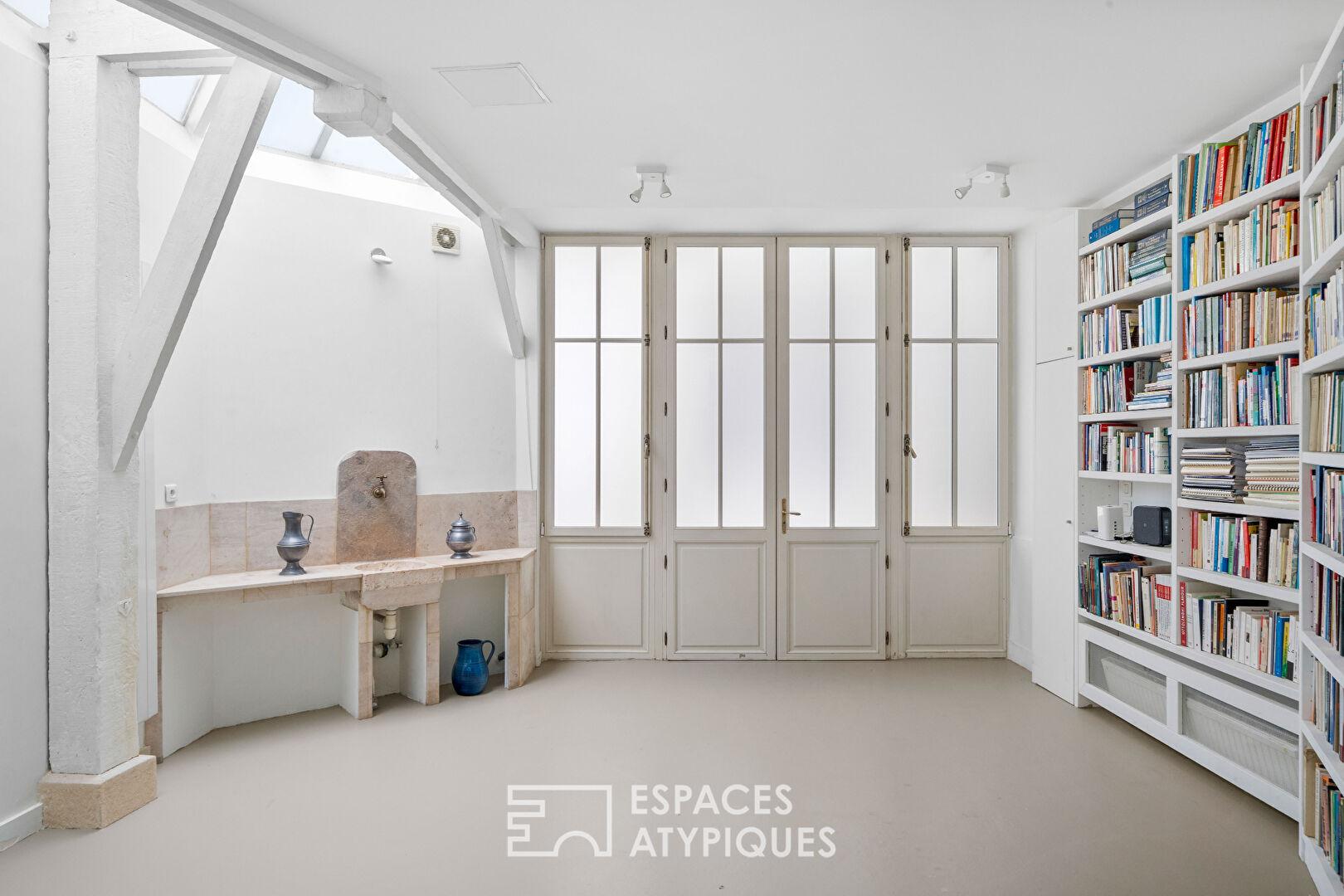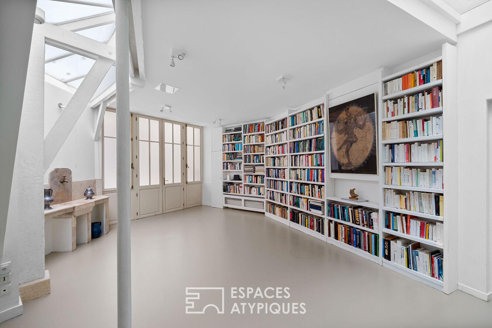 À l’étage, le charme opère immédiatement : verrière zénithale, belle hauteur sous plafond, ornements sculptés et charpente apparente témoignent de l’histoire artistique du lieu et lui confèrent une atmosphère unique.
