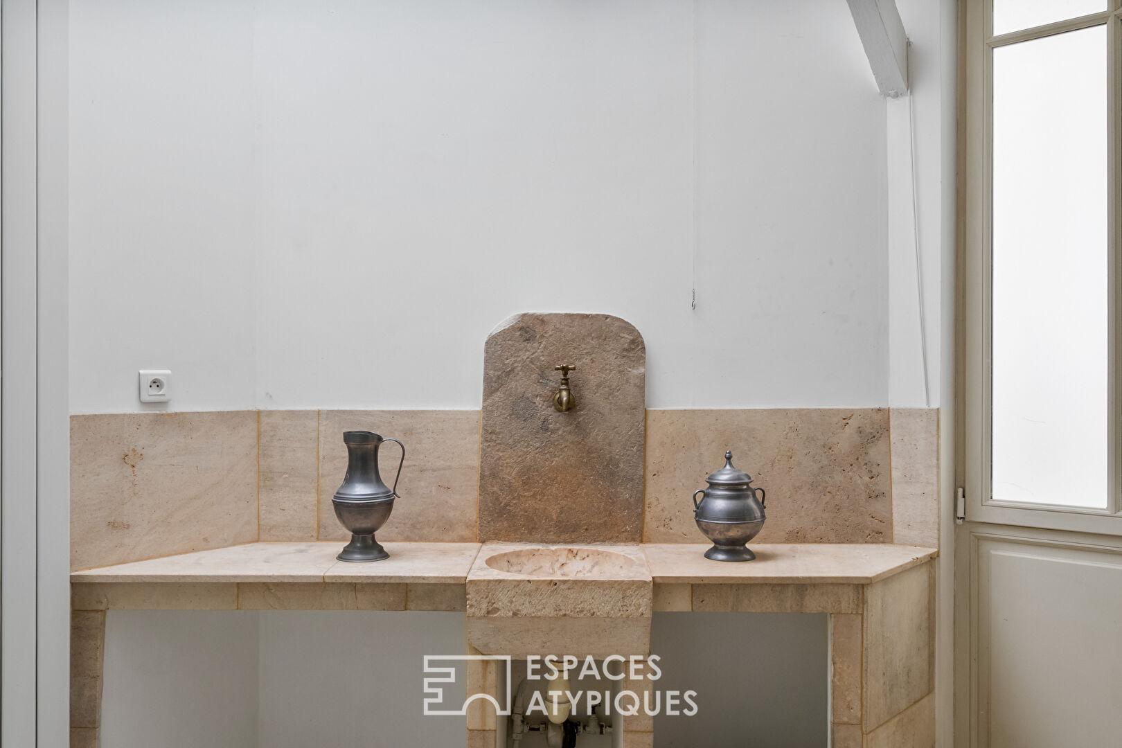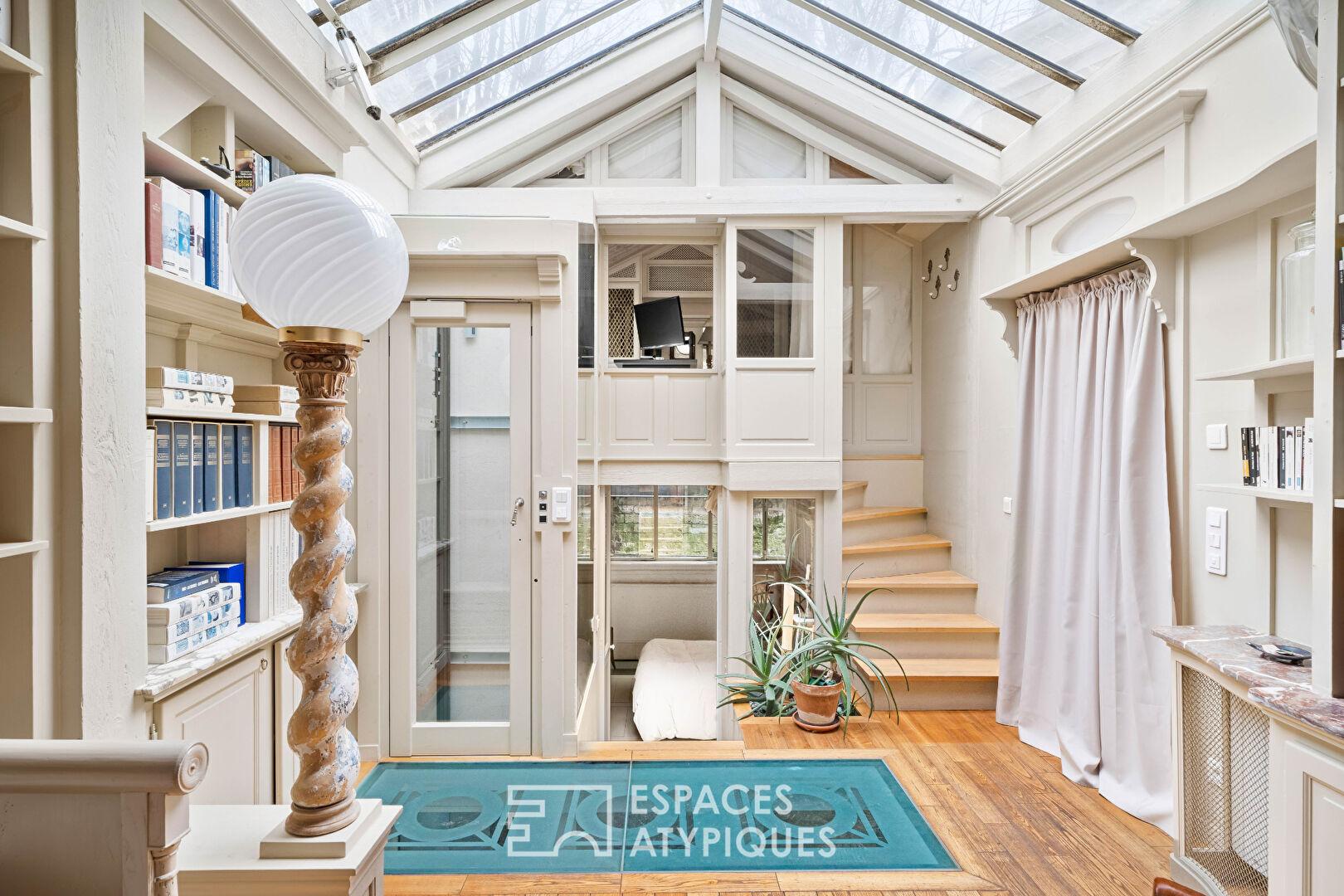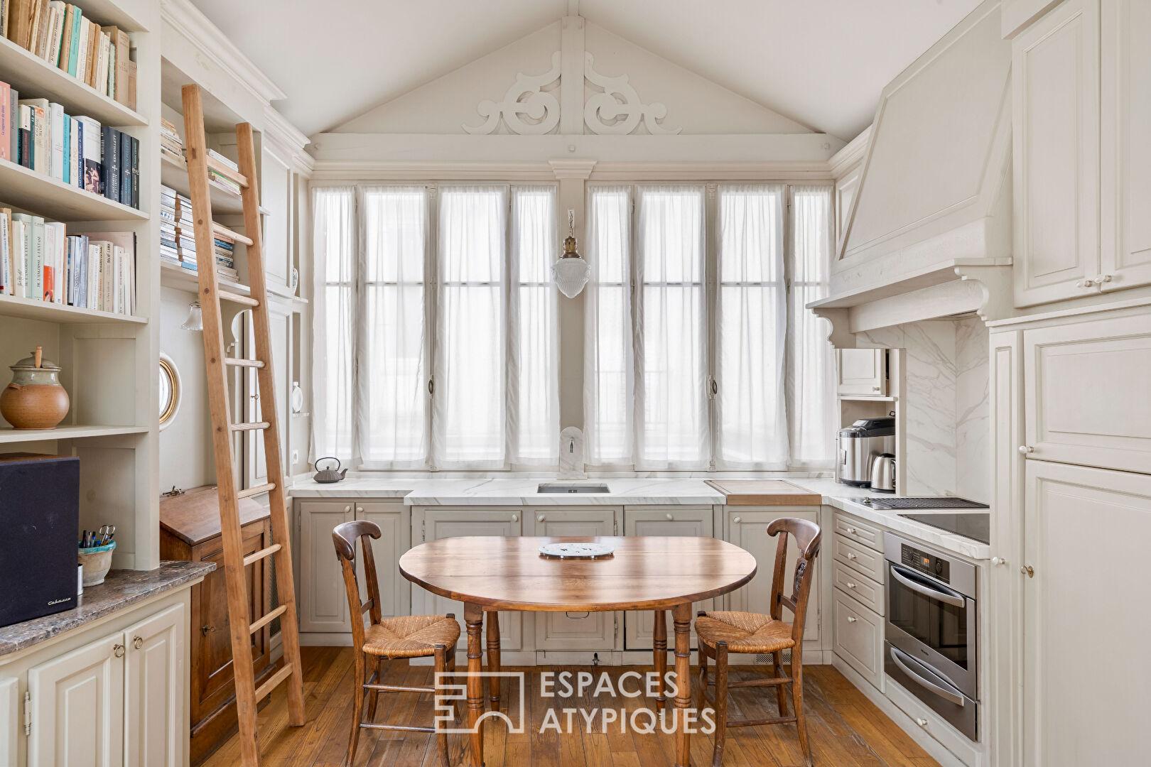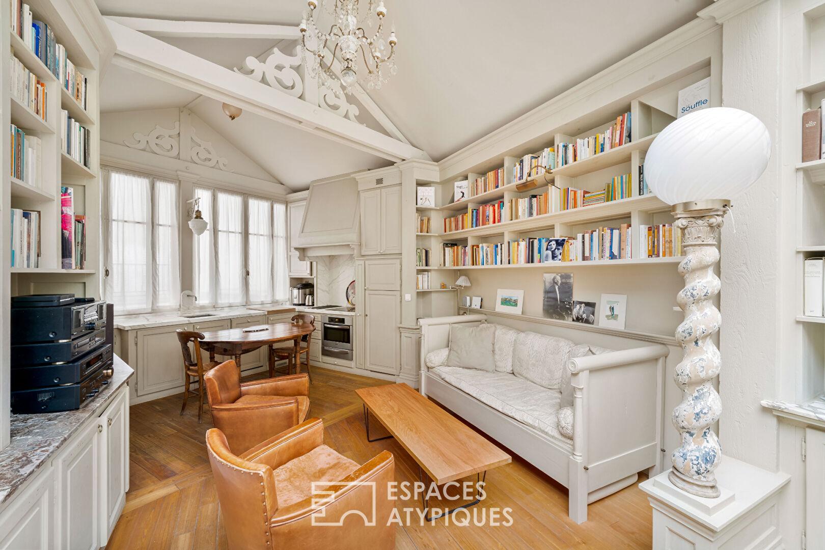 À l’étage, le charme opère immédiatement : verrière zénithale, belle hauteur sous plafond, ornements sculptés et charpente apparente témoignent de l’histoire artistique du lieu et lui confèrent une atmosphère unique.