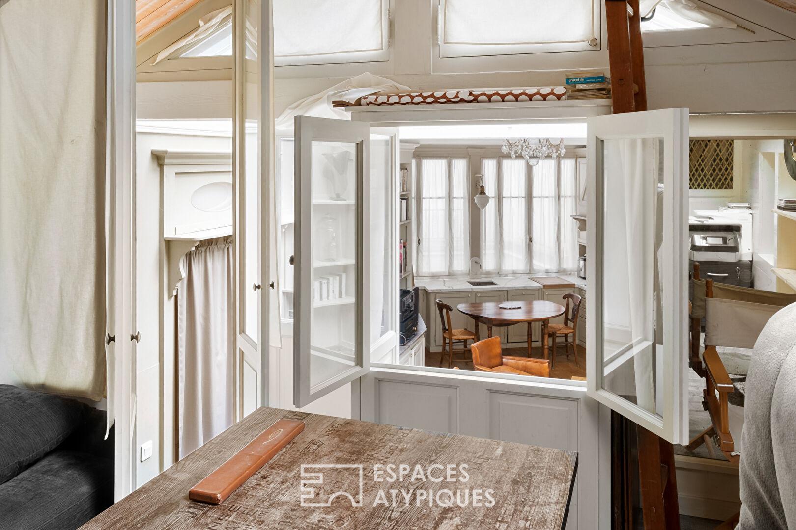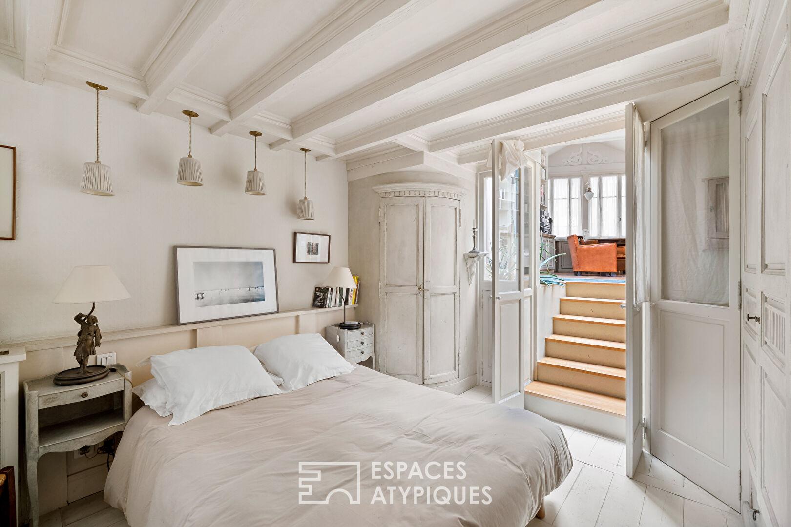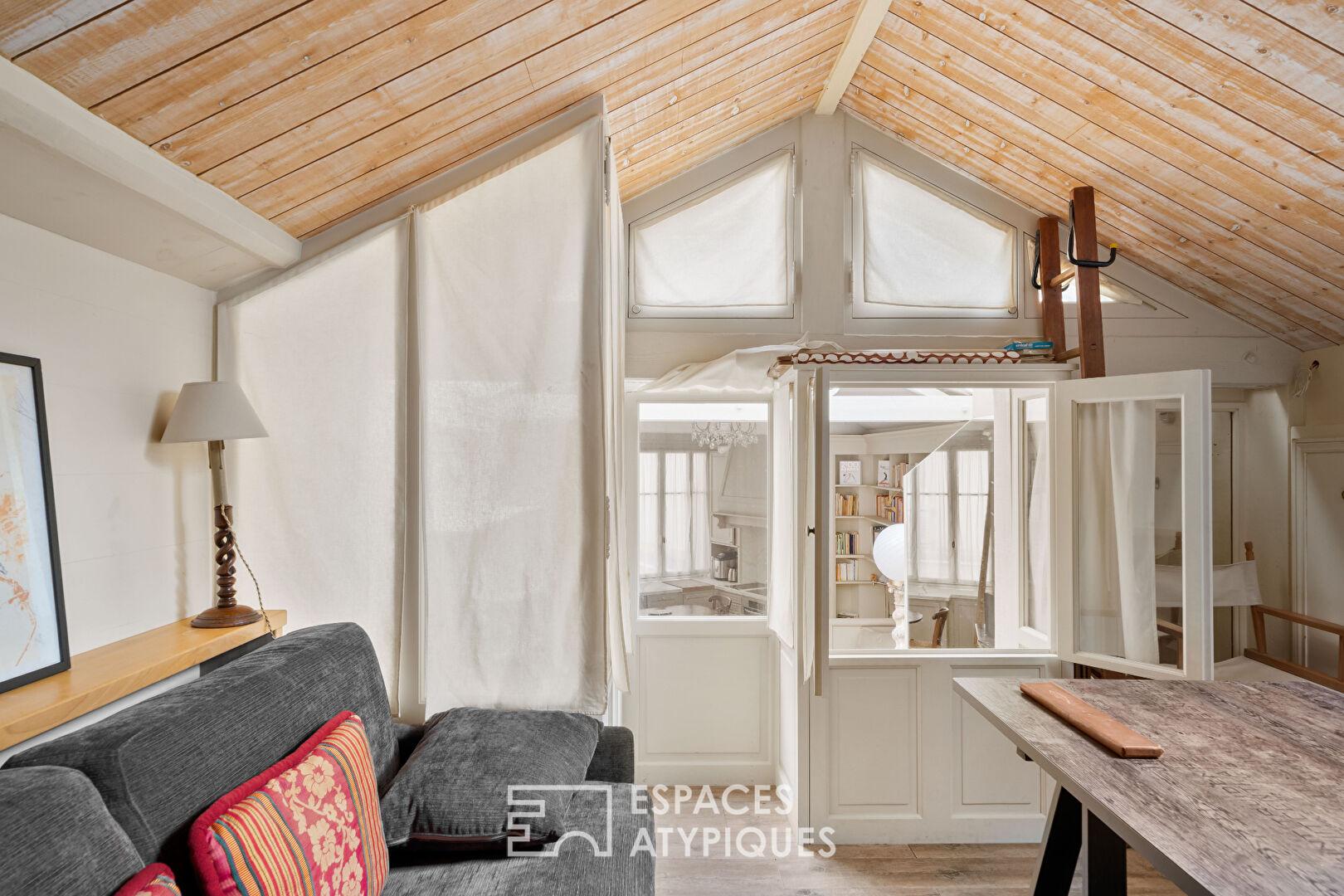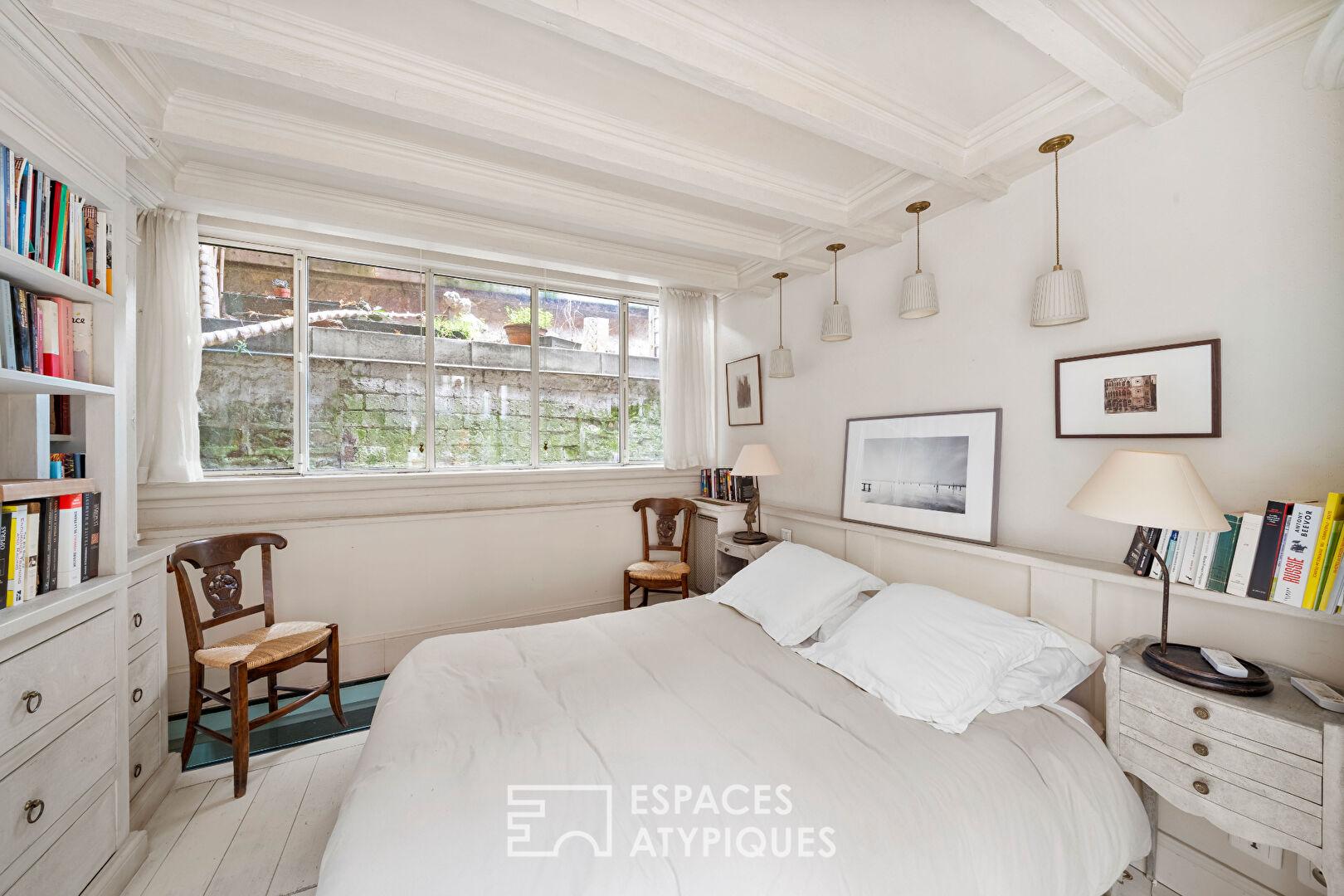 Dans son prolongement, une chambre avec rangements s’intègre harmonieusement à l’ensemble. Une seconde chambre en mezzanine vient surplomber l’a pièce de vie, renforçant le caractère atypique de ce bien rare et singulier.
