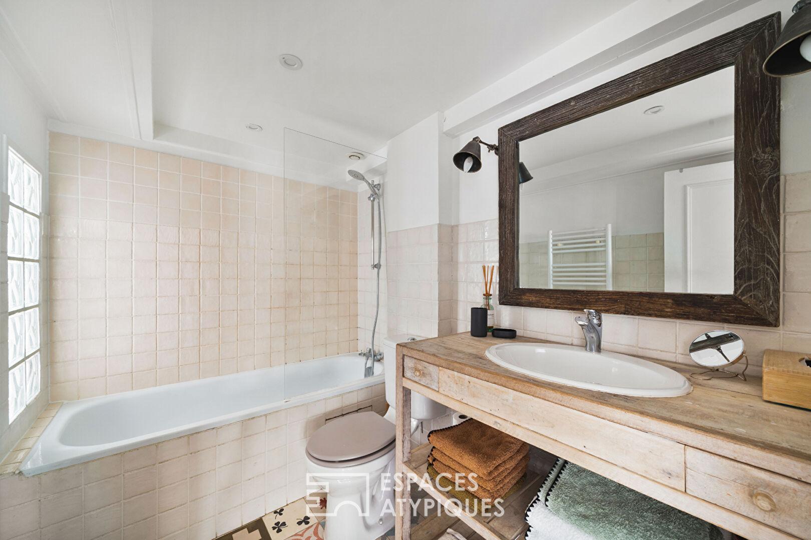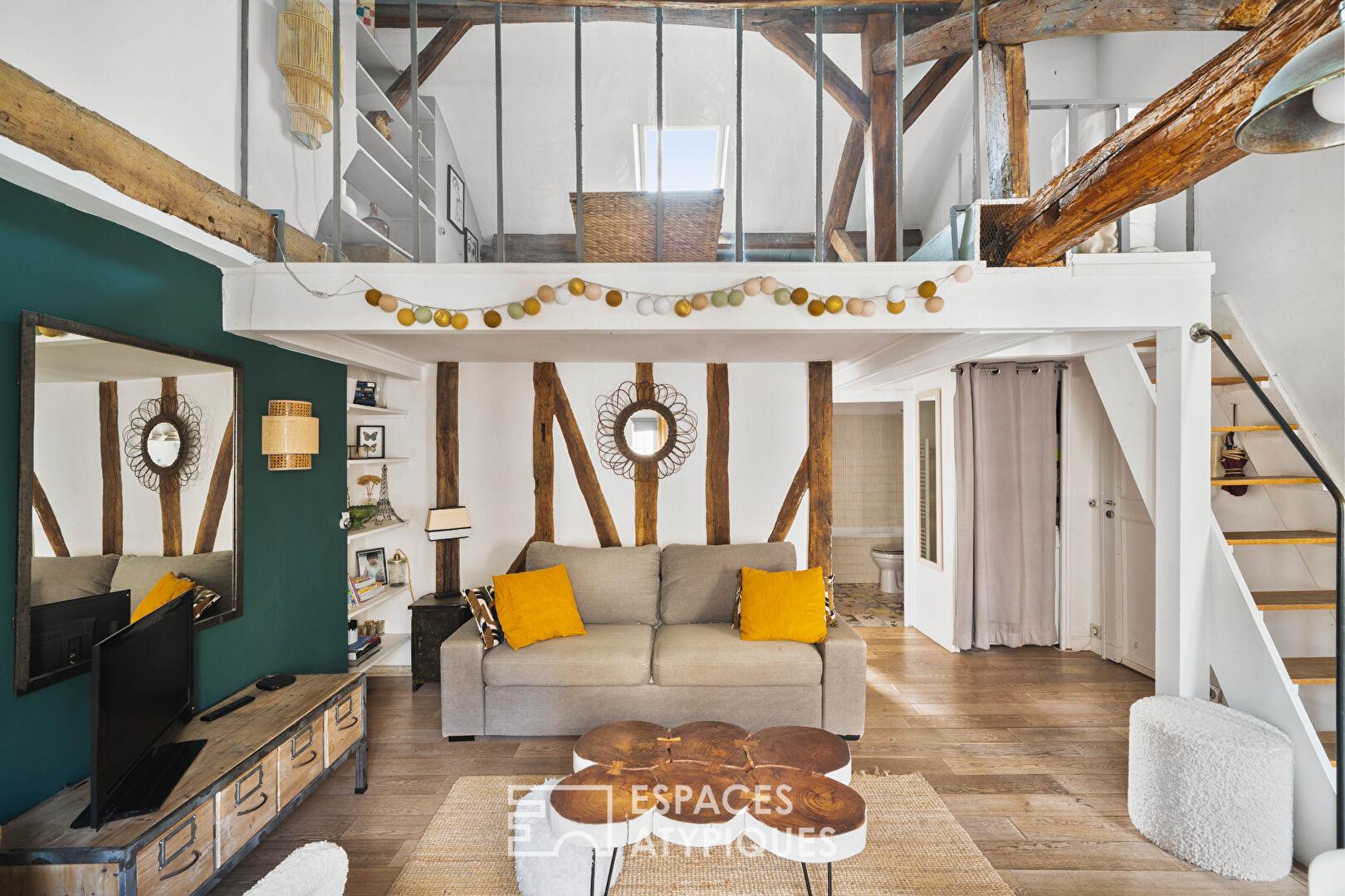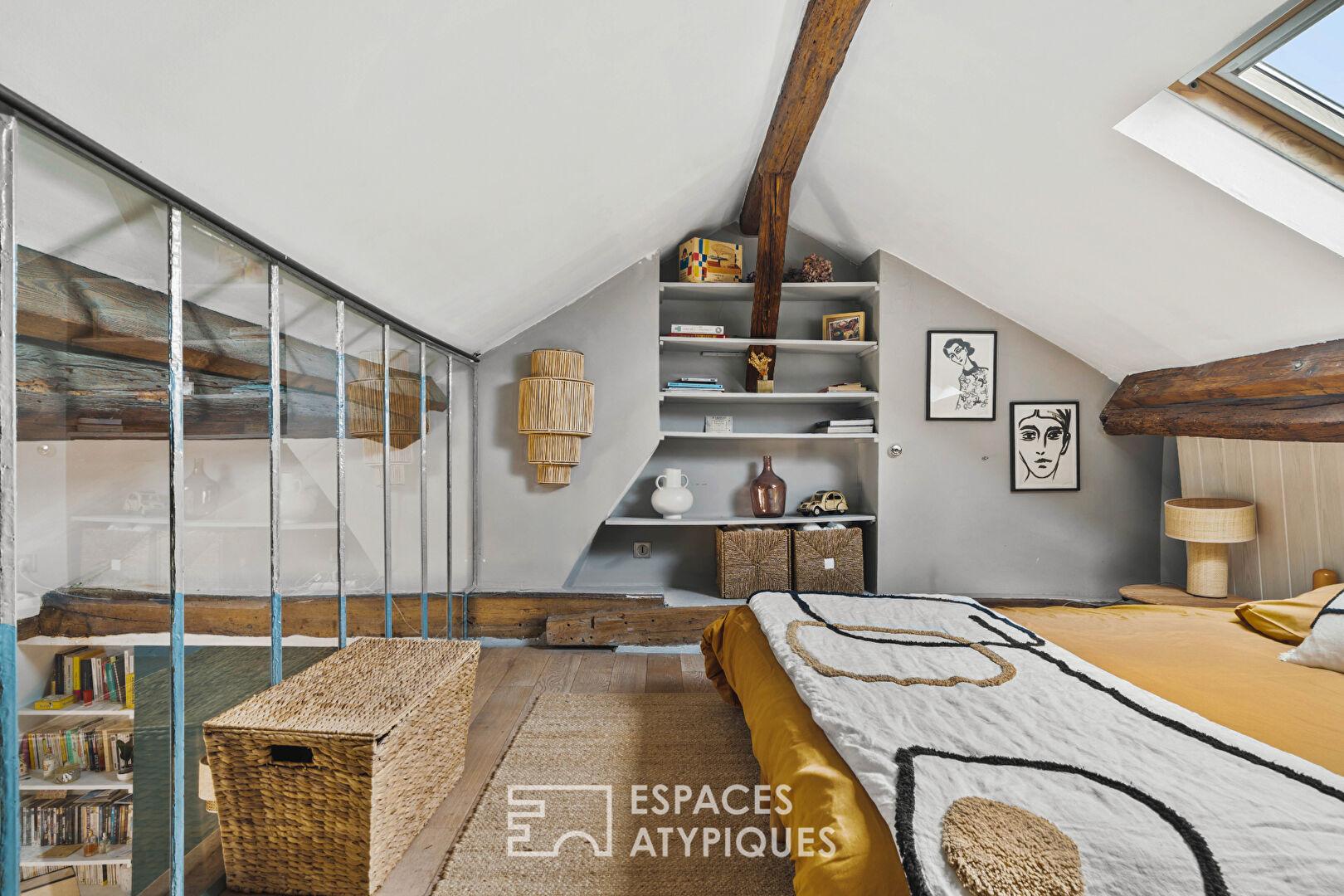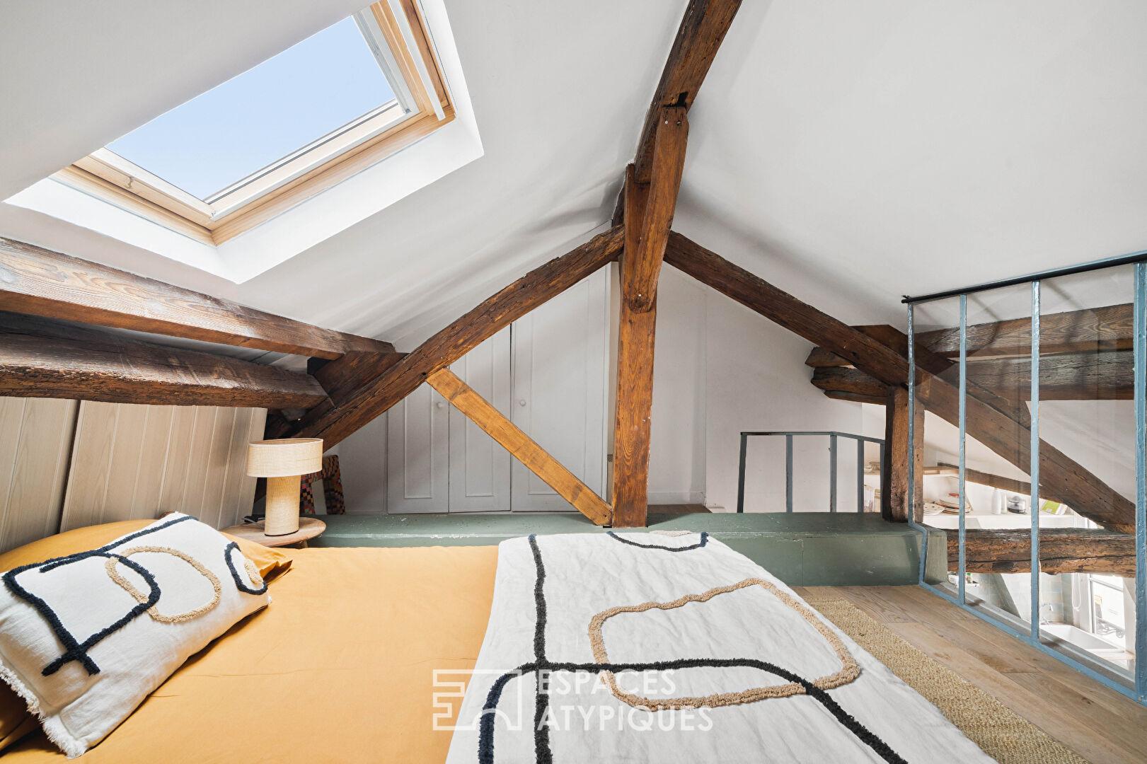 À l’étage, lové sous les mansardes, un second espace nuit avec dressing surplombe la pièce de vie. Cette configuration en mezzanine renforce l’esprit atelier et maison perchée, apportant une dimension unique à l’ensemble.