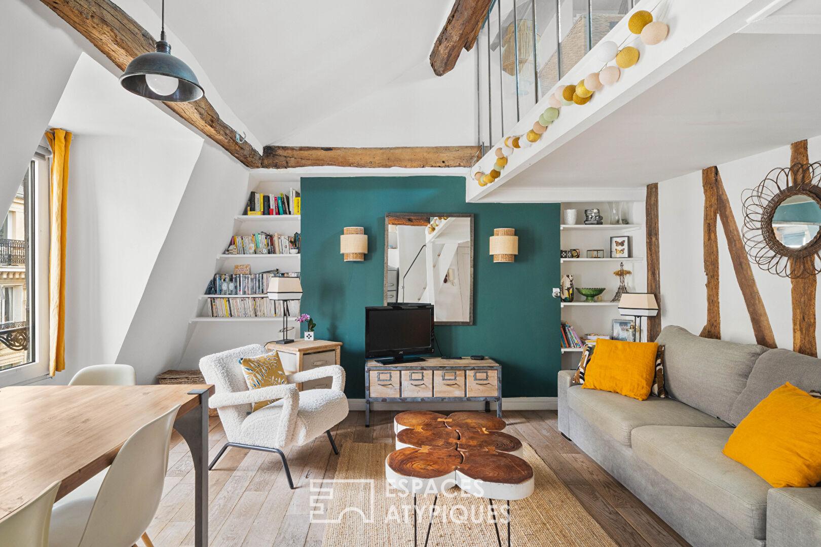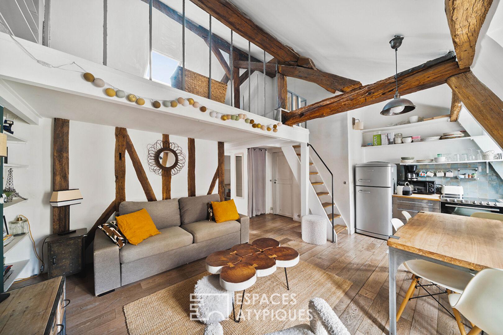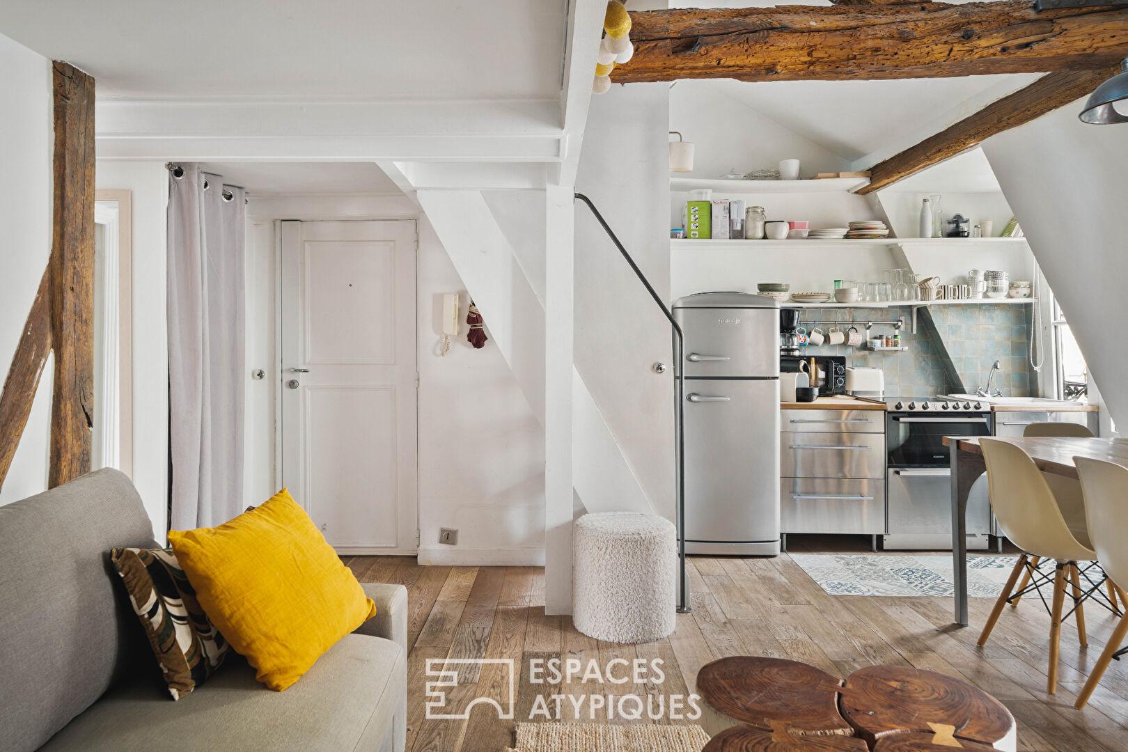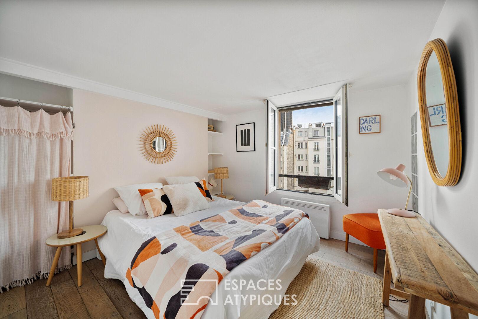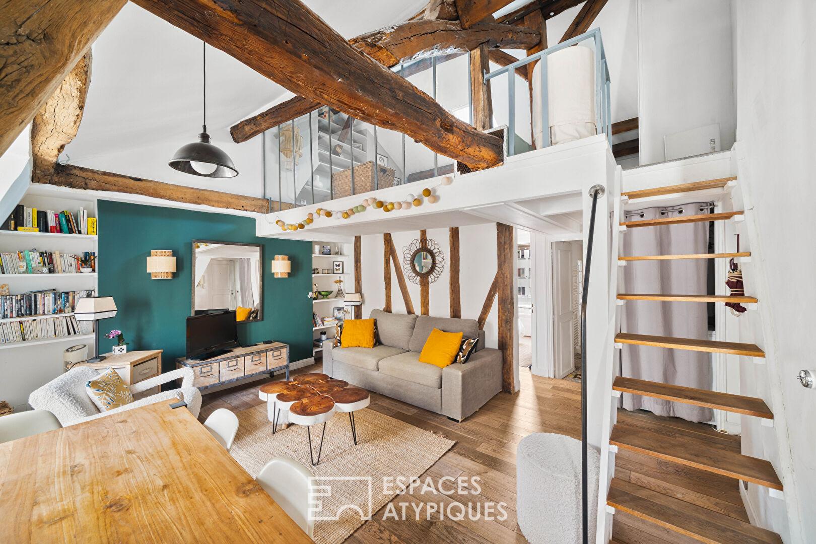 À l’étage, lové sous les mansardes, un second espace nuit avec dressing surplombe la pièce de vie. Cette configuration en mezzanine renforce l’esprit atelier et maison perchée, apportant une dimension unique à l’ensemble.