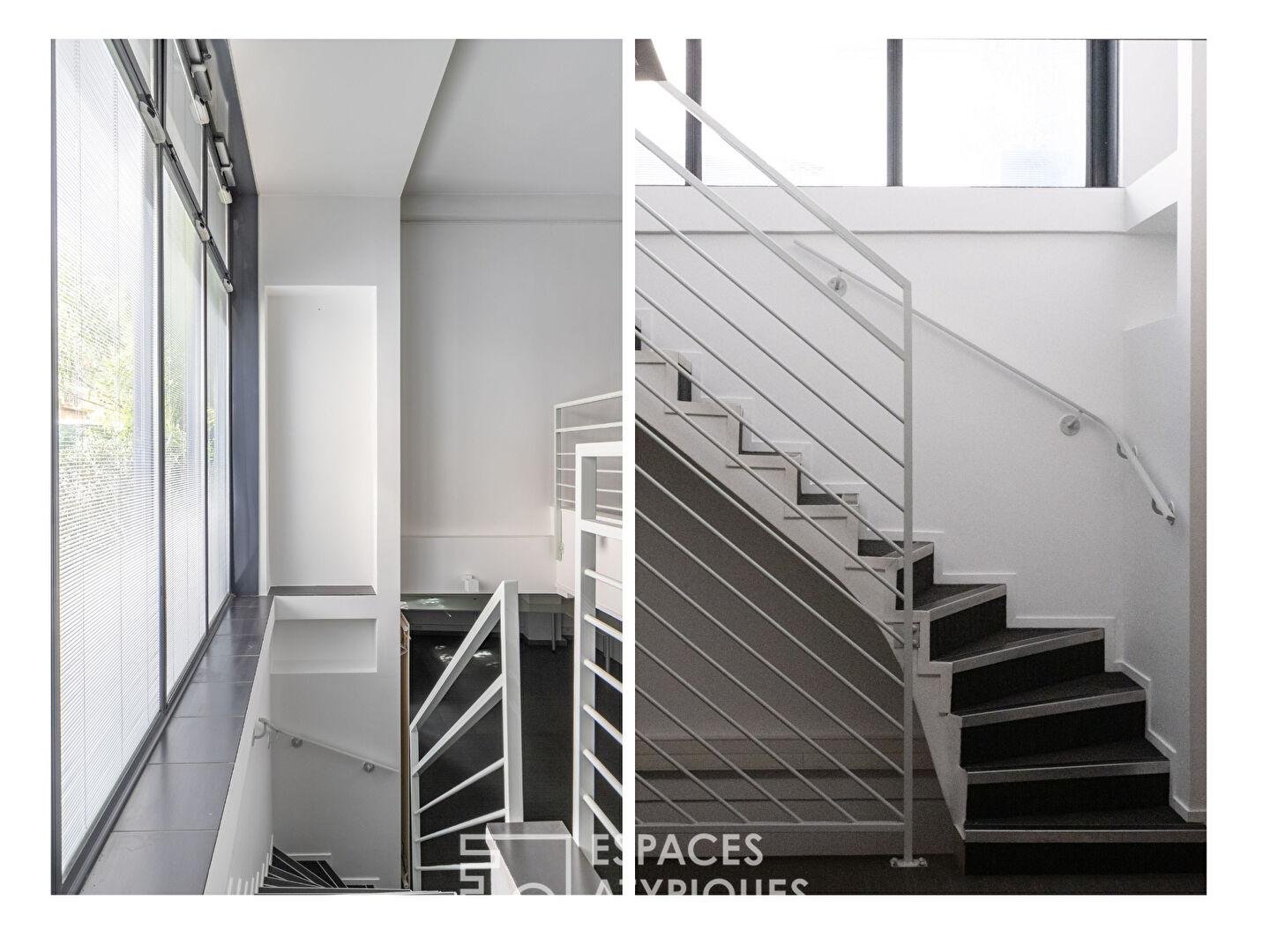 L’ensemble est aujourd’hui organisé en plateaux modulables avec une distribution fluide sur trois niveaux.