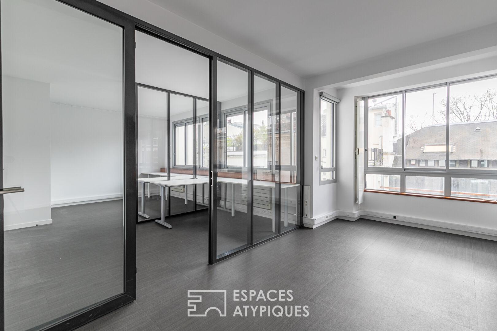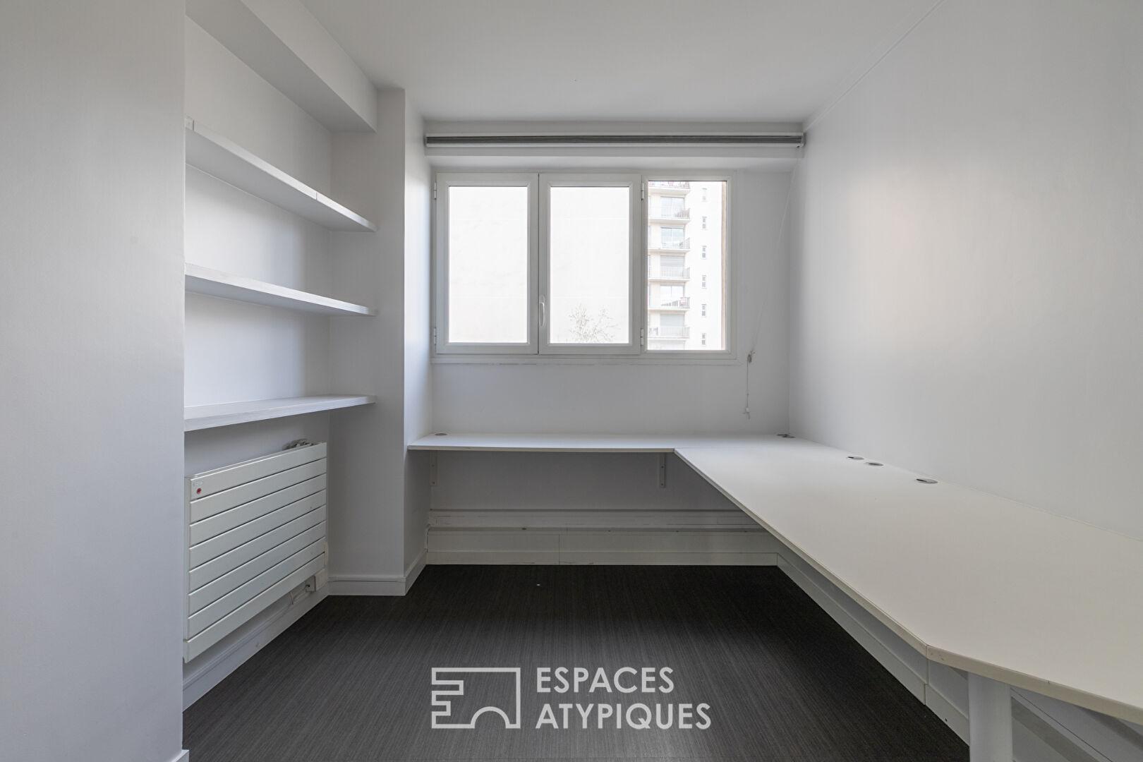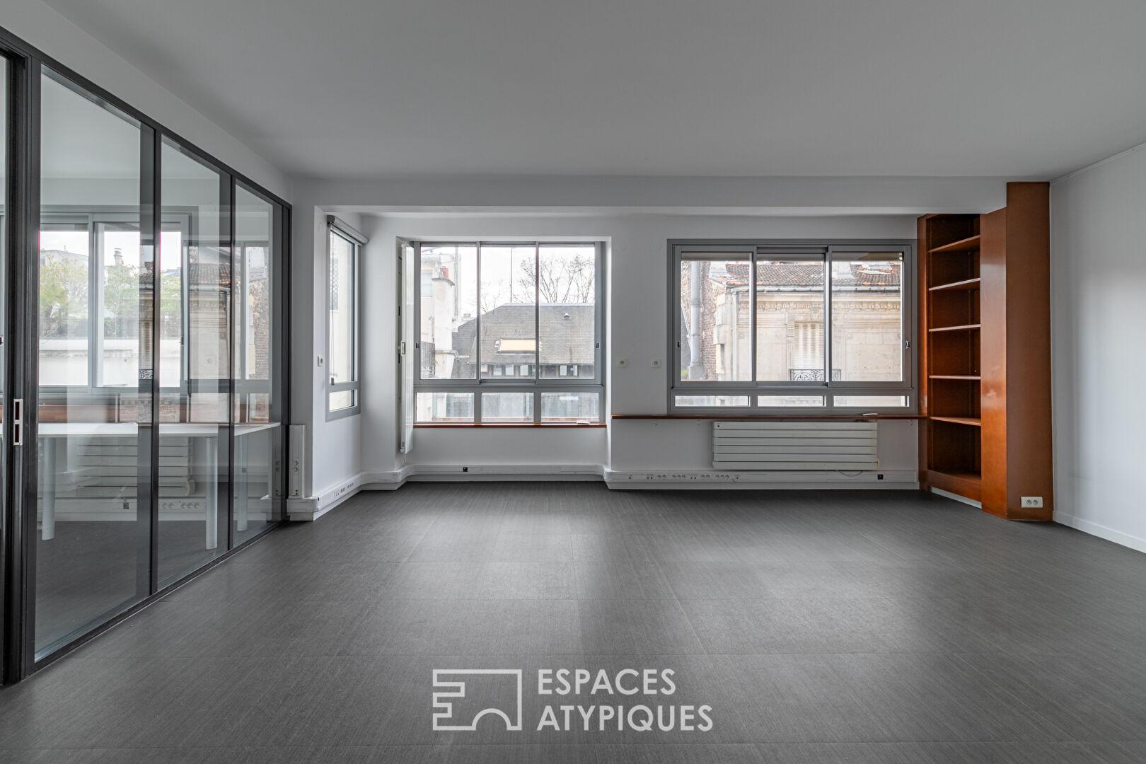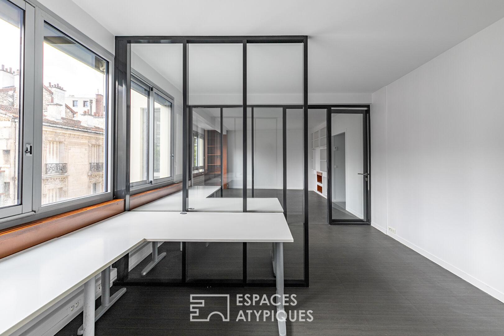 Anciennement occupé par un cabinet d’architectes, ce véritable plateau à réinventer est rythmé par des jeux de transparences et des verrières sombres qui structurent le volume sans cloisonner la lumière. Cette configuration « open space » invite à une liberté d’agencement absolue : une vaste réception peut y côtoyer des zones de travail ou de nuit, tout en profitant d’une luminosité constante offerte par de larges fenêtres coulissantes en aluminium.