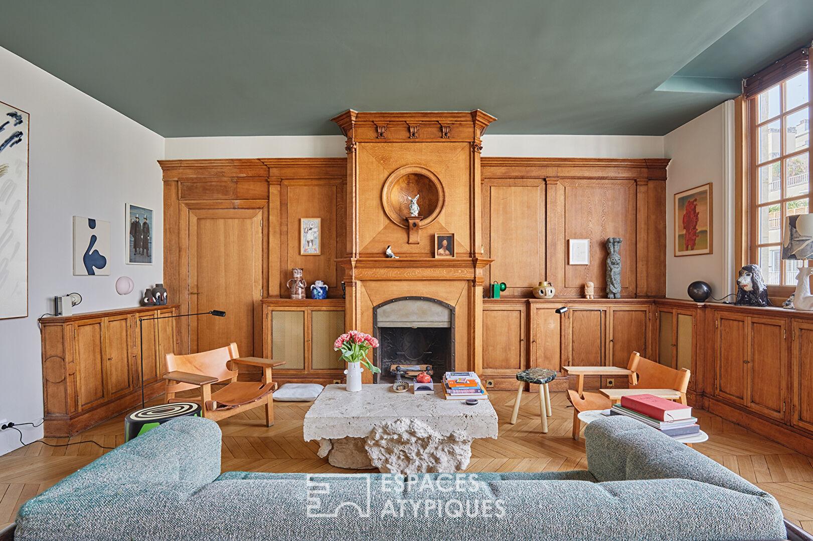 Le séjour traversant Nord-Ouest / Sud-Est, véritable coeur battant de l’appartement, se déploie sous une hauteur spectaculaire de plus de 5,5 mètres. Au sol, un parquet en chêne massif aux lattes larges déploie une patine dorée qui répond à la clarté.