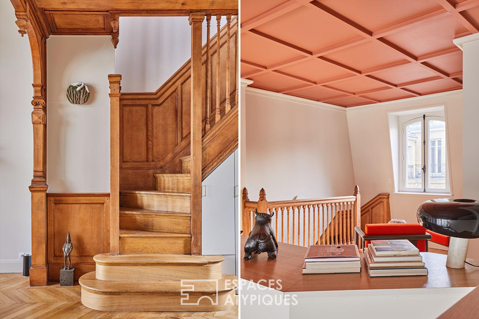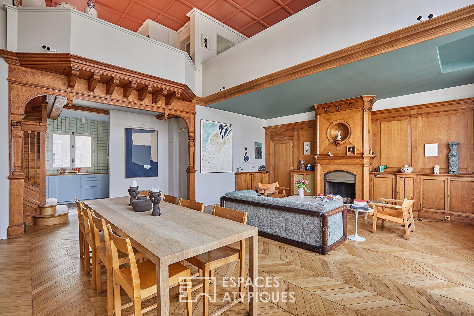 À seulement quelques pas du prestigieux Parc Monceau, cet ancien atelier d’artiste de 92,01 m² (89,40 m² Carrez) avec balcon-terrasse de 9,26 m² se niche au cinquième dernier étage par ascenseur d’un immeuble d’ateliers édifié en 1893.