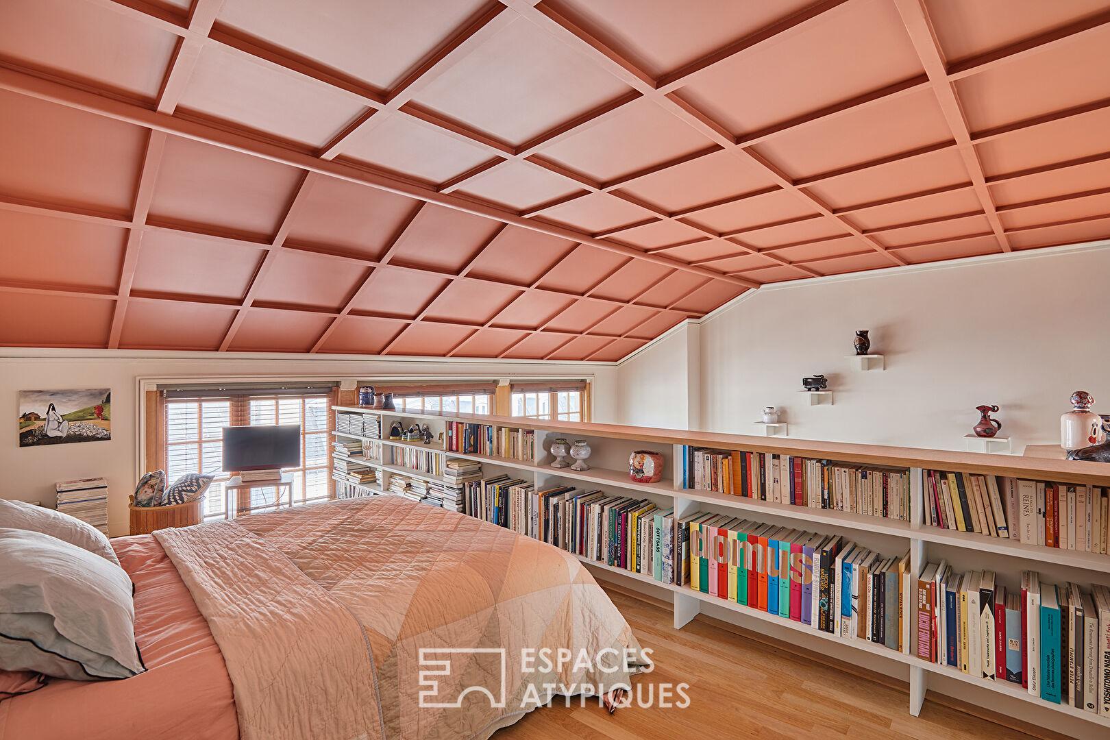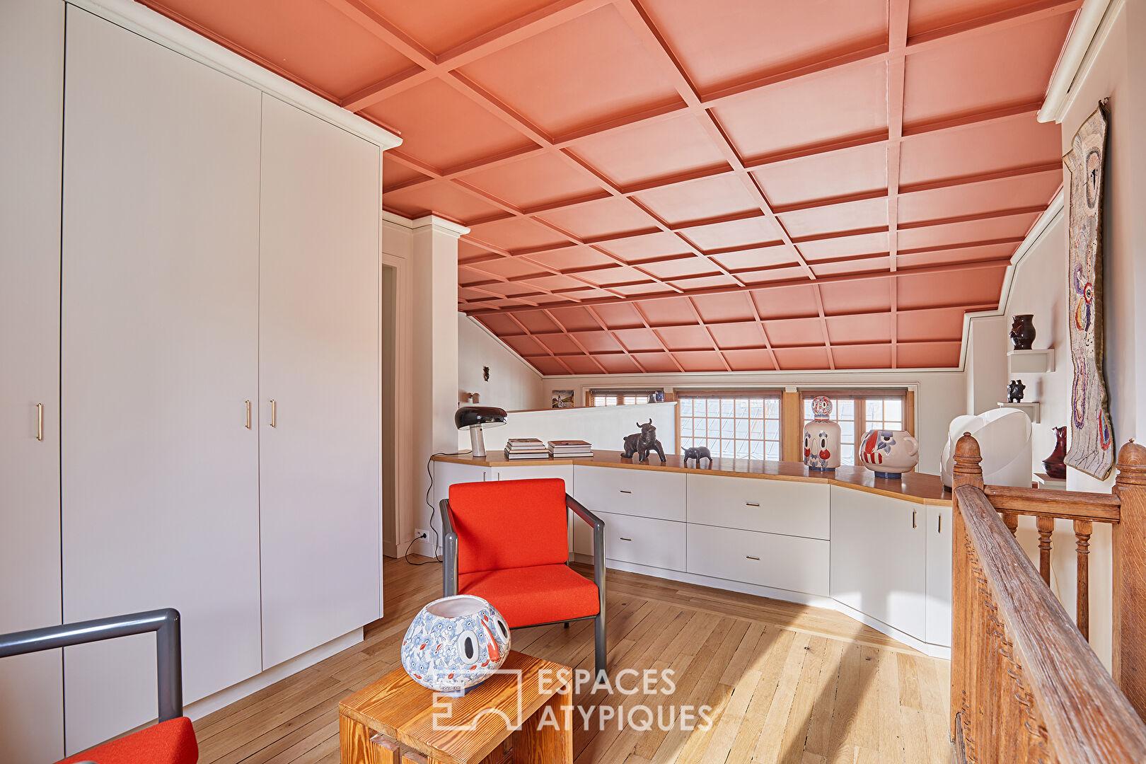 L’ascension vers l’intimité se fait par un escalier conçu telle une sculpture de bois. Il mène à l’étage qui accueille aujourd’hui un bureau et un dressing aux rangements sur mesure en chêne clair, prélude à une vaste chambre aérée et tamisée. La salle de douche attenante se pare de zelliges artisanaux et d’une robinetterie en laiton brossé, offrant un jeu de textures organiques et minérales.
